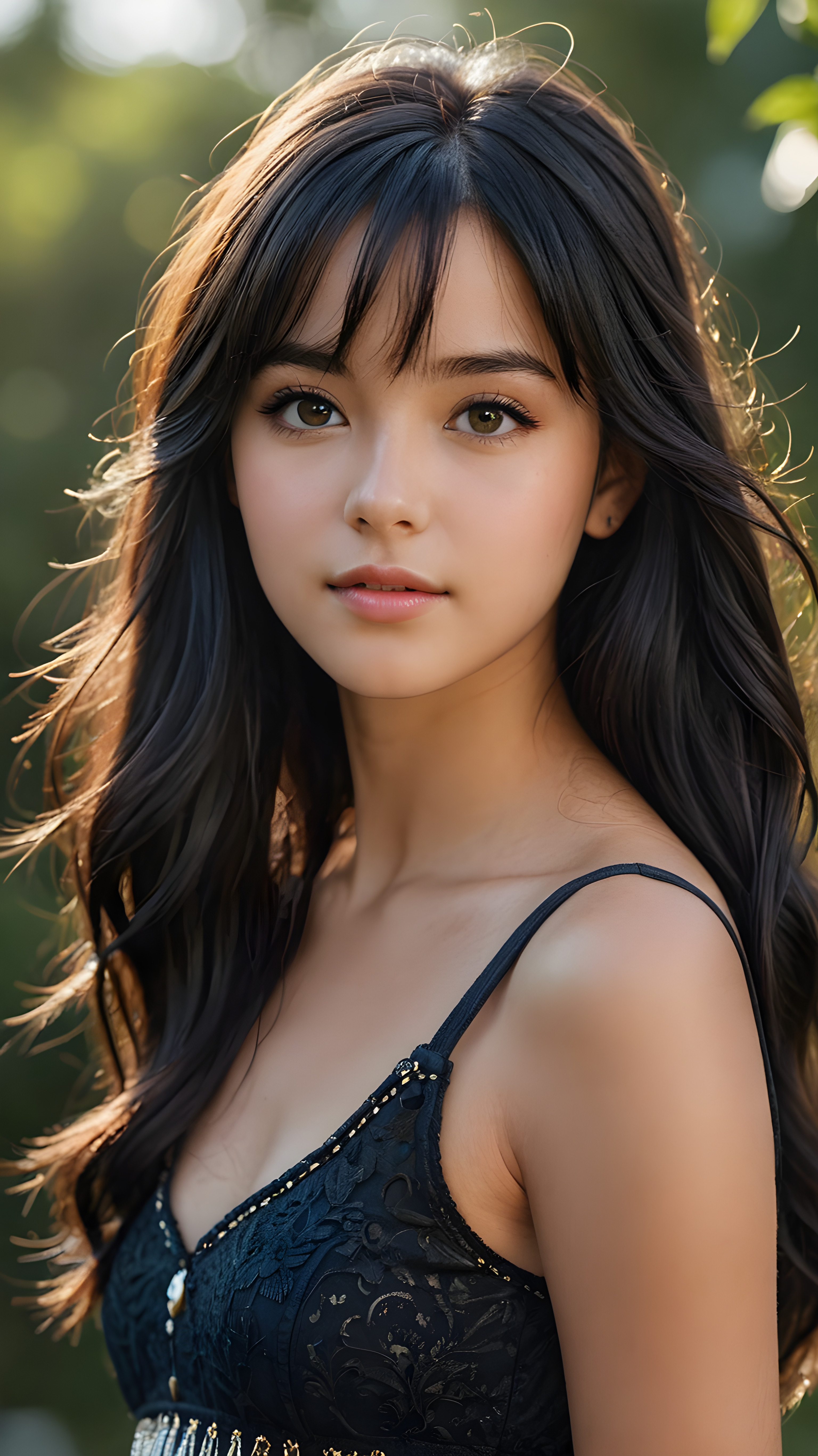 a (((masterpiece of photography))), ultra high resolution and straight, long black hair with fringes slightly curled, showcasing an incredibly beautiful teen girl with (realistically detailed, soft light backlit) surroundings that bring out her (exquisite features) and the (intricate details of her skin) in a (highly detailed, 8K frame) that draws the eye and exudes confidence and allure, she wears a short, cropped tank top, perfect body