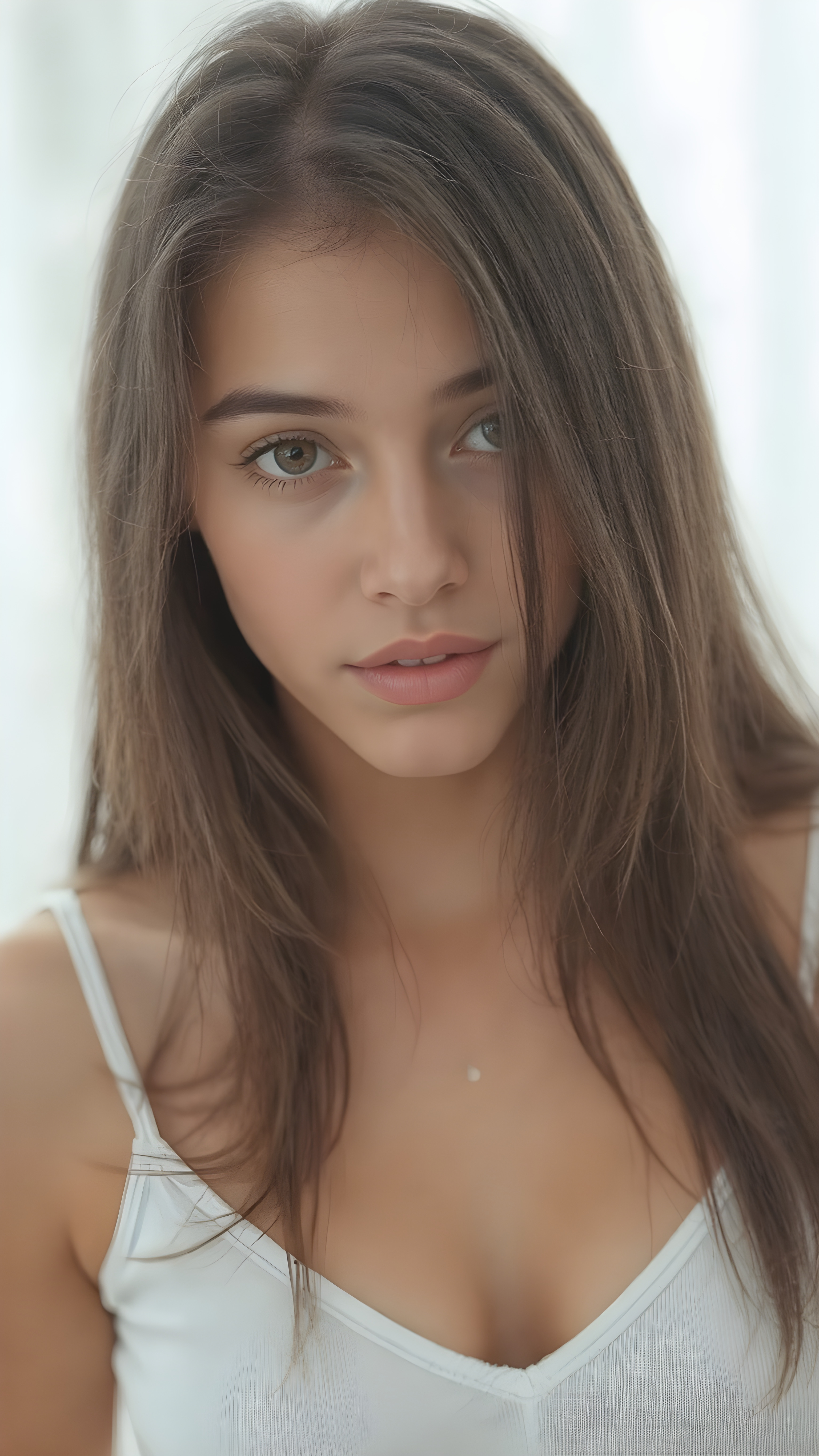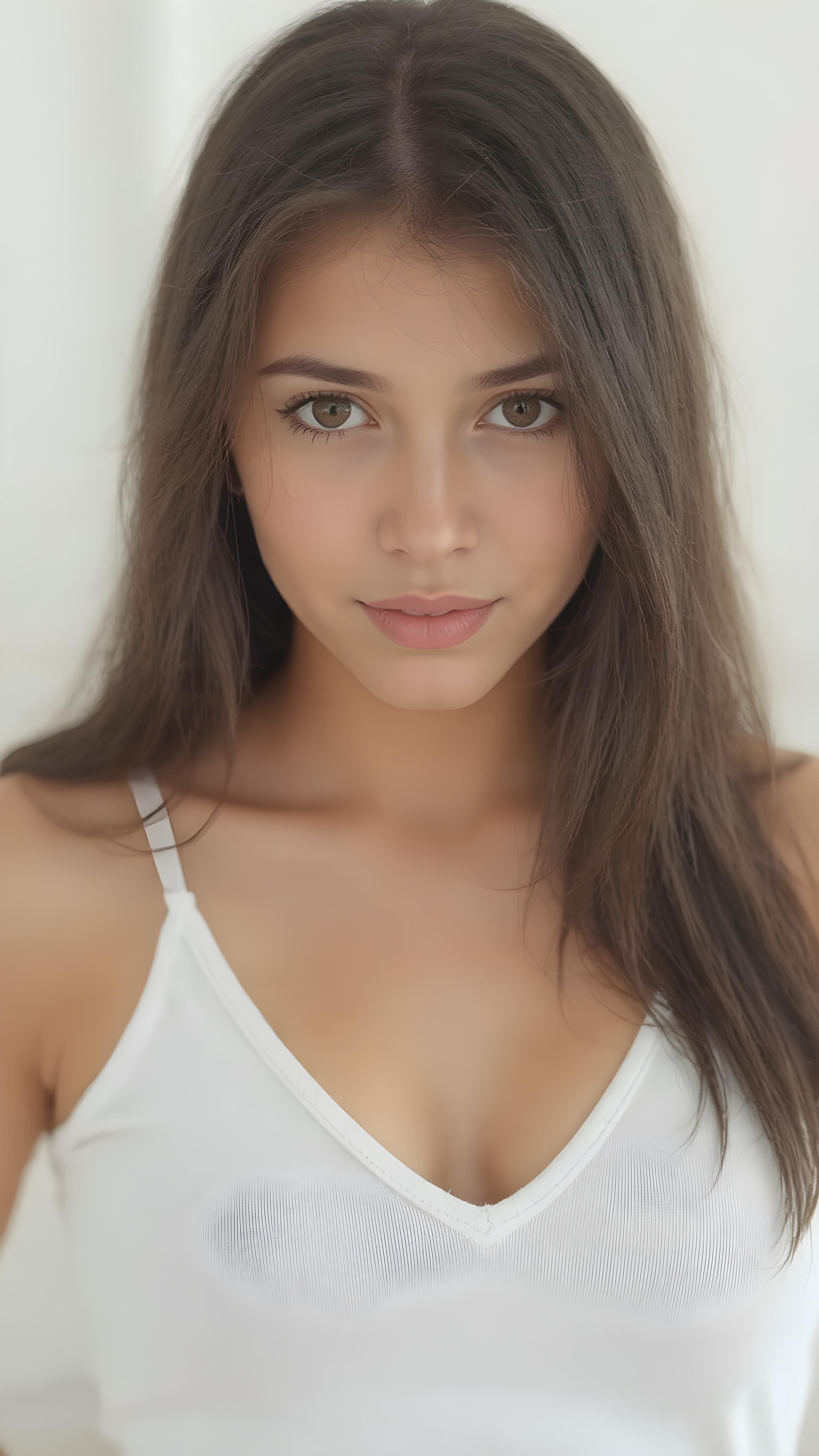 a realistic, Asian teen girl, 13 years old, long straight soft jet hair, bangs cut, perfect curved body, (wears a super short tight (white crop tank top)), perfect anatomy, grey background, side perspective ((realistic)) ((stunning)) ((gorgeous)) ((hight resolution)), upper body 1:3