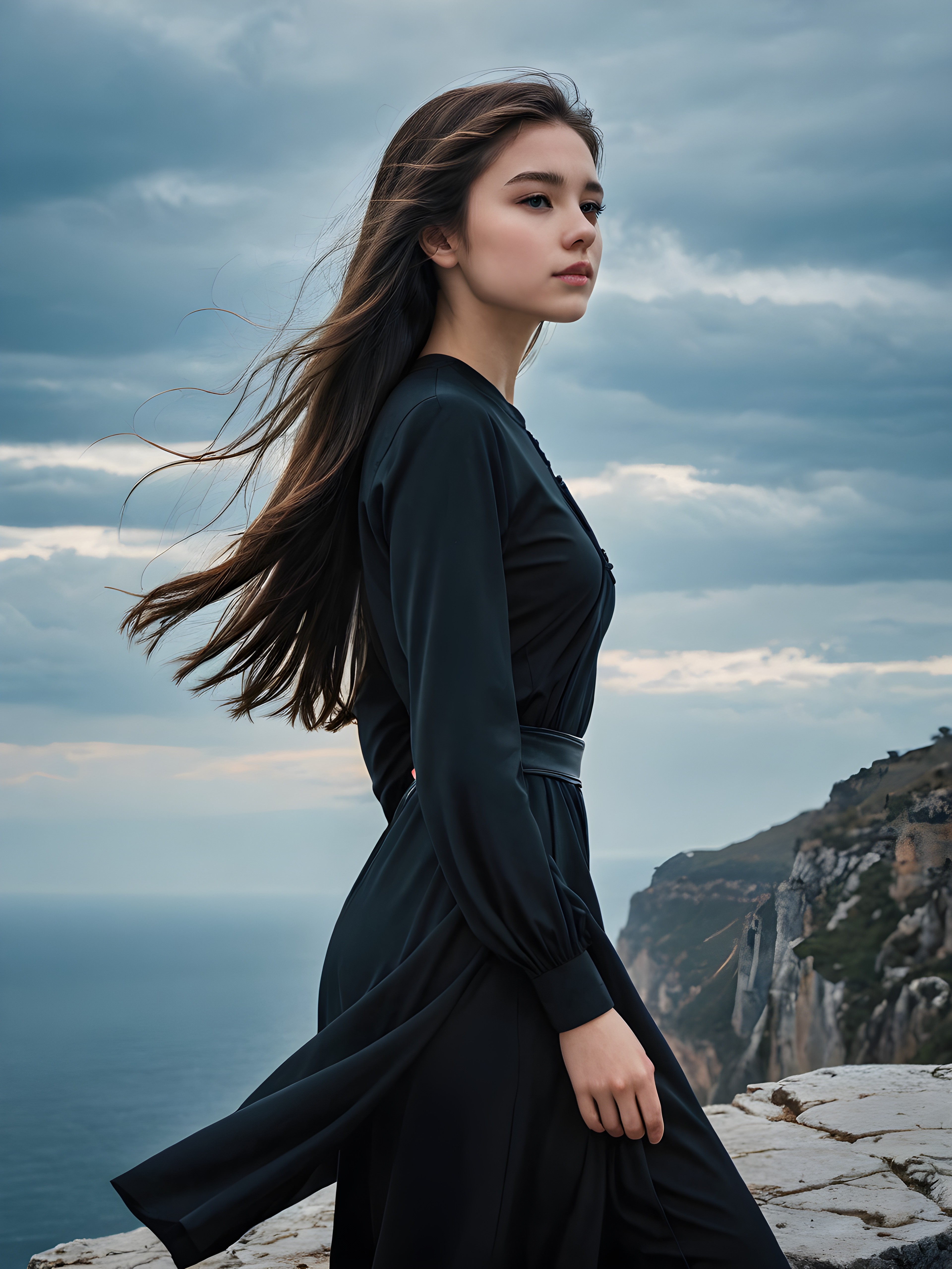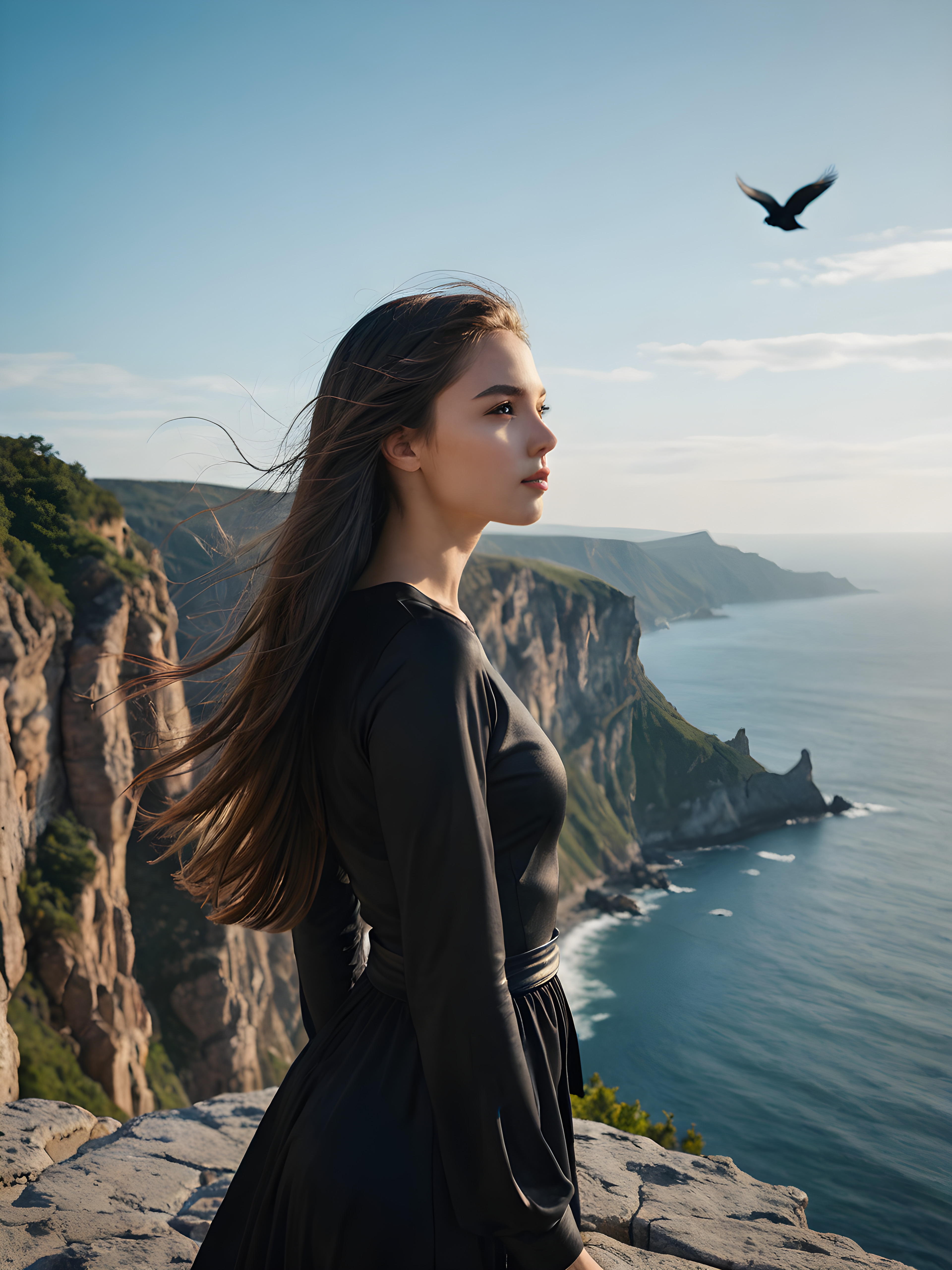 a (((young, beautiful teen girl))), dressed in sleek, ((black clothes)), standing confidently on a (ominous, dark cliff), with her luxurious, (full hair) flowing gently in the wind around her, reflecting the (serene, distant landscape) below. Her features are (exquisite), as if captured by a master artist, and her figure is (flawless). Distant birds dot the (clear, blue sky) above, adding a touch of serendipity to this (powerful moment).