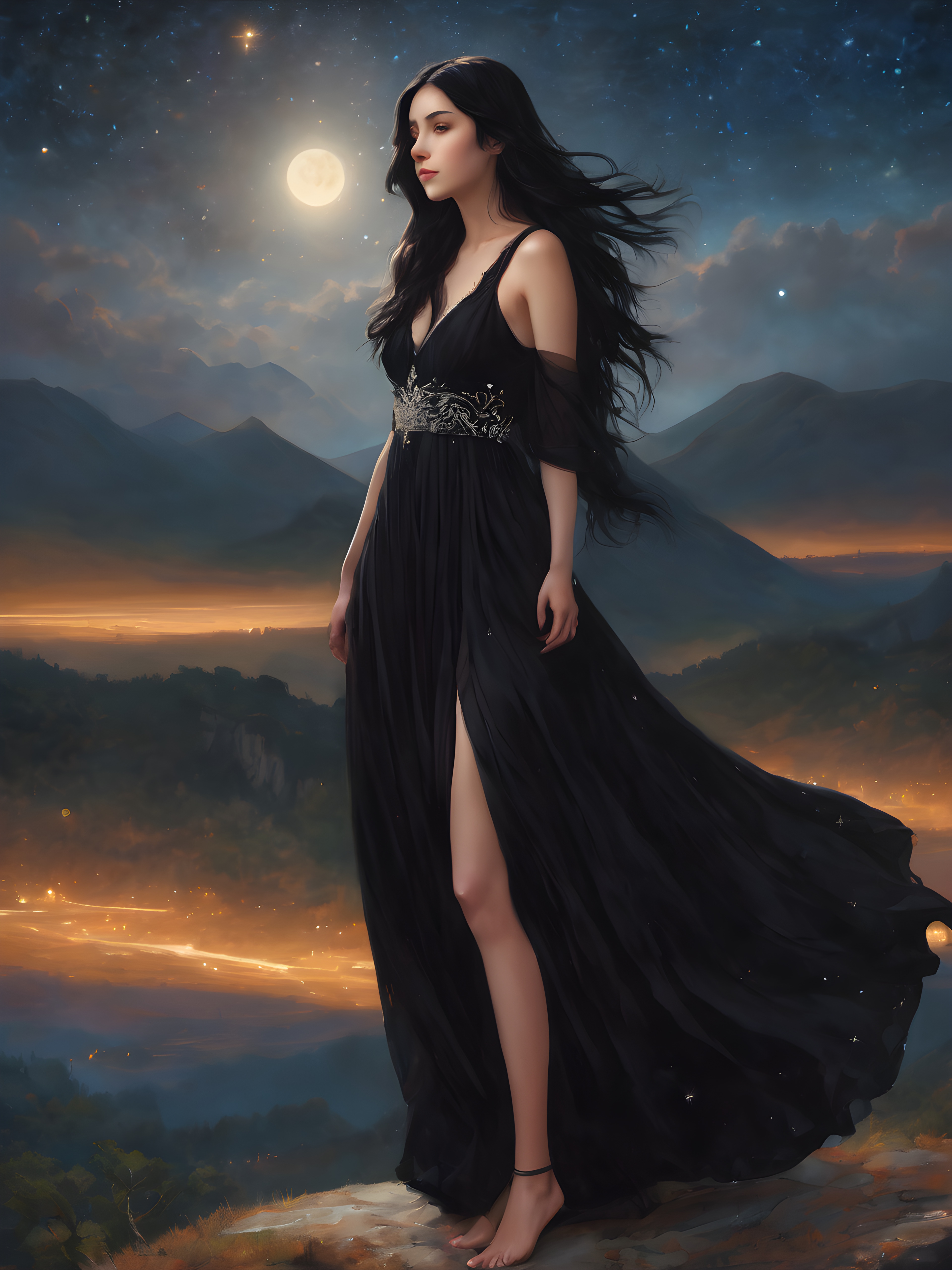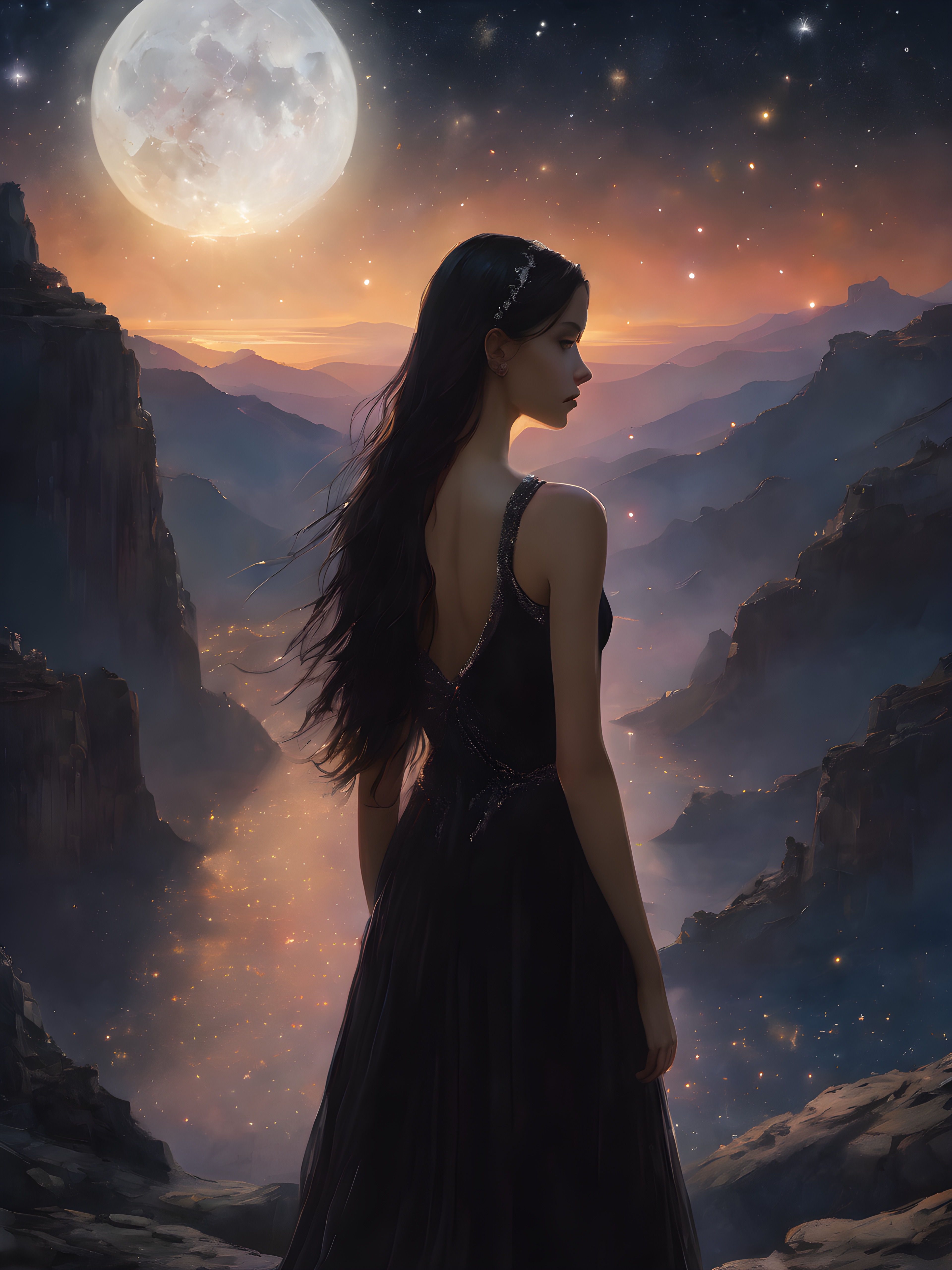 a (((young teen girl with long, flowing black hair))), dressed in a (((black dress with shimmering silver accents))), standing still as she takes in a (((night sky alive with twinkling stars))), her expression a mix of tranquility and introspection, as if lost in reverie, perched atop a (massive, jagged rock formation) under a (vast, glowing crescent moon).