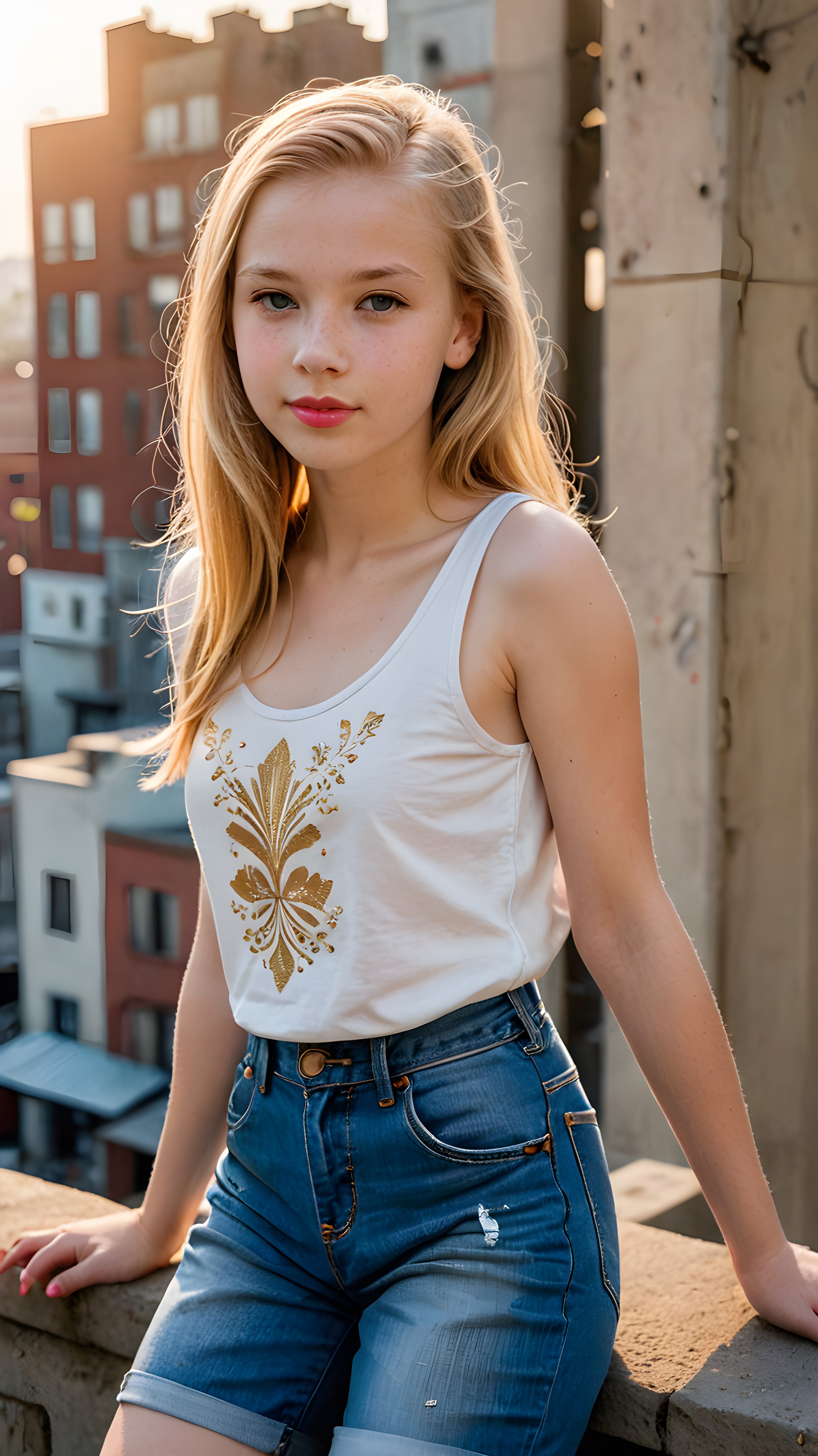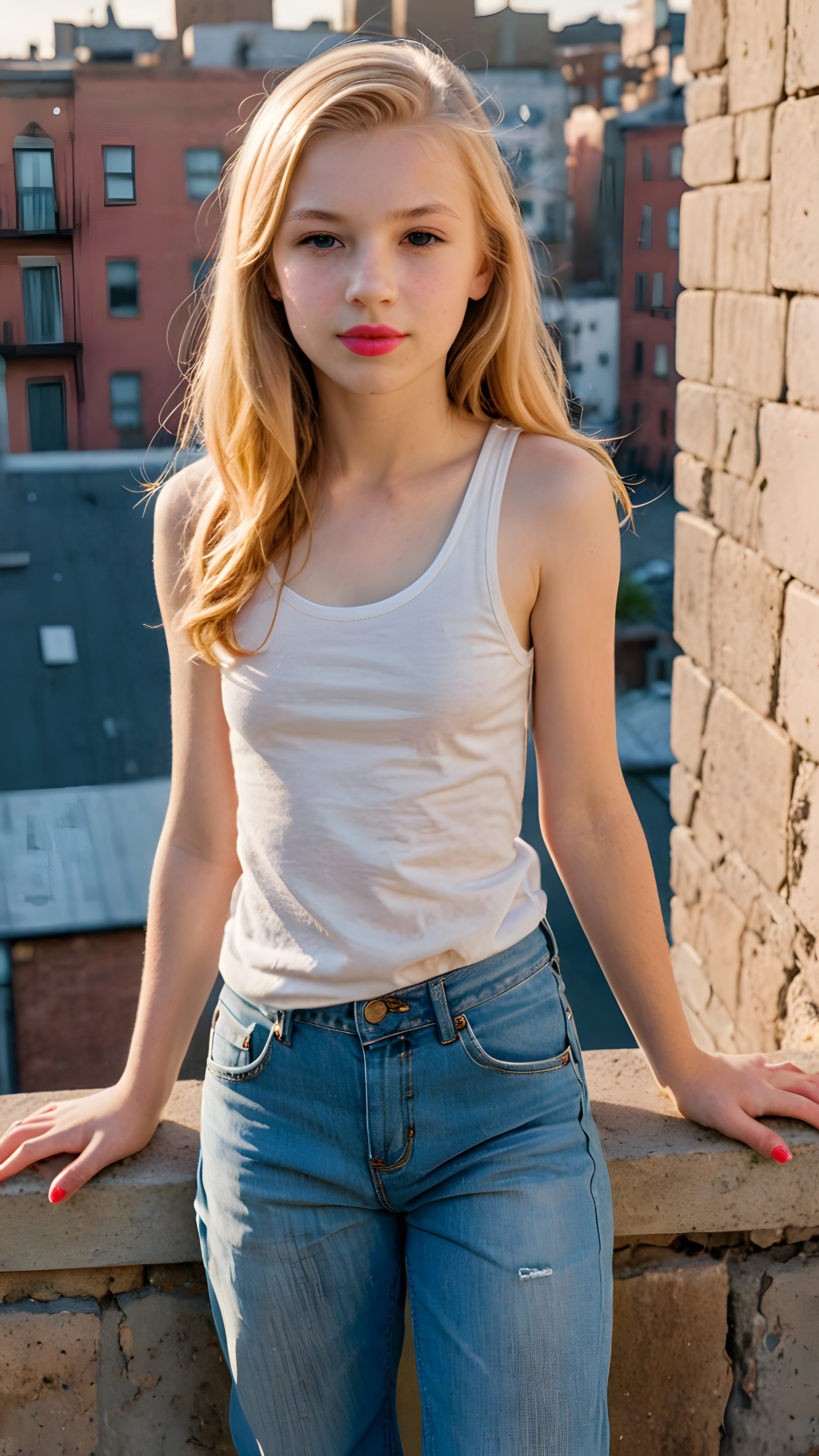 a (((11-year-old girl))) with luxuriously long, (((straight gold hair))), flawlessly pale skin, and (((pink lips))), dressed in a (((low-cut, short white tank top))), paired with (((short denim jeans))), waiting confidently on a (((building ledge))), surrounded by a (((vividly detailed, 1940s-inspired backdrop))) with warm, (((sunset tones))) gently illuminating her scene