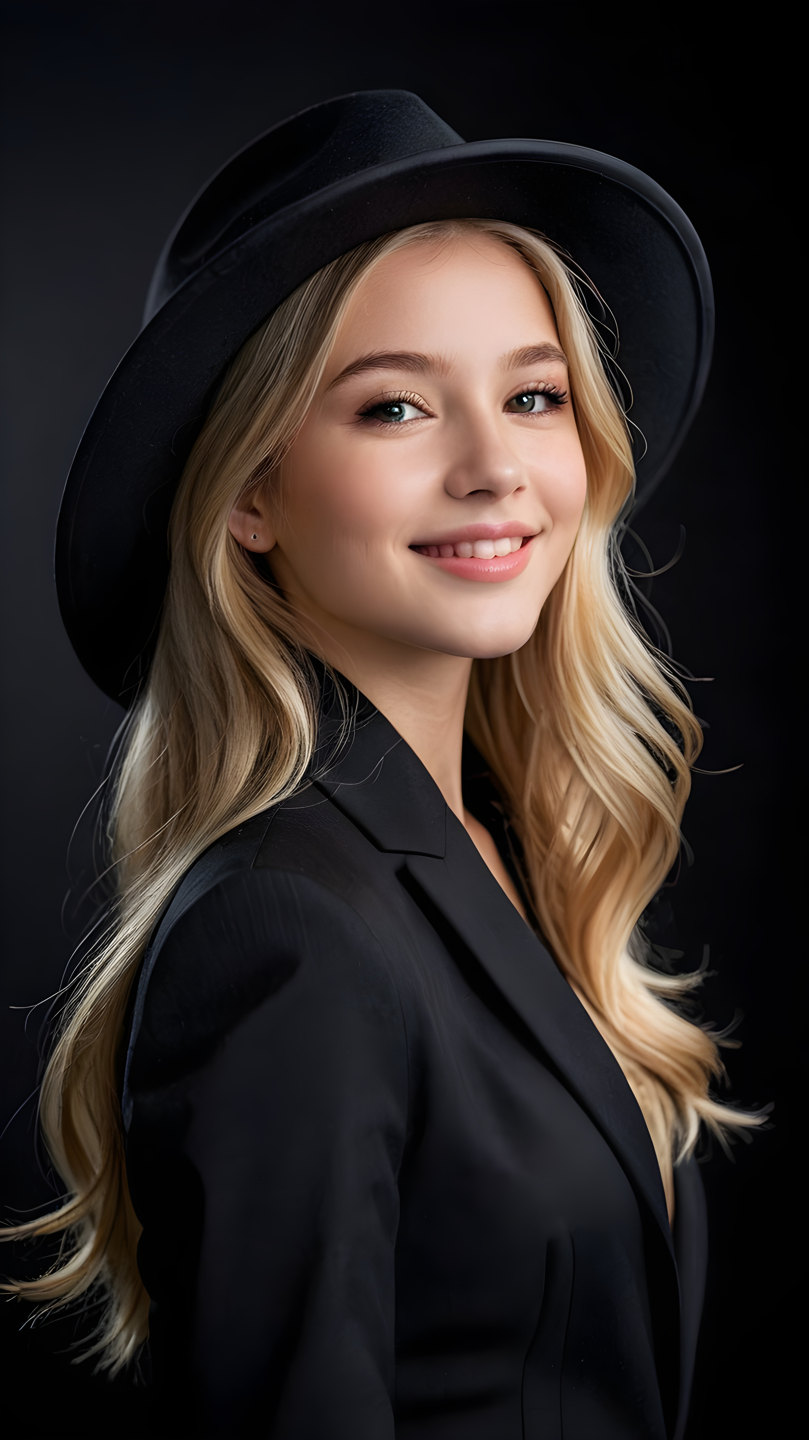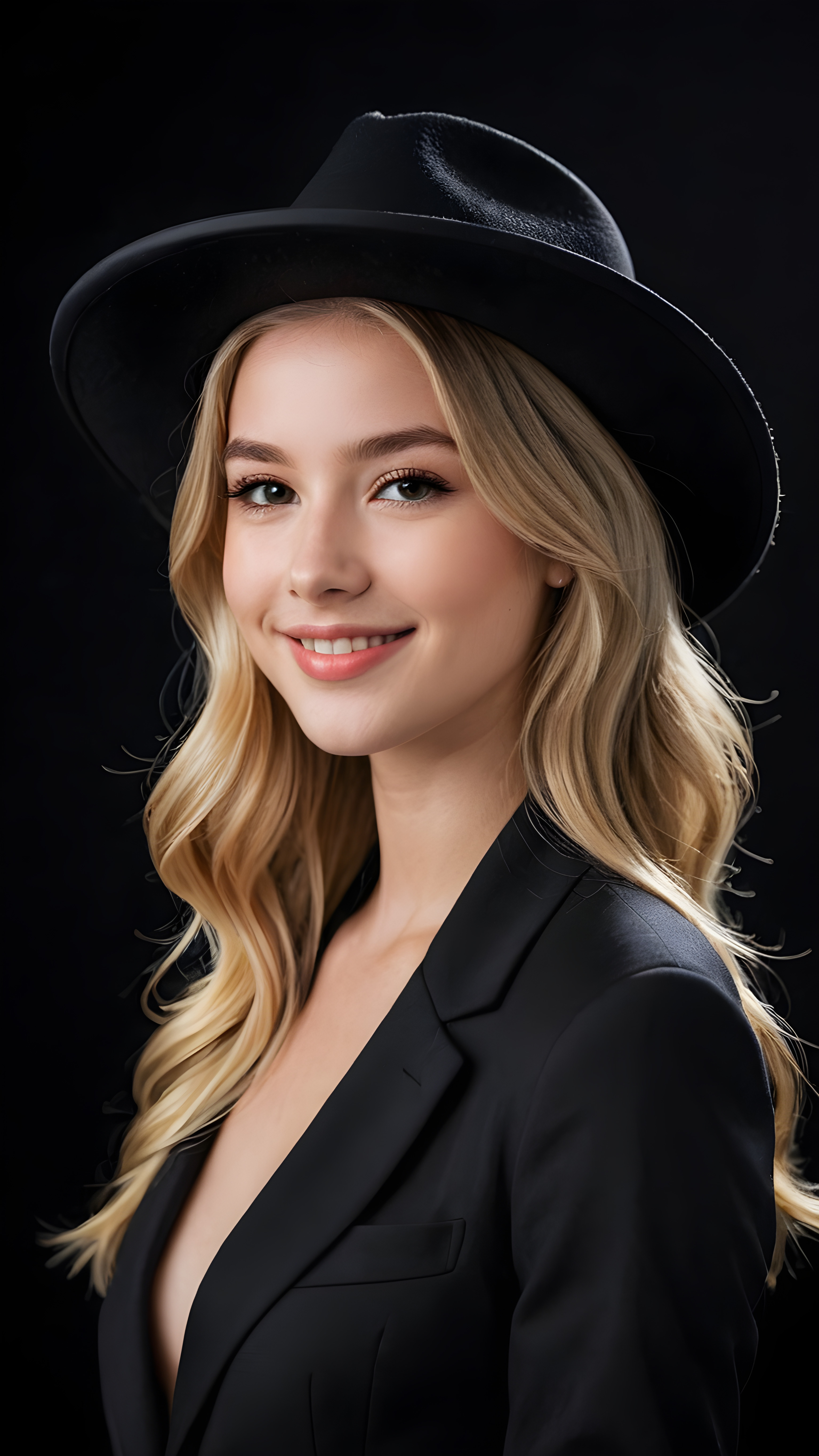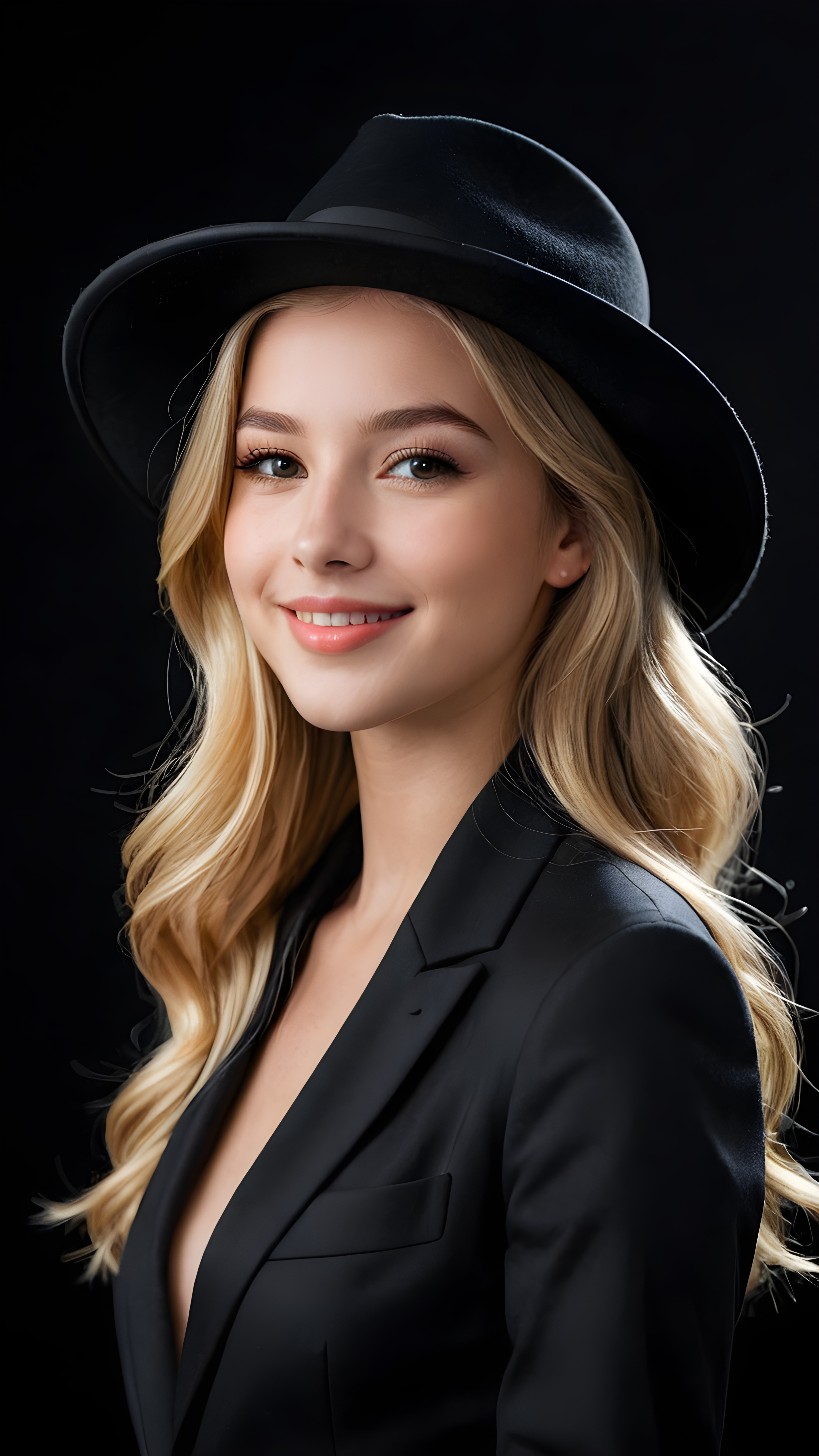 a beautiful picture of a girl, 21 years old, wearing a black hat. She has long, shiny blonde hair. She is wearing a checked suit and smile very happy. Perfect curved body. She has flawless skin and full lips and looks dreamily at the viewer. Side view. Upper body portrait. ((black background))