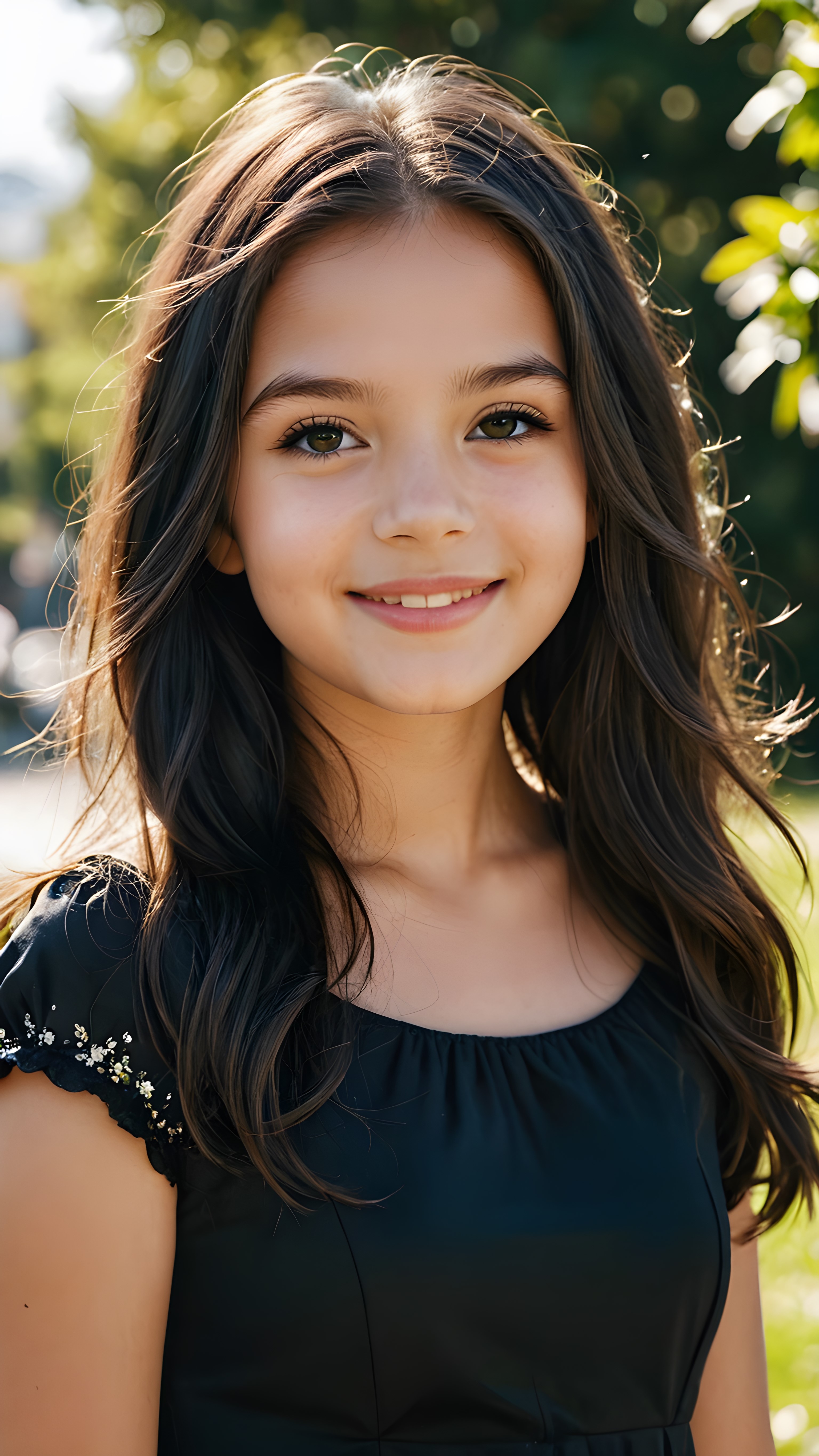 a young, beautiful girl of 9 years, black dressed, full, shiny hair. Her white, flawless skin shimmers slightly. Full lips. Perfect body. She smiles. ((detailed perfect photo)) ((stunning)) ((gorgeous)) ((cute)) ((against a sunny backdrop))