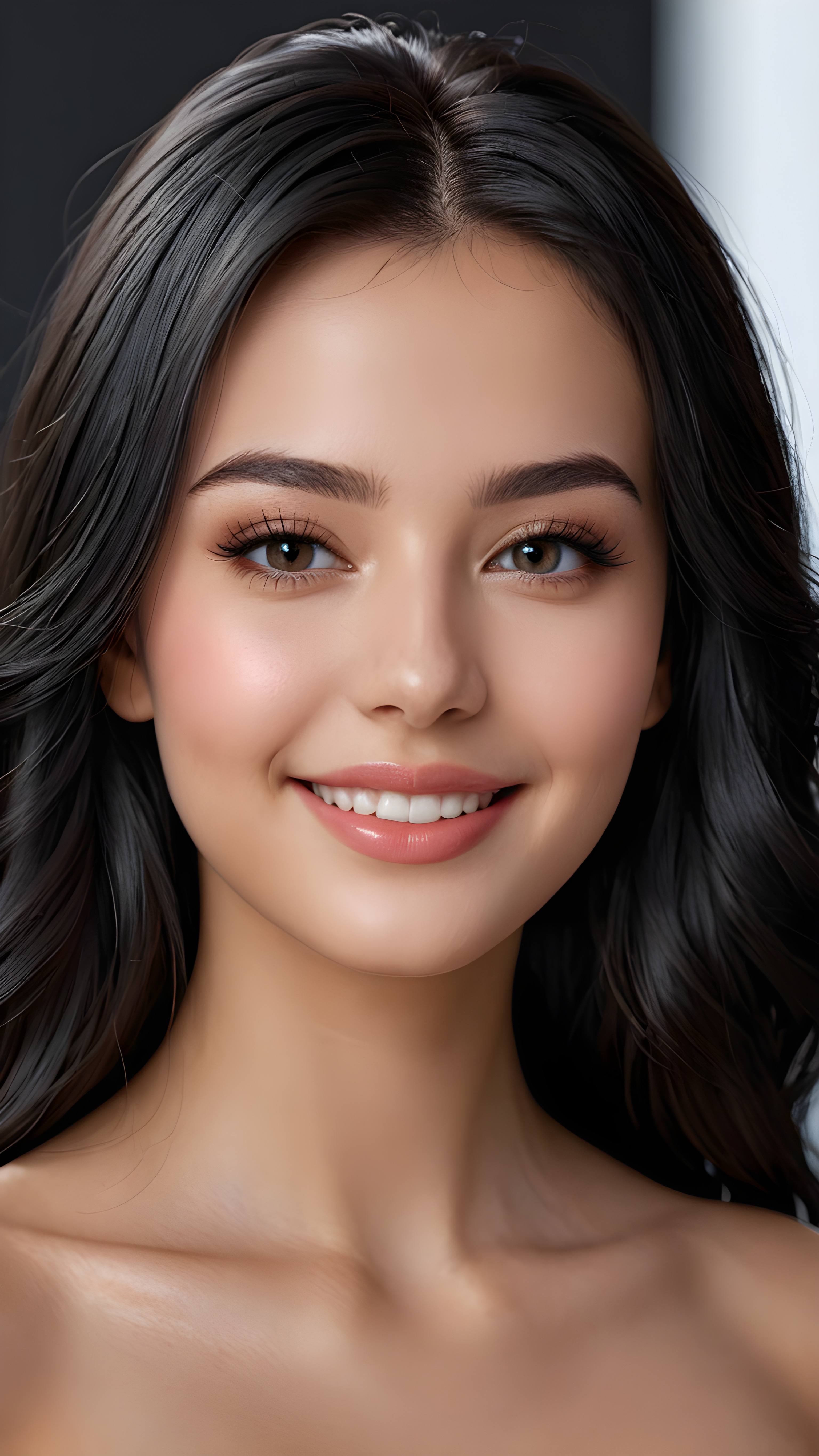 a young, beautiful girl of 17 years. She has black dressed, full, shiny hair. Her white, flawless skin shimmers slightly. Full lips. Perfect body. She smiles.