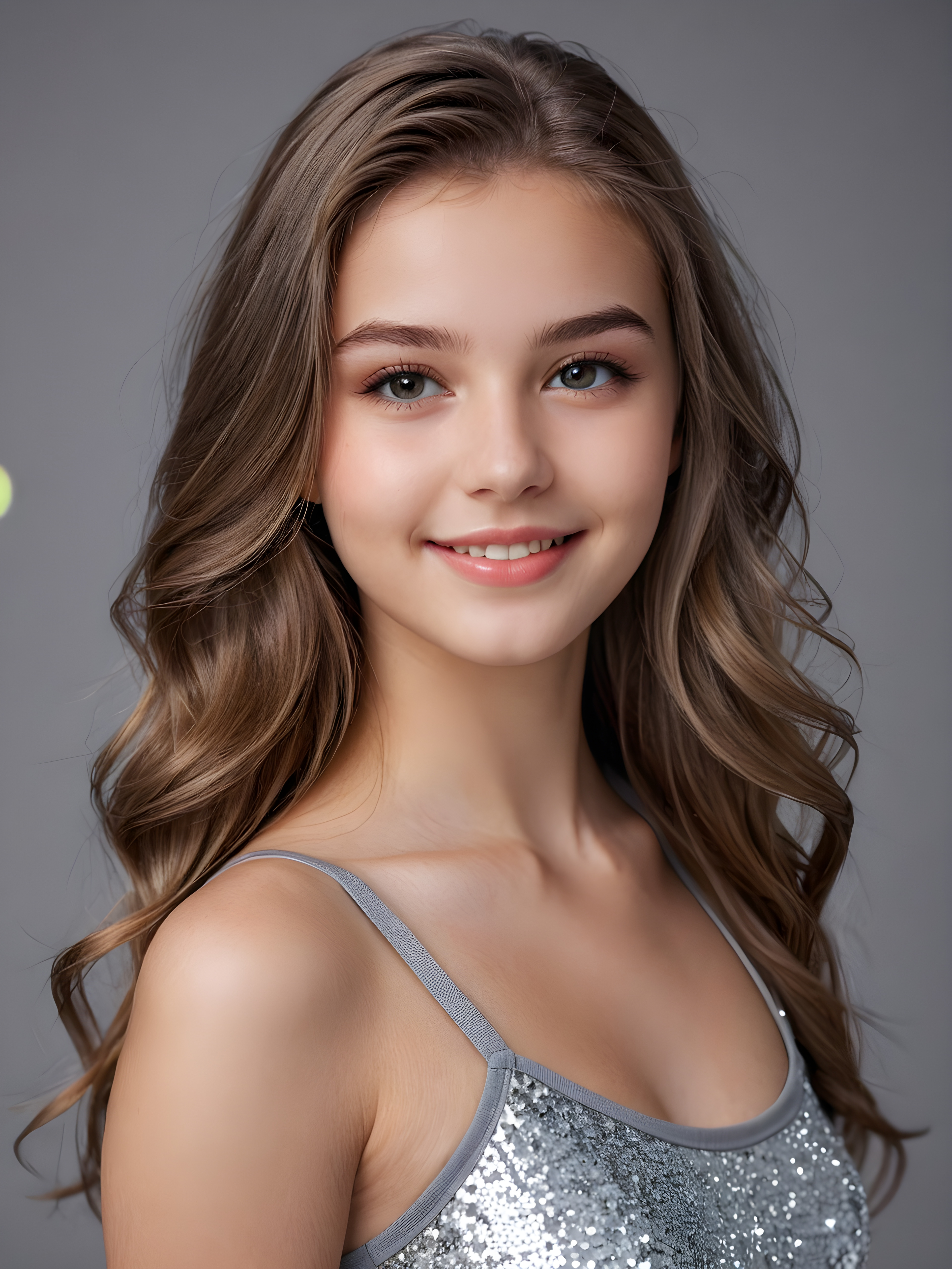 a young, beautiful and breathtaking teen girl. She has a full head of shiny hair. Her white, flawless skin shimmers slightly. Full lips. Perfect body. She smiles and wears a thin crop top ((detailed perfect photo)) ((stunning)) ((gorgeous)) ((cute)) ((grey background))