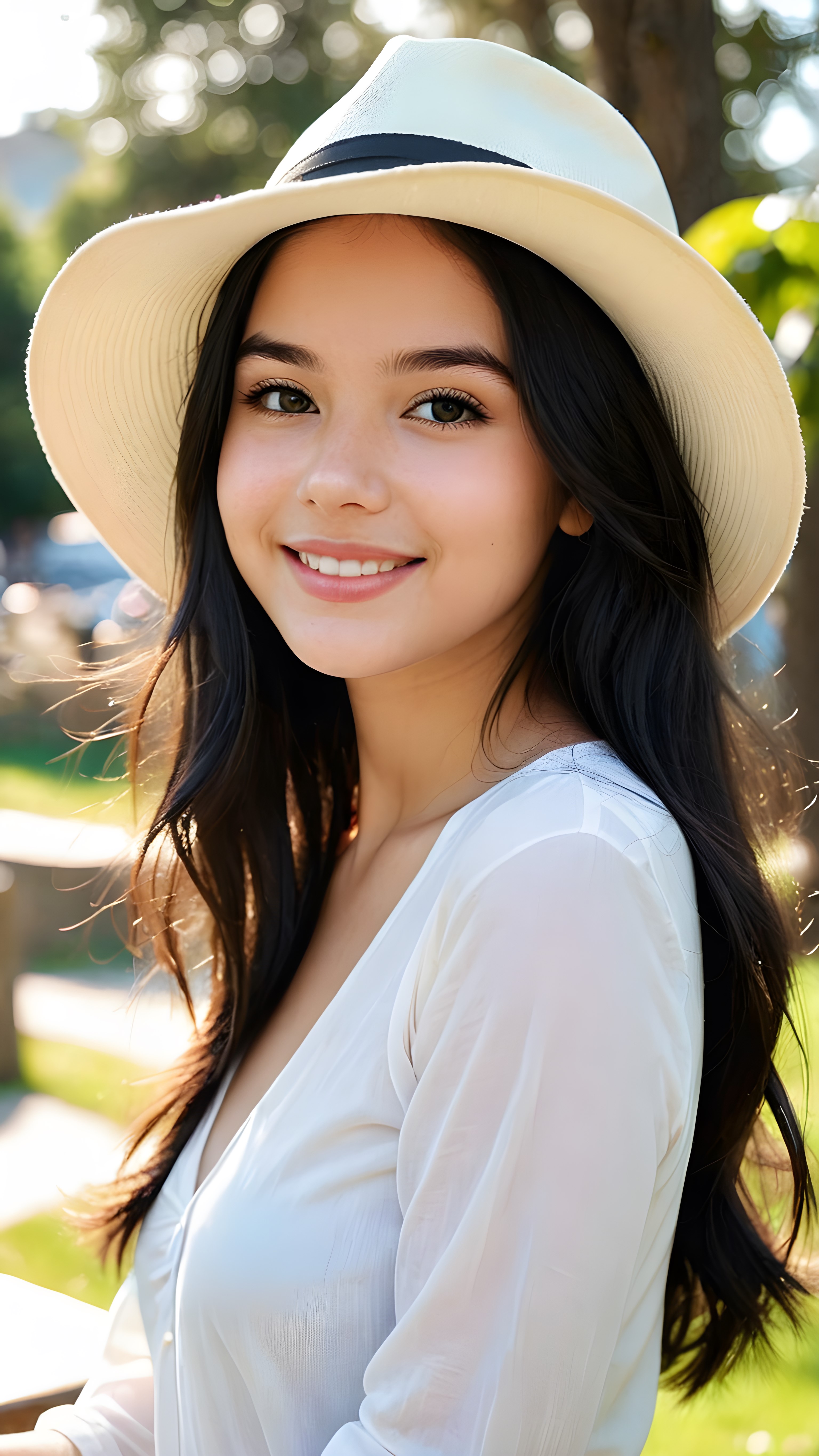 a young, beautiful teen girl. She has black, full, shiny hair. She is wearing a white hat. Her white, flawless skin shimmers slightly. Full lips. Perfect body. She smiles. ((detailed perfect photo)) ((stunning)) ((gorgeous)) ((cute))