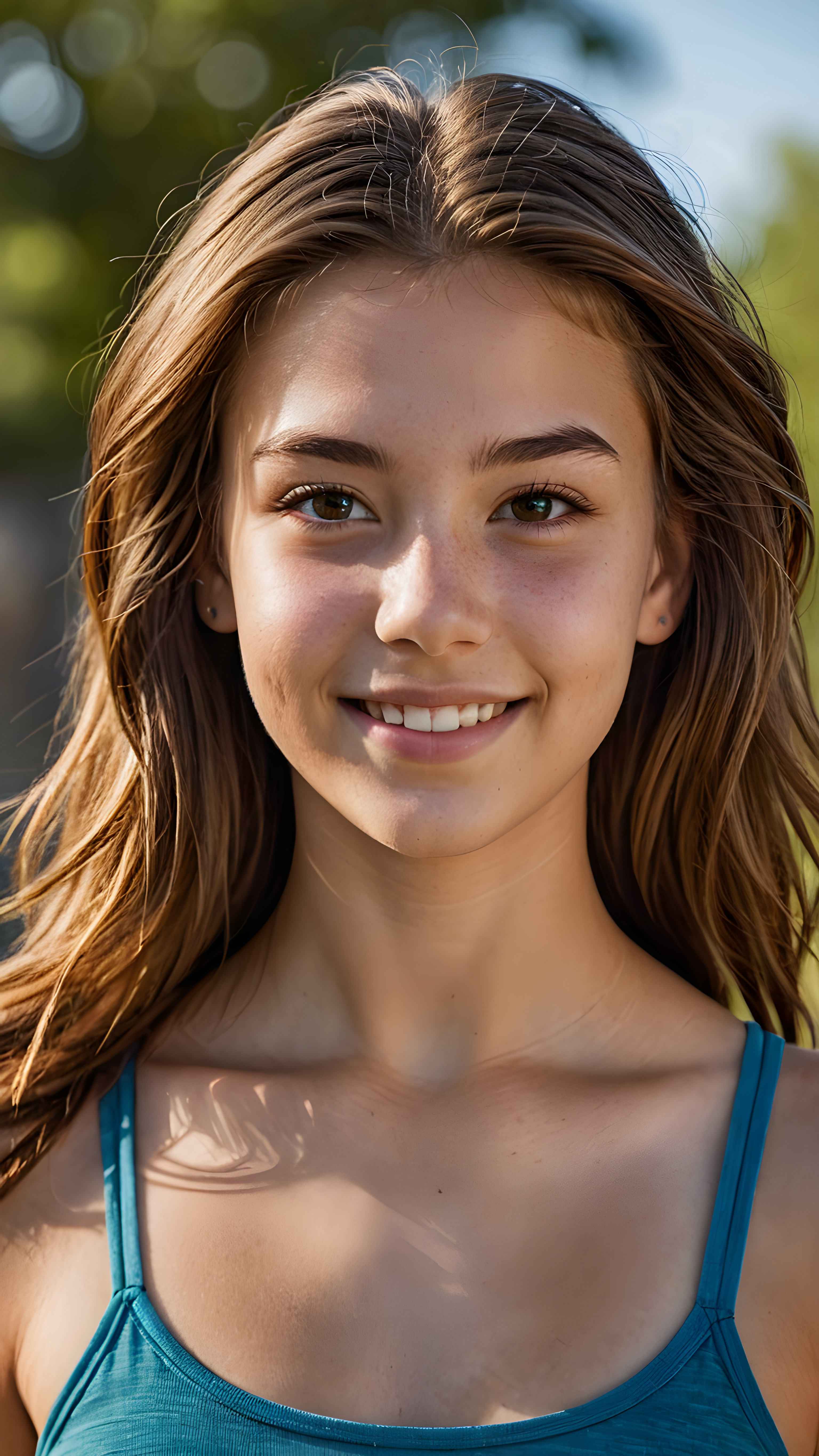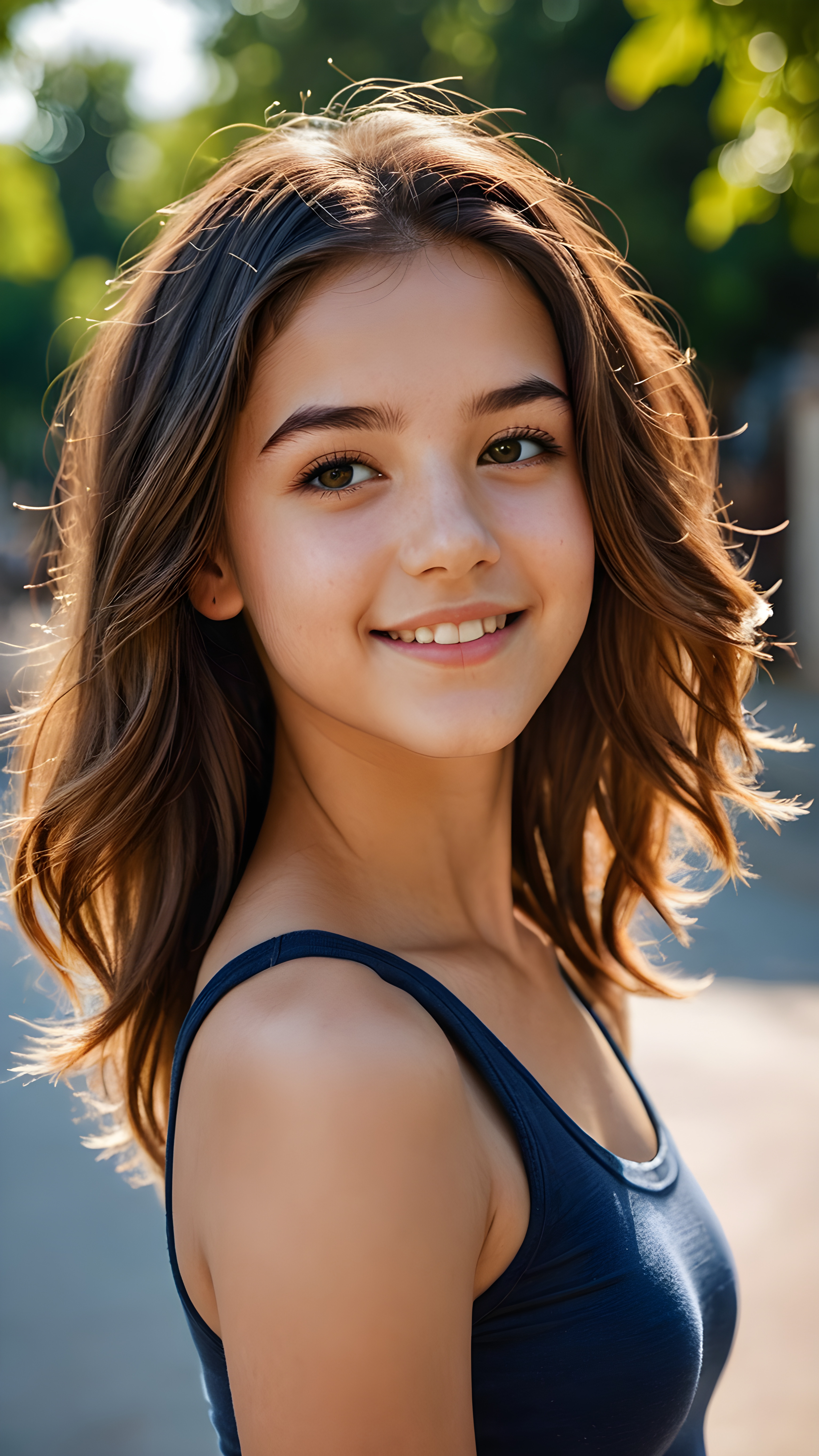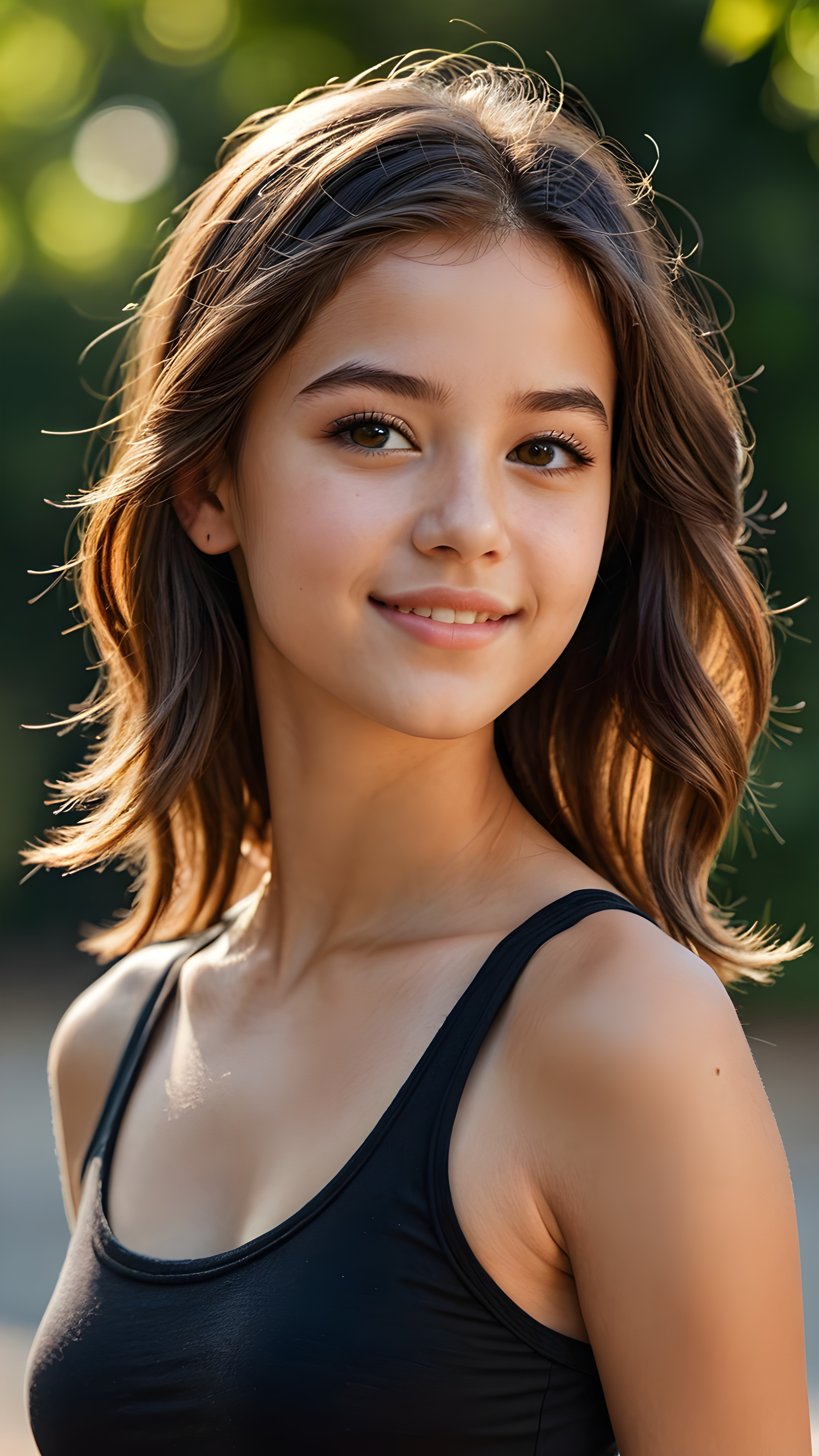 a 14-year-old (((teen girl))) with intricate, realistically detailed (((hair))), a beautifully saturated complexion, and a short crop tank top, looking directly at the viewer with a warm smile, showcasing an ultra high resolution and deeply shadowed (((face))), all captured in a highly detailed masterpiece that exudes a (((stunning upper body))), with its perfect curved contours and gorgeously attractive features, viewed from the side, representing pure perfection
