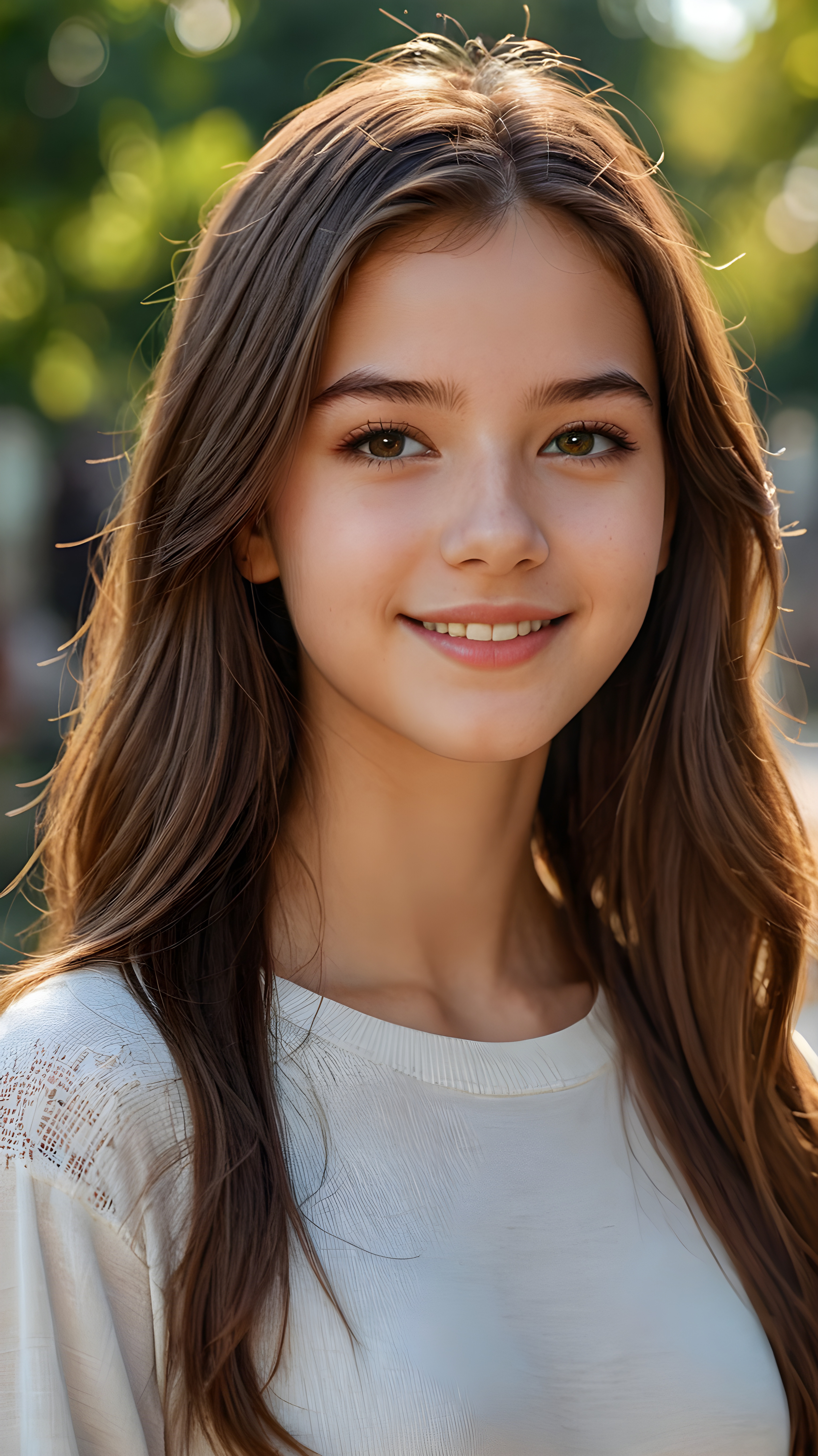 a teen girl, 14 years old, realistic detailed straight brown hair, realistic face, perfect curved body, lightly dressed, beautiful saturation, ultra high resolution, deep shadow, (best quality, masterpiece), highly detailed, looking at viewer, warm smile, 4k, ((portrait shot)) (((gorgeous))) ((attractive)) ((stunning))