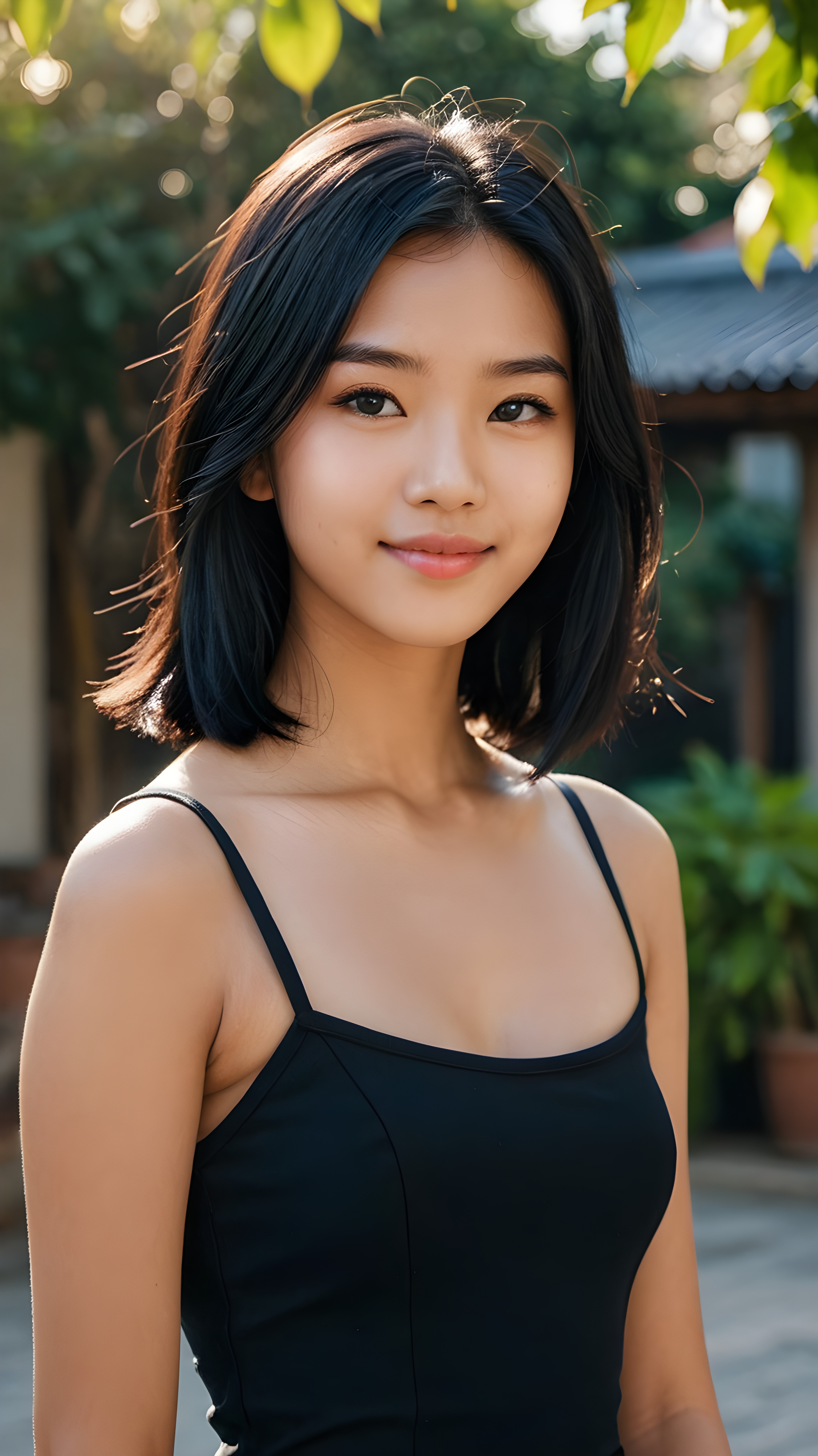 an Asia teen girl, 14 years old, ((realistic detailed, shiny, straight black hair)), realistic face, perfect curved body, lightly dressed, beautiful saturation, ultra high resolution, deep shadow, (best quality, masterpiece), highly detailed, looking at viewer, warm smile, 4k, ((portrait shot)) (((gorgeous))) ((attractive)) ((stunning))