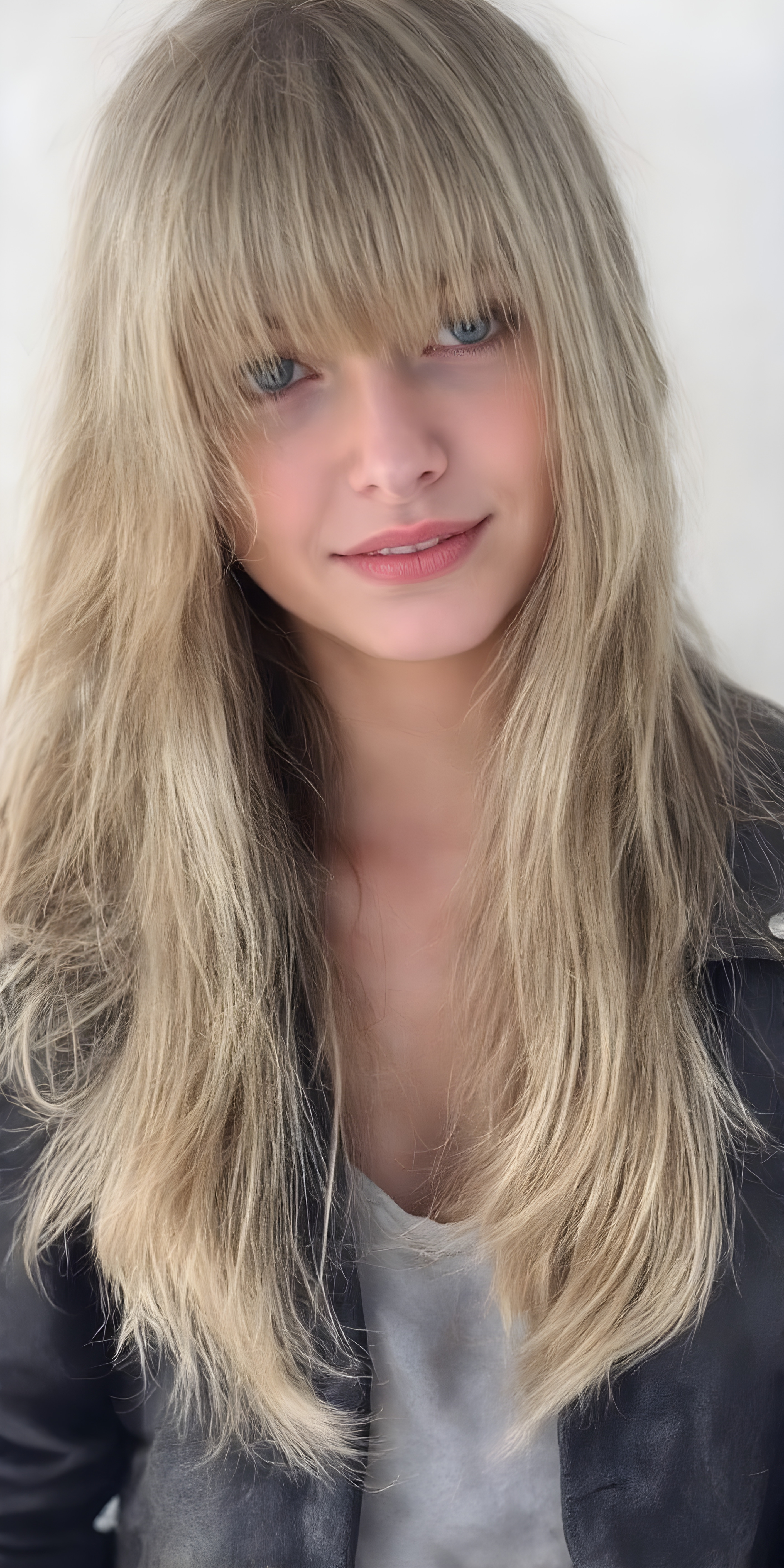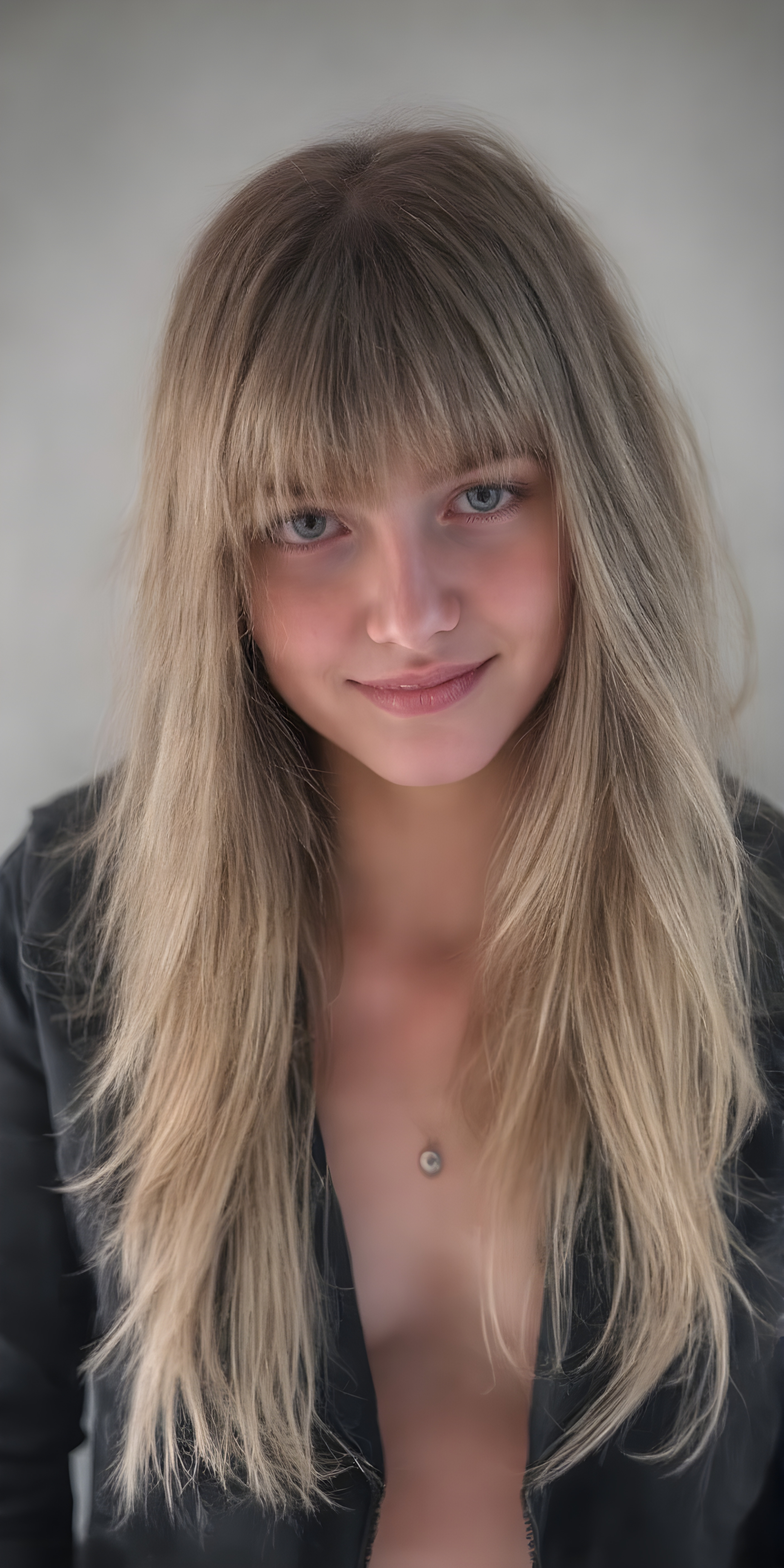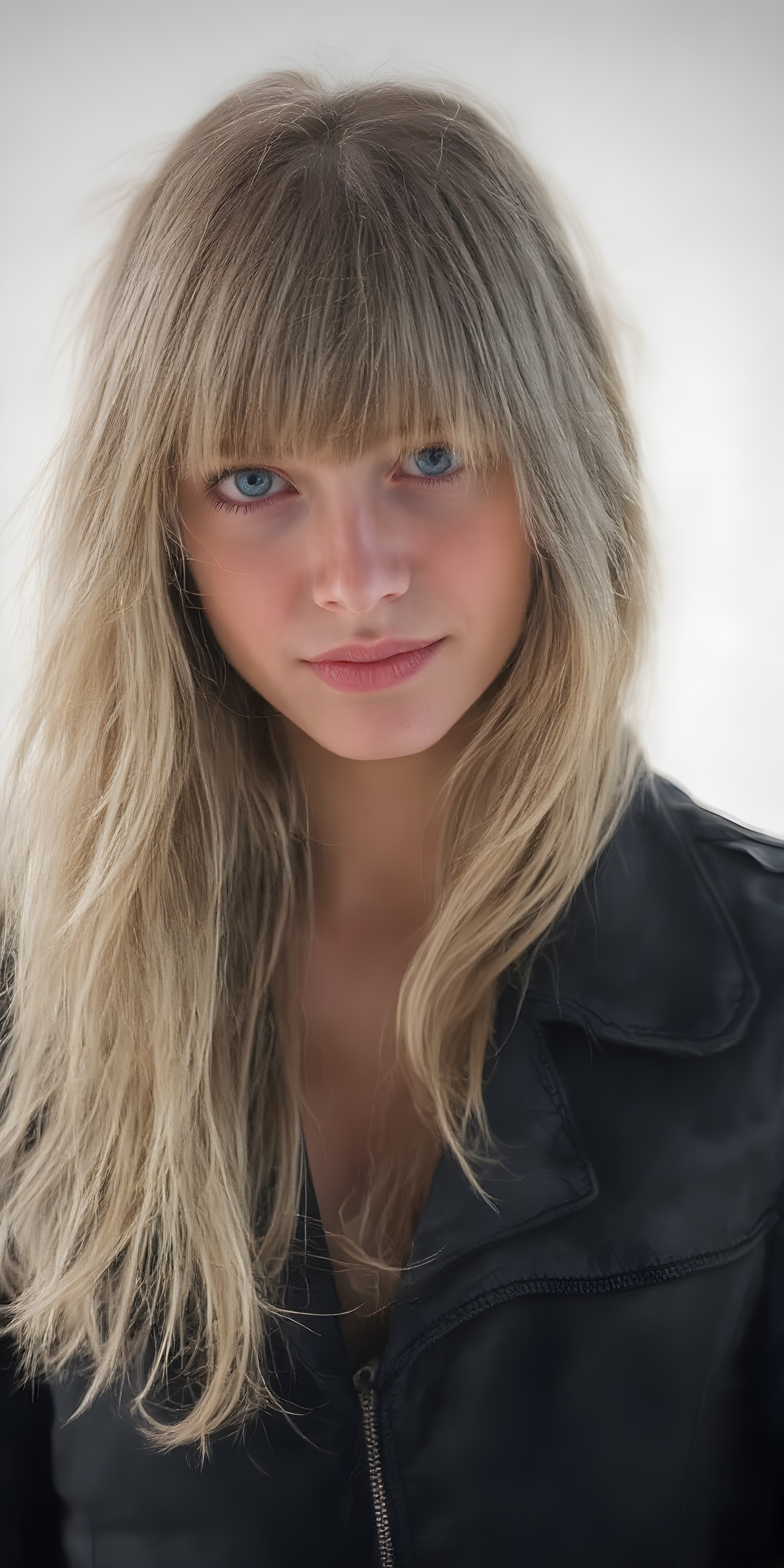 A (((beautiful young cute teenage girl))), age 15, with flowing, (((long, two-toned blond hair with bangs))), that subtly matches the contours of her face, covering her eyes and ears, creating a soft, ethereal glow around her head. She’s dressed in a sleek, ((black, form-fitting biker jacket)) with intricate, ((tribal-inspired detailing)), paired with light denim jeans. Her smile radiates cheerfulness, set against a (softly hazy white backdrop), (full body), ((tattoo art)) that elegantly matches the contours of her body and complements her youthful face, giving off an air of confidence and poise, ((poker face)) that exudes sophistication and playfulness