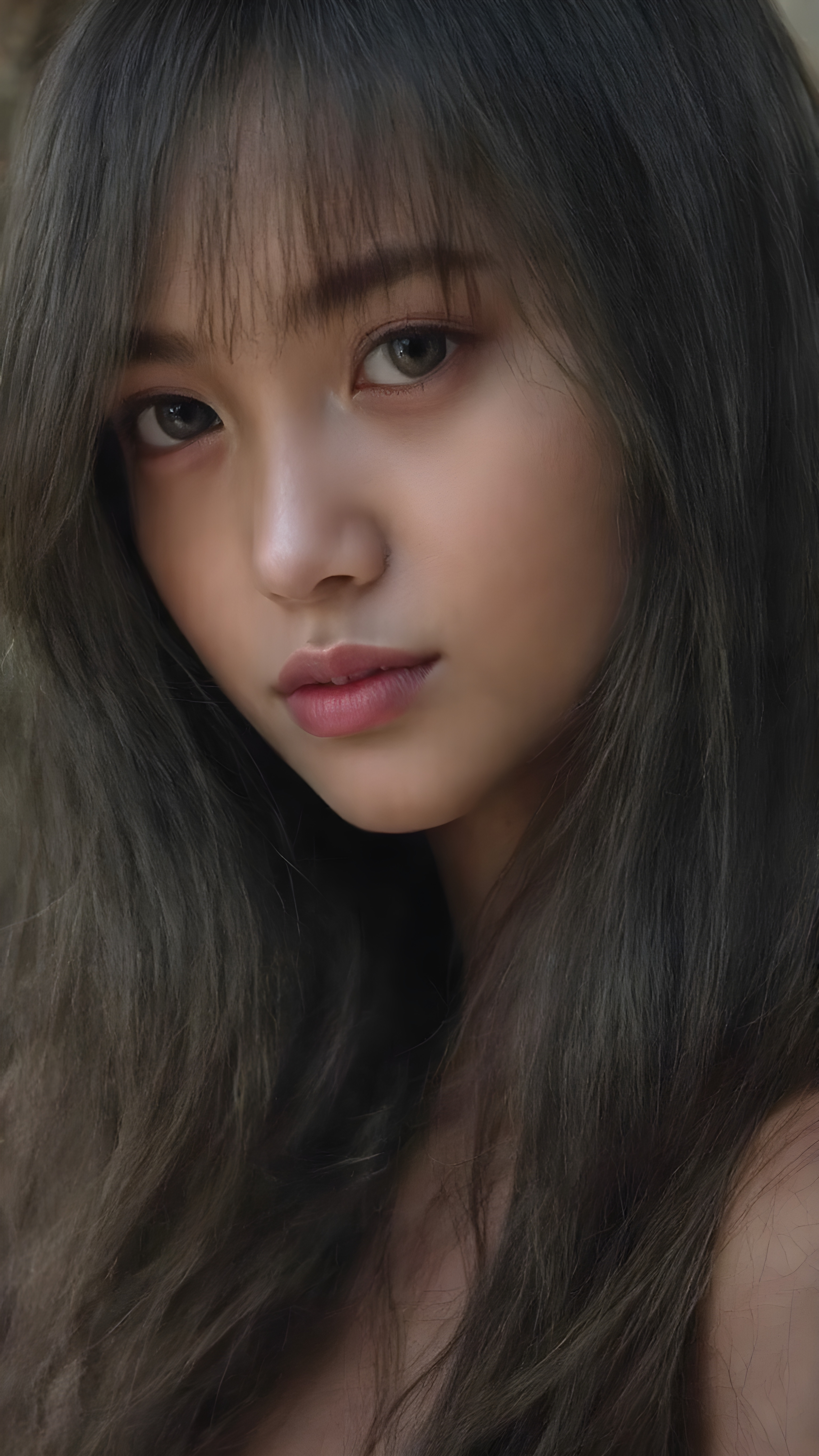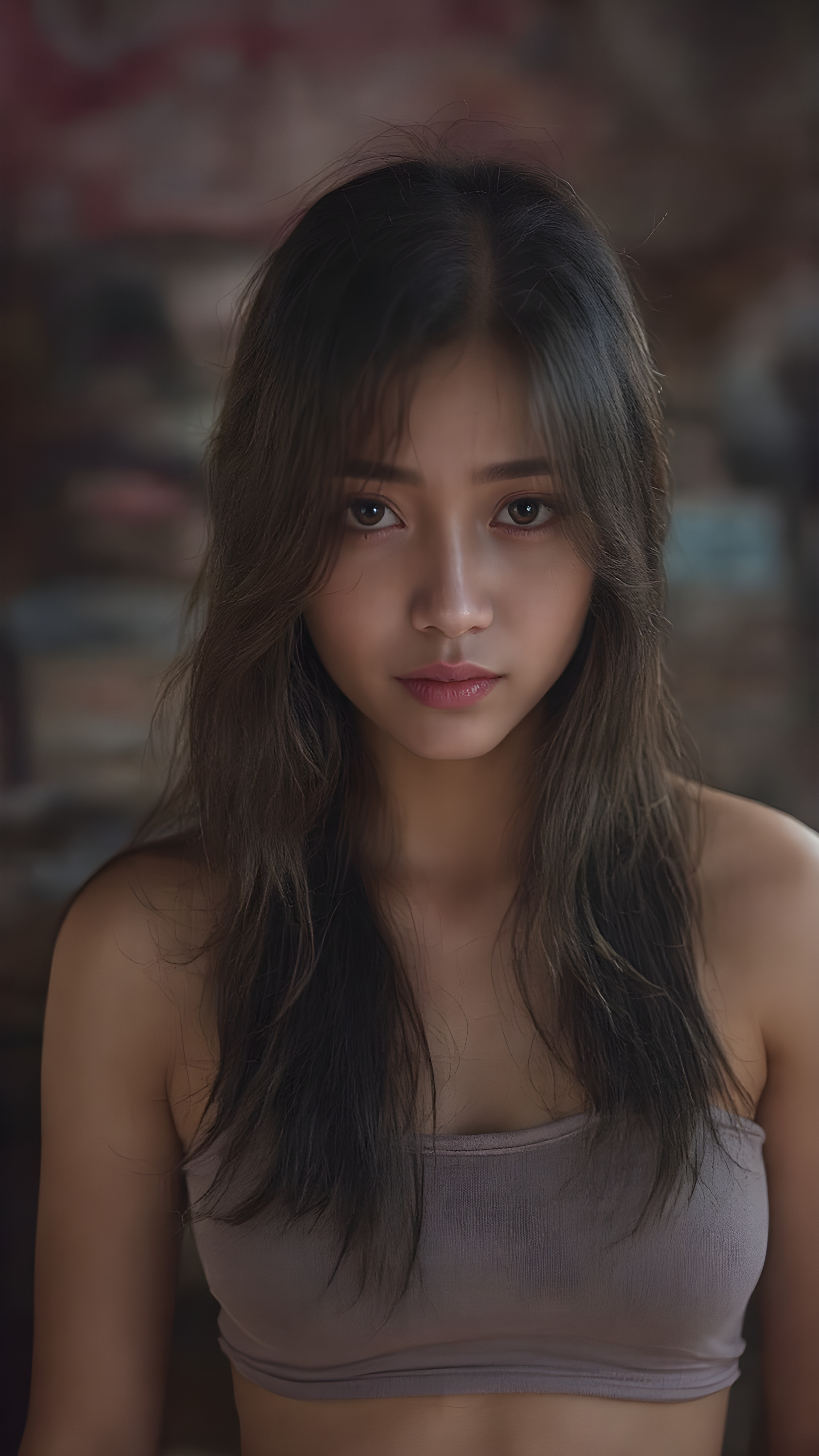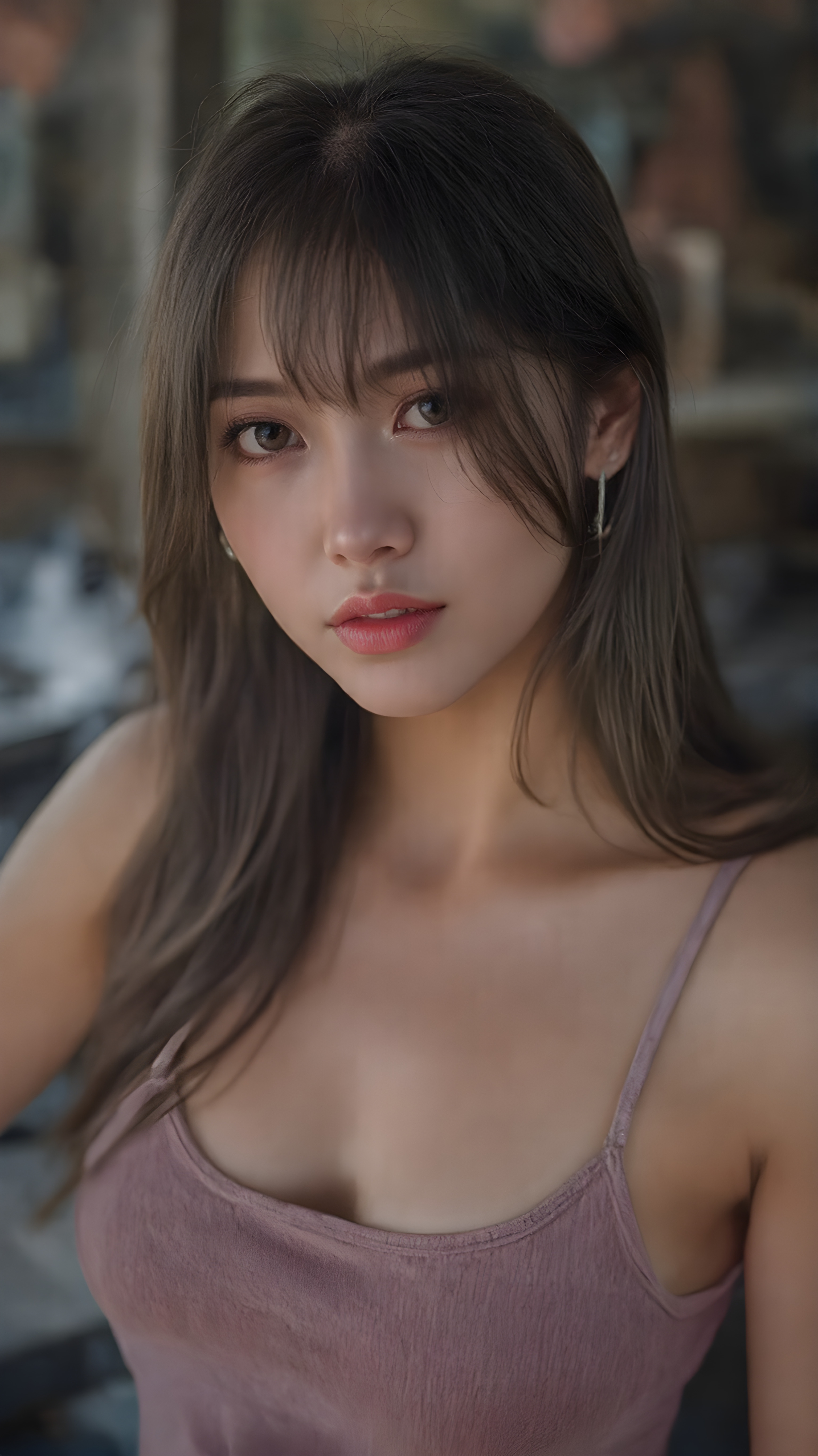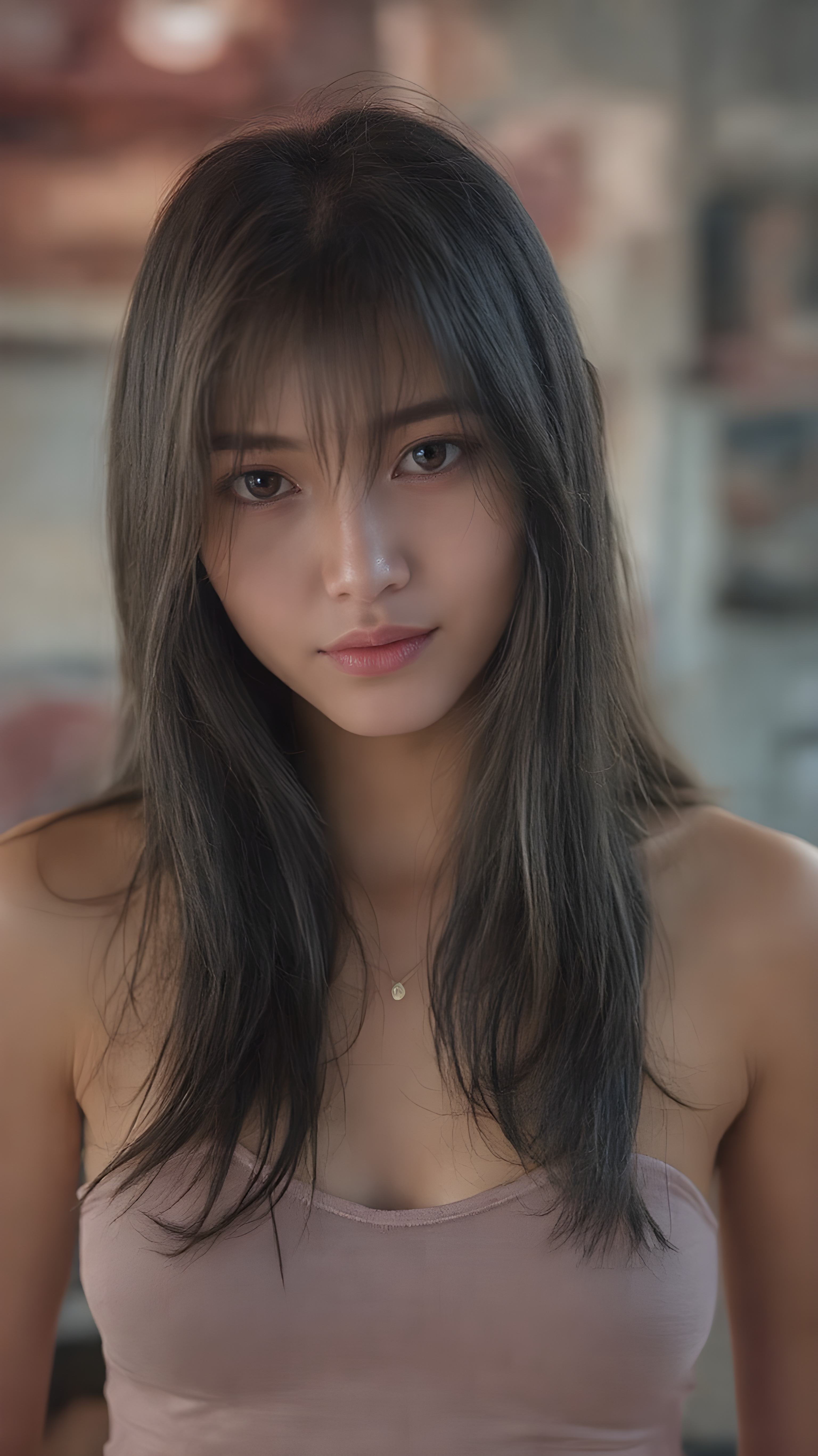 a beautifully realistic and detailed photo from a (((super realistic Japanese girl))), with a curvy figure and intricate details, dressed in a (((super short, tight tank top))), poised in a playfully confident pose, with long, flowing hair and striking, perfectly detailed eyes