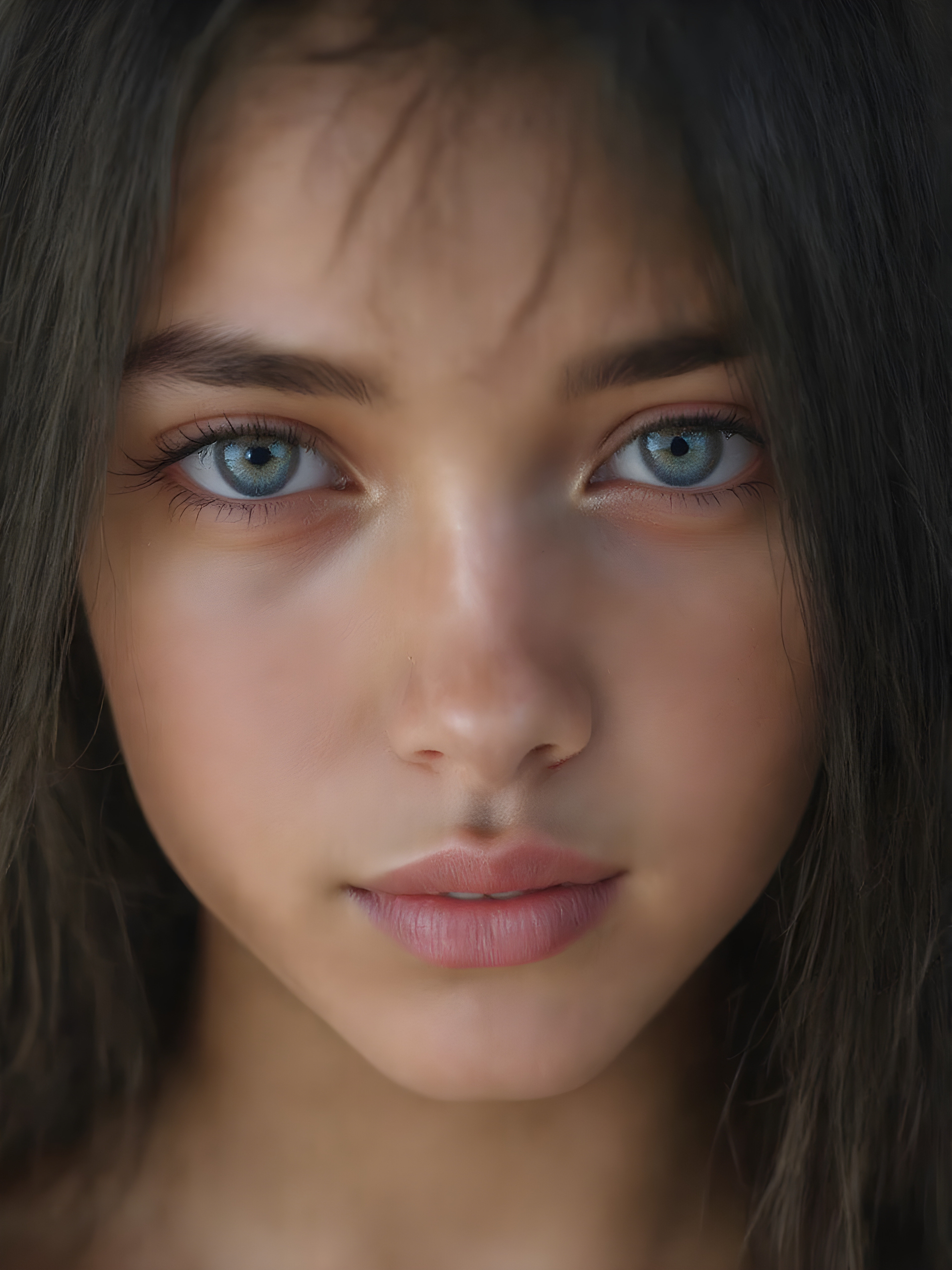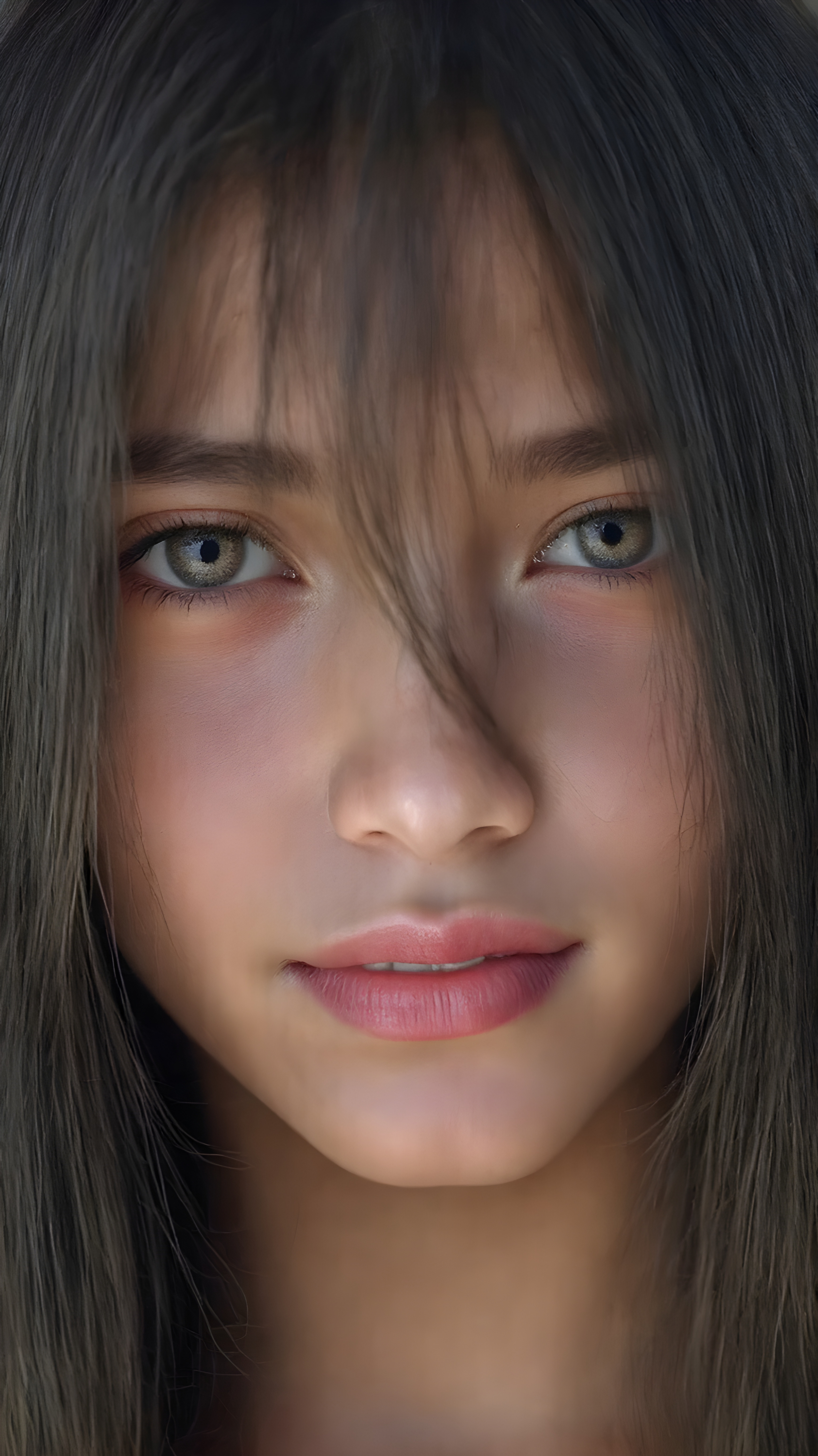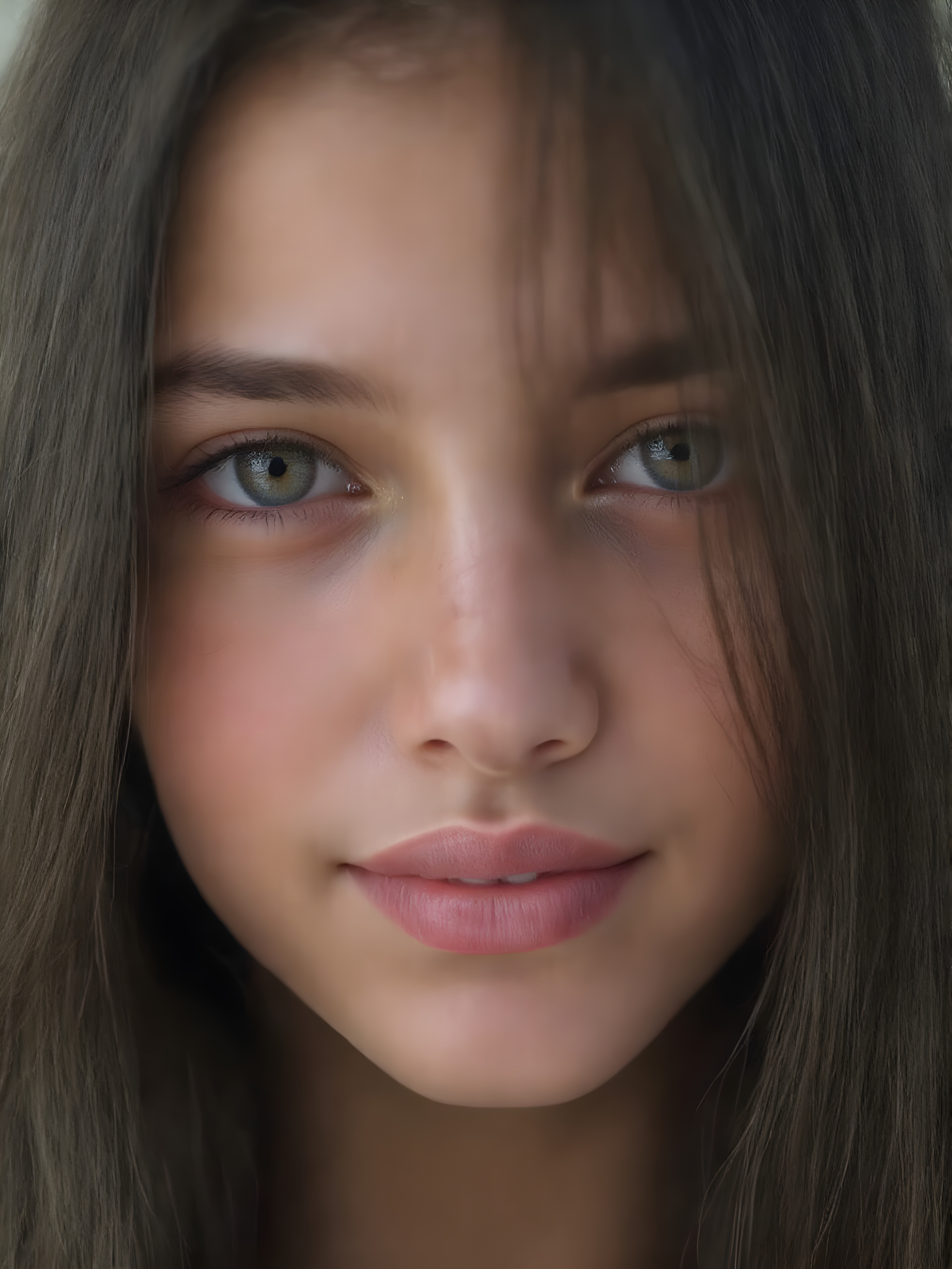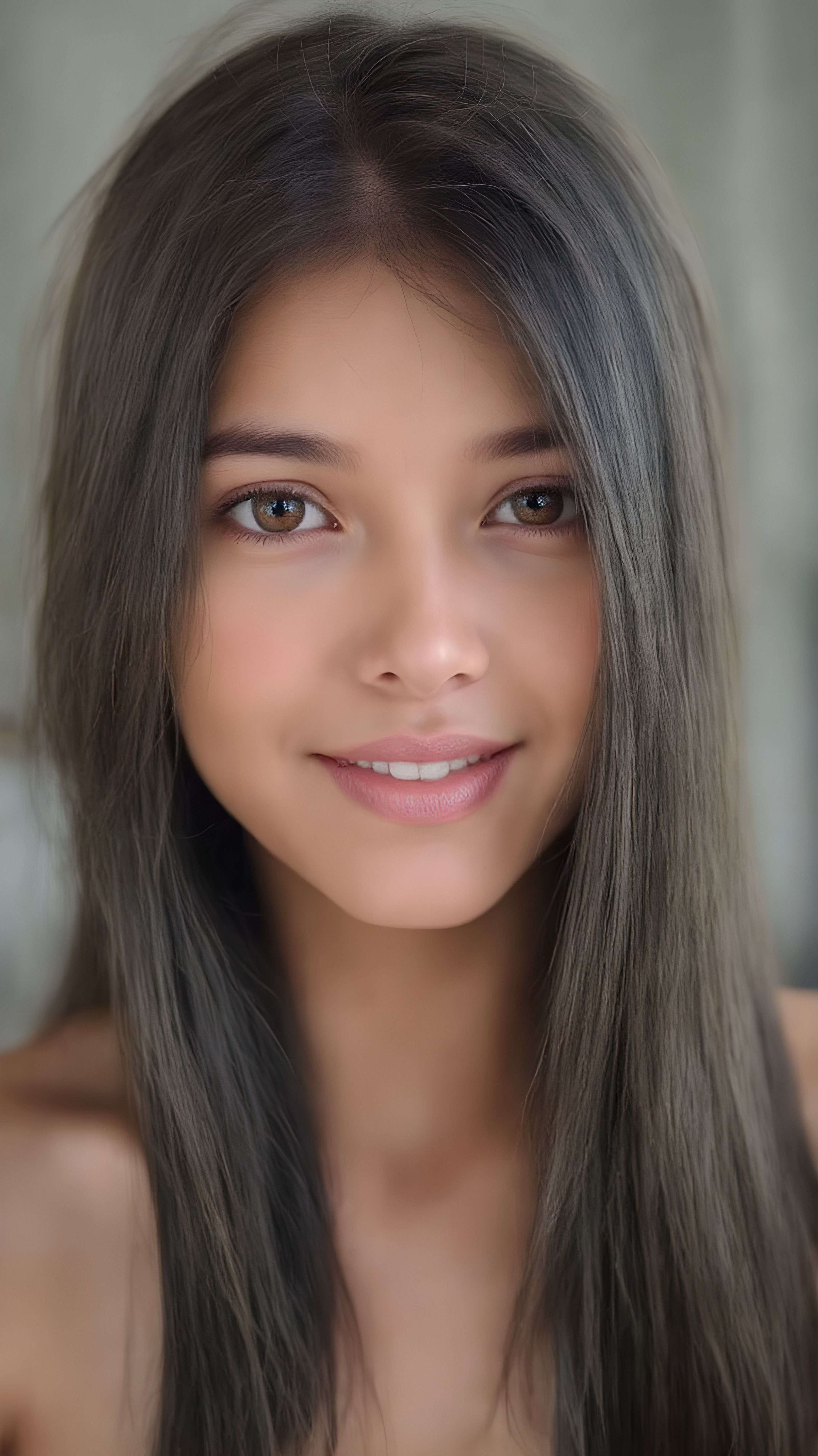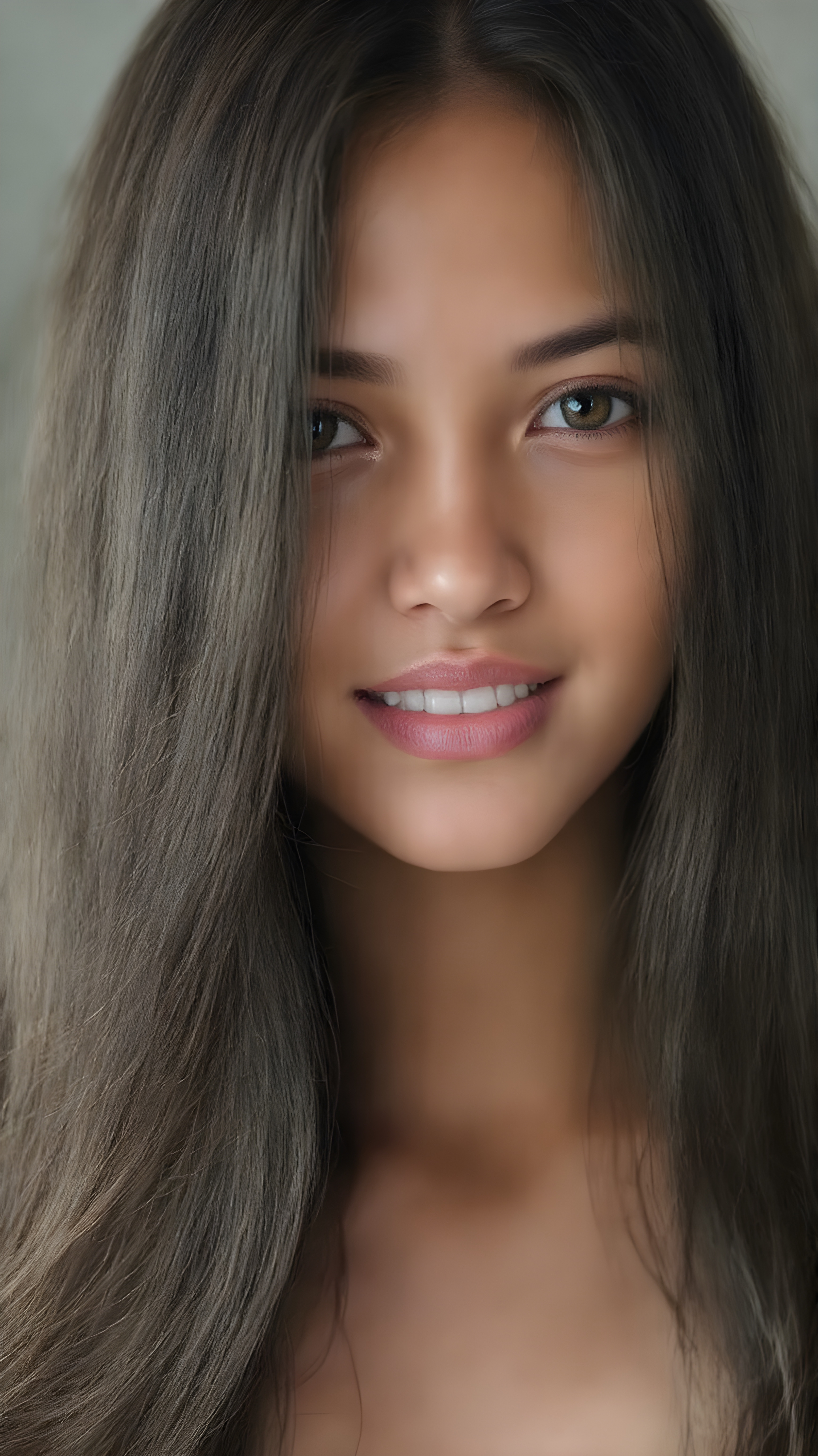 a face portrait shot from a (((stunningly beautiful young girl))) with an exceptionally long, thick, wavy straight black hair intricately styled in sleek, voluminous locks that frame her face perfectly, her eyes are the most gorgeous in the world, with a perfect oval shape and cutting-edge technology like irises that match the color of her eyes and enhance their beauty. Her face exudes ultra realism, with fine lines that convey a sense of luxurious opulence. She’s captured in a front view, showcasing her full figure elegantly, with a warm smile that gives her a cute, inviting expression, ((open mouth and white teeth))