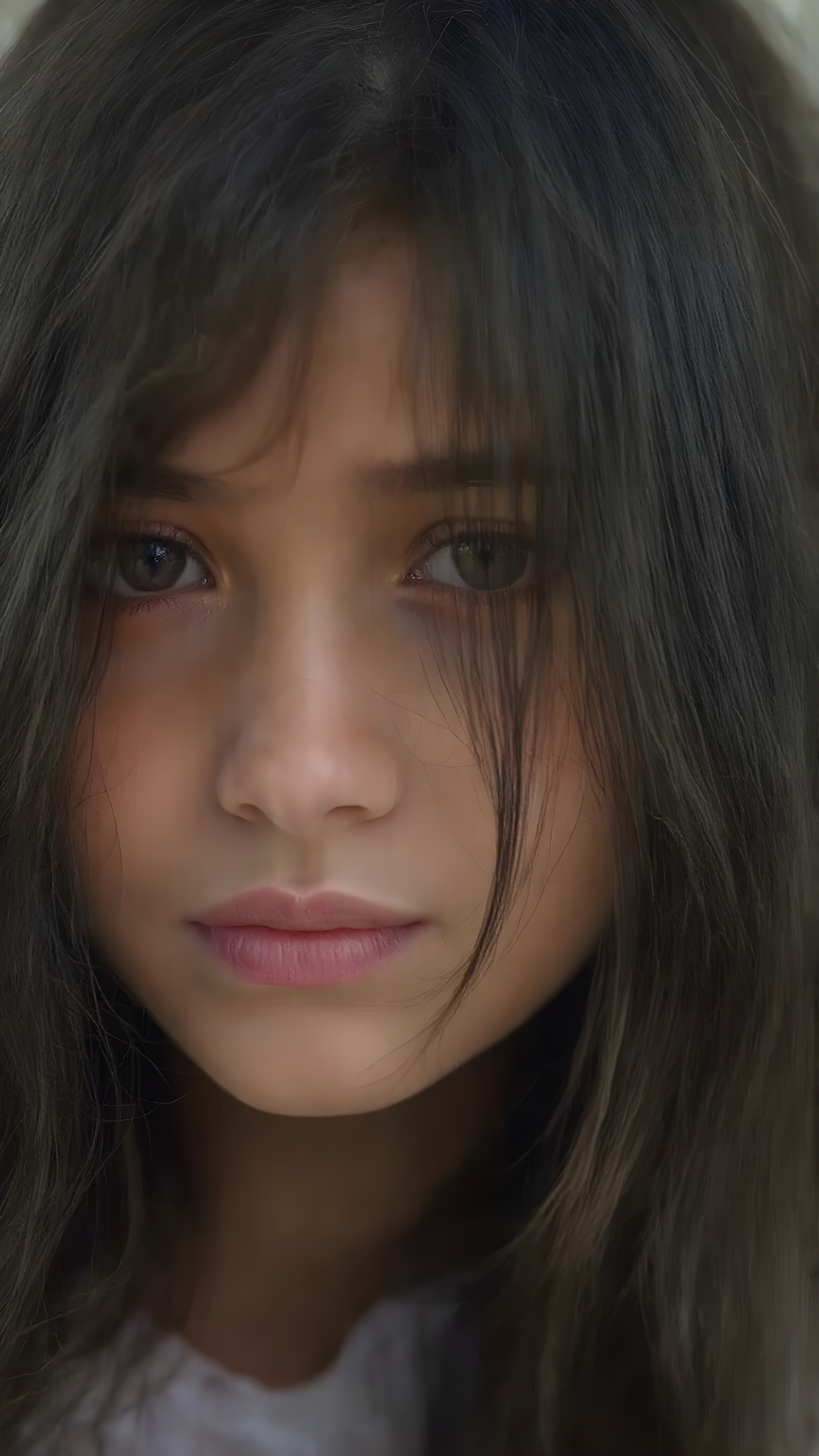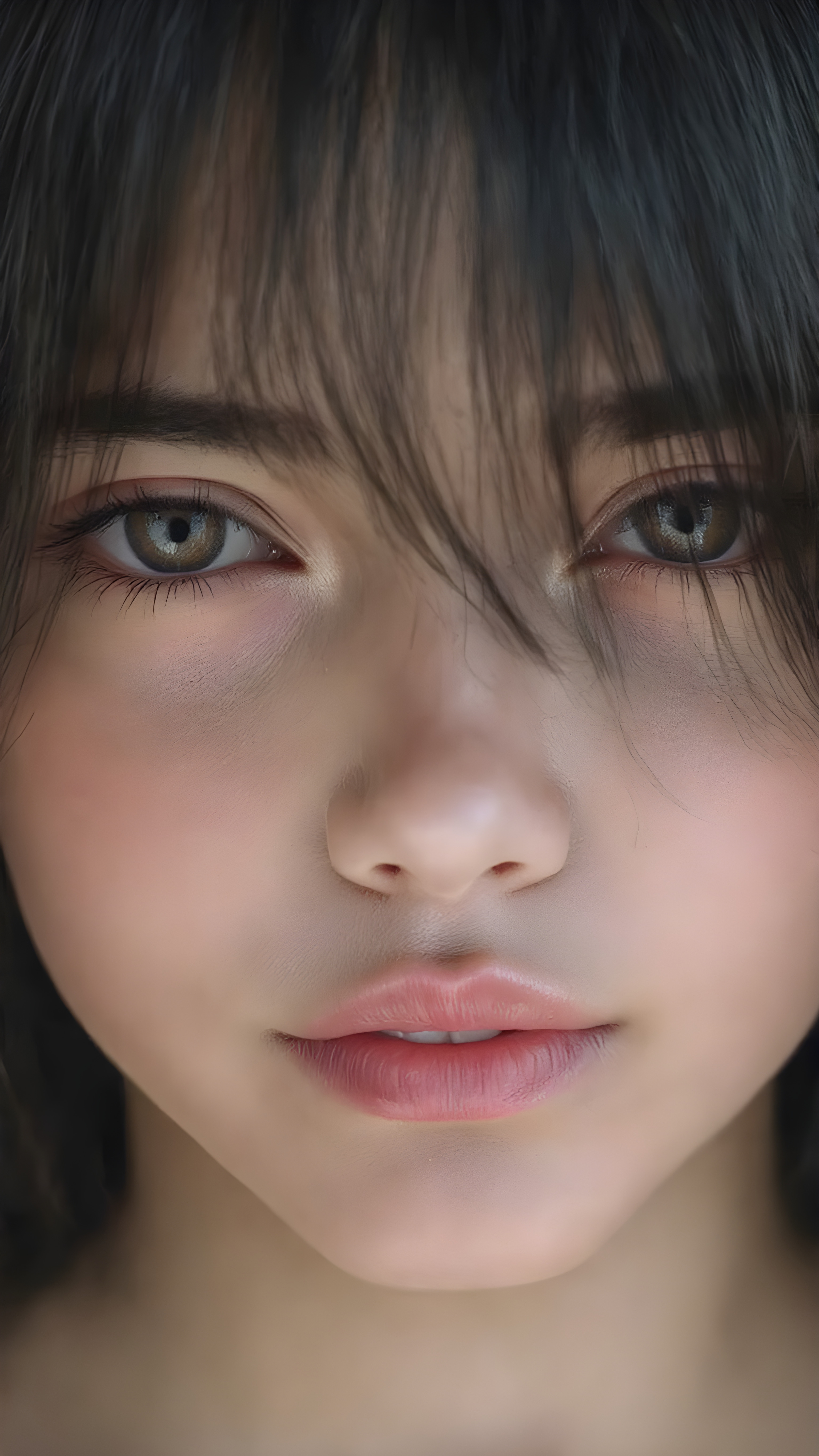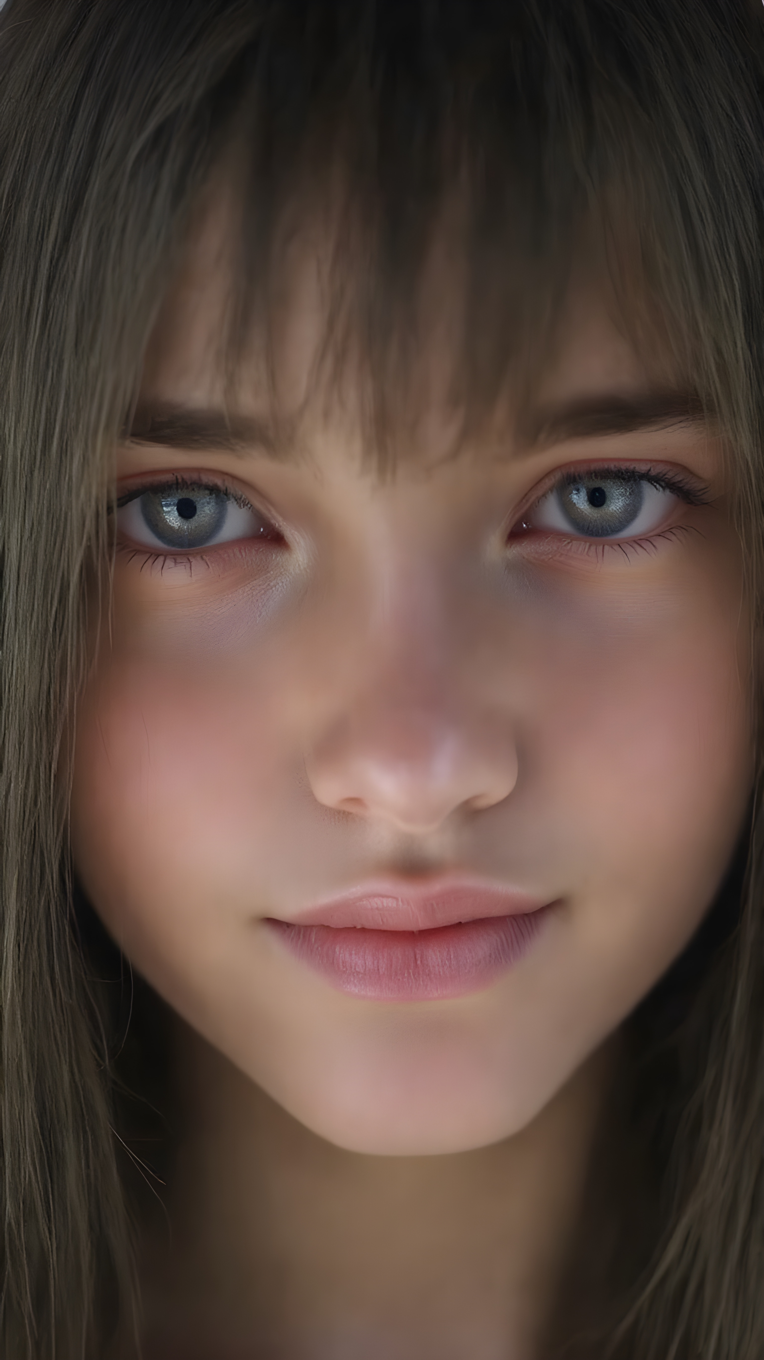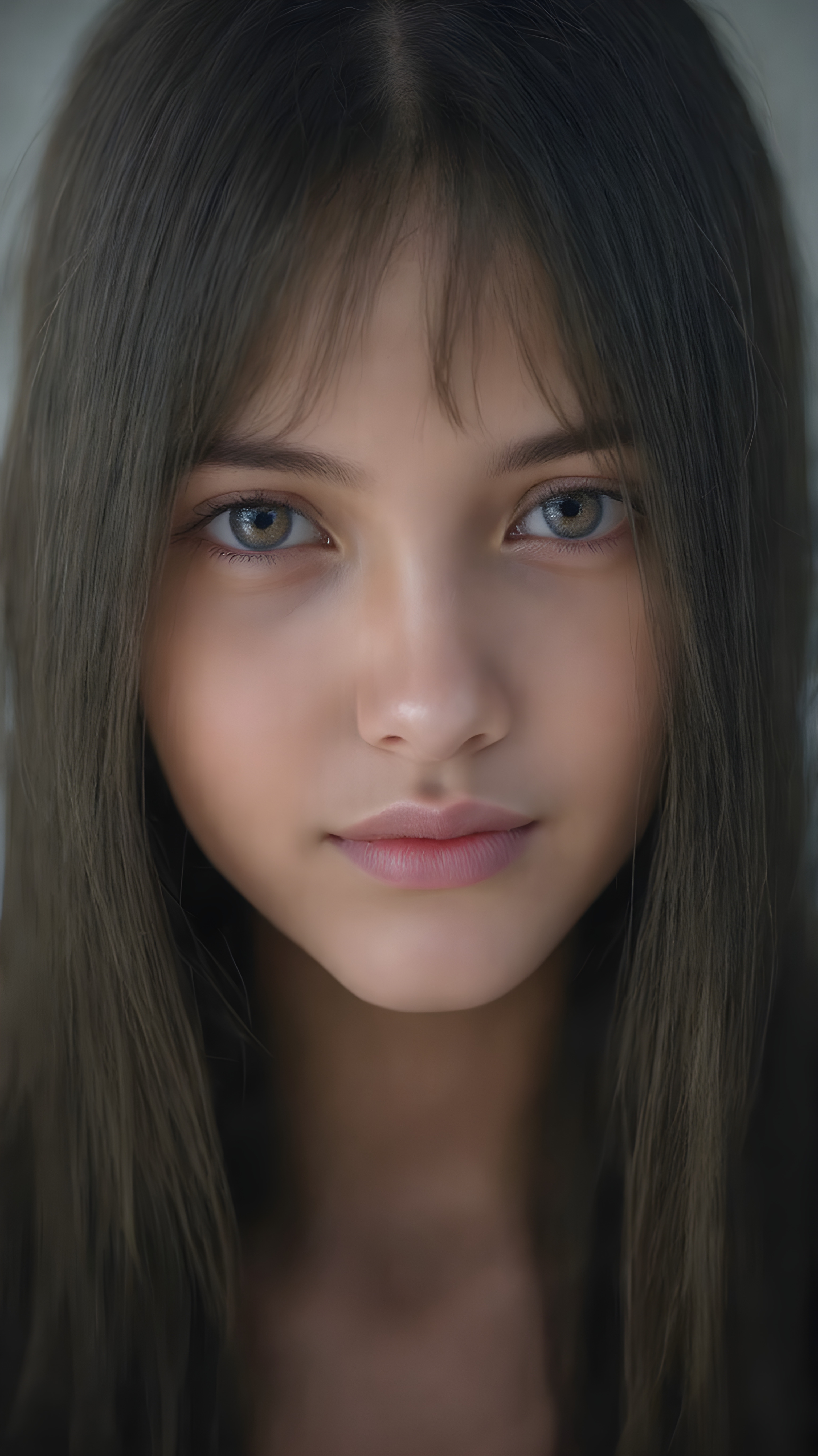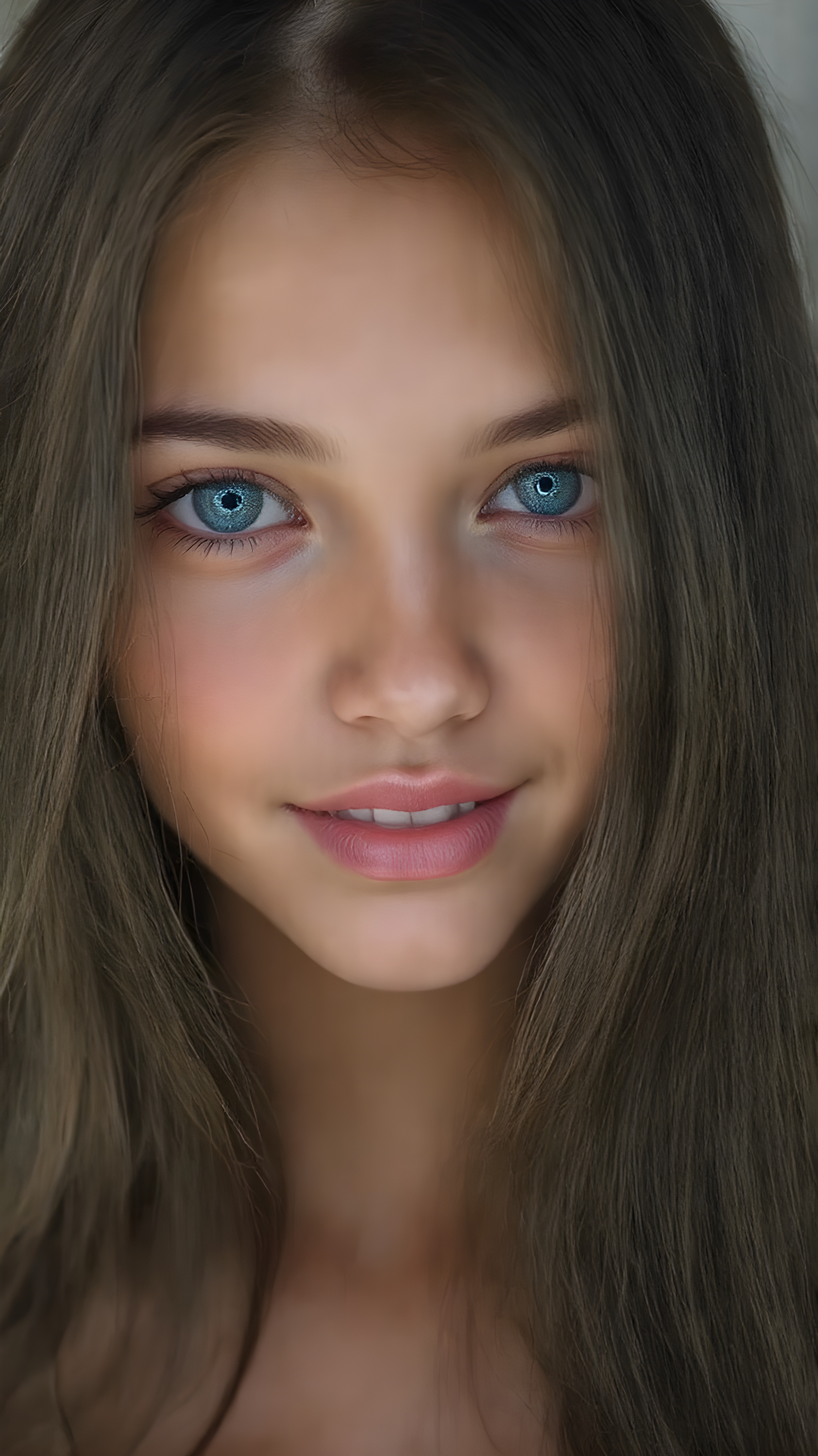 a face portrait shot from a (((stunningly beautiful young girl))) with an exceptionally long, thick, wavy straight black hair intricately styled in sleek, voluminous locks that frame her face perfectly, her eyes are the most gorgeous in the world, with a perfect oval shape and cutting-edge technology like irises that match the color of her eyes and enhance their beauty. Her face exudes ultra realism, with fine lines that convey a sense of luxurious opulence. She’s captured in a front view, showcasing her full figure elegantly, with a warm smile that gives her a cute, inviting expression, ((open mouth and white teeth))