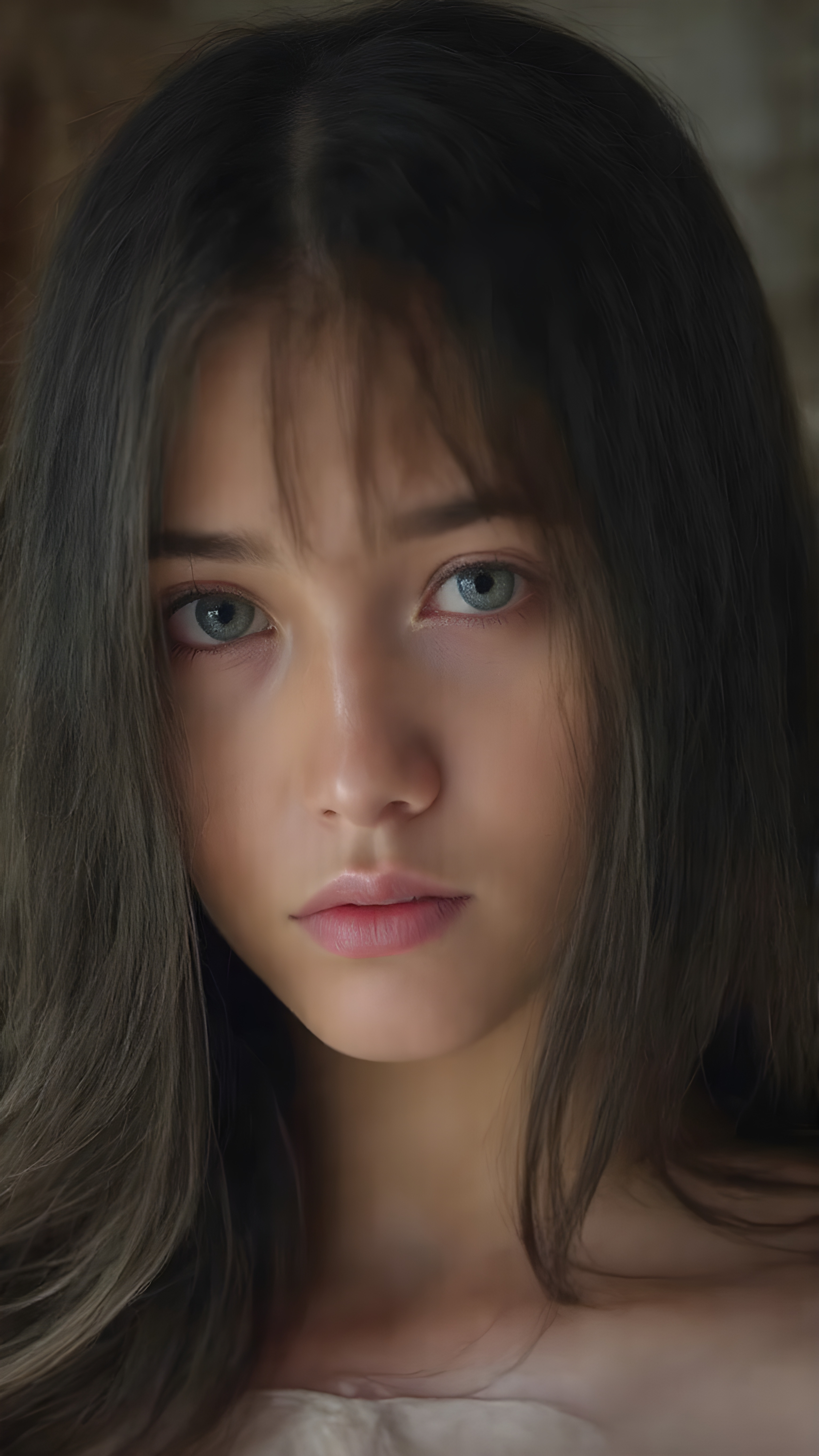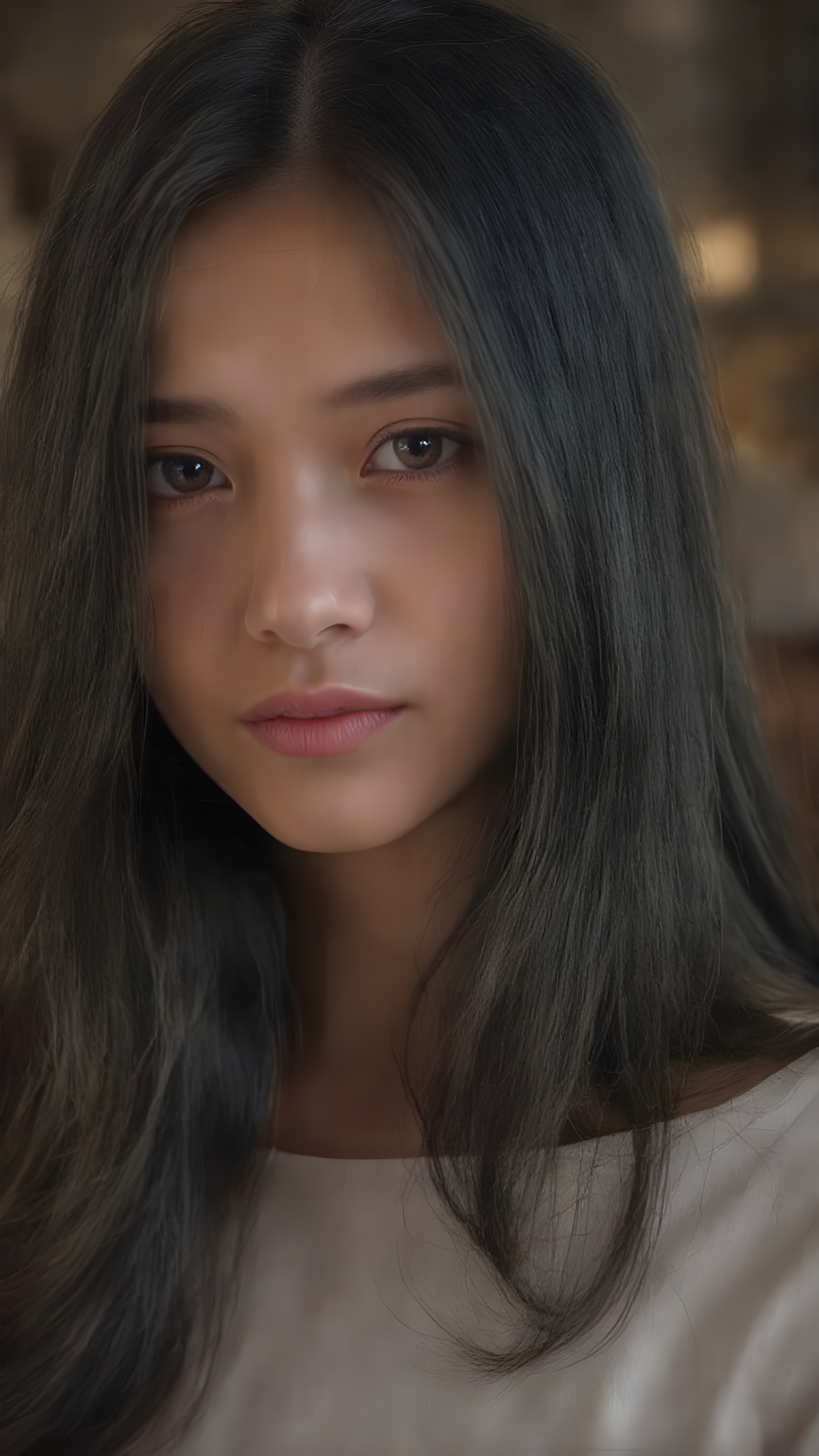 a portrait shot from a (((stunningly beautiful young girl))) with an exceptionally long, thick, wavy straight black hair intricately styled in sleek, voluminous locks that frame her face perfectly, complemented by elegant, intricate details like a sleekly designed collar that accentuates her graceful figure. Her eyes are the most gorgeous in the world, with a perfect oval shape and cutting-edge technology like irises that match the color of her eyes and enhance their beauty. Her face exudes ultra realism, with fine lines that convey a sense of luxurious opulence. She’s captured in a side view, showcasing her full figure elegantly, with a warm smile that gives her a cute, inviting expression