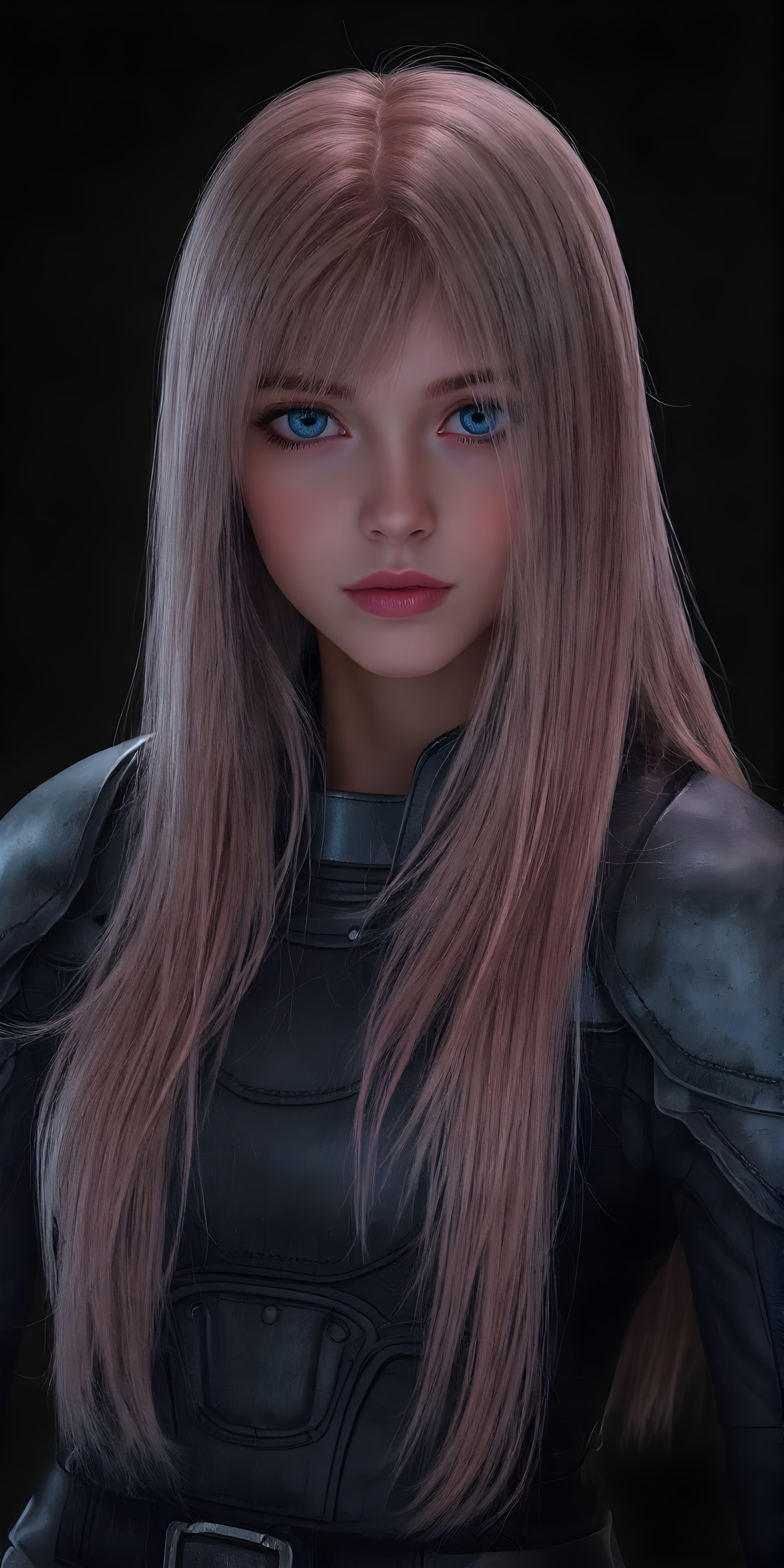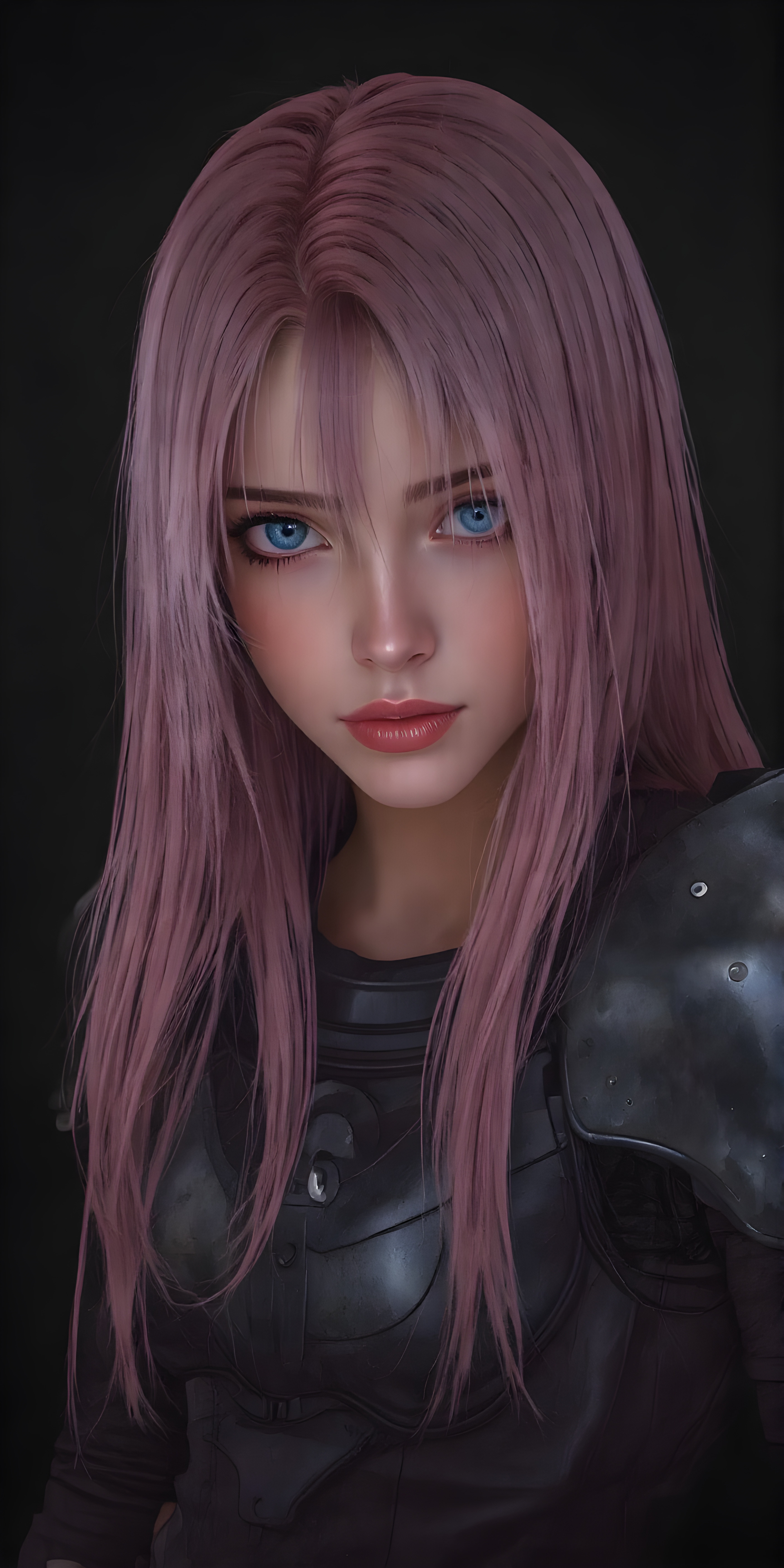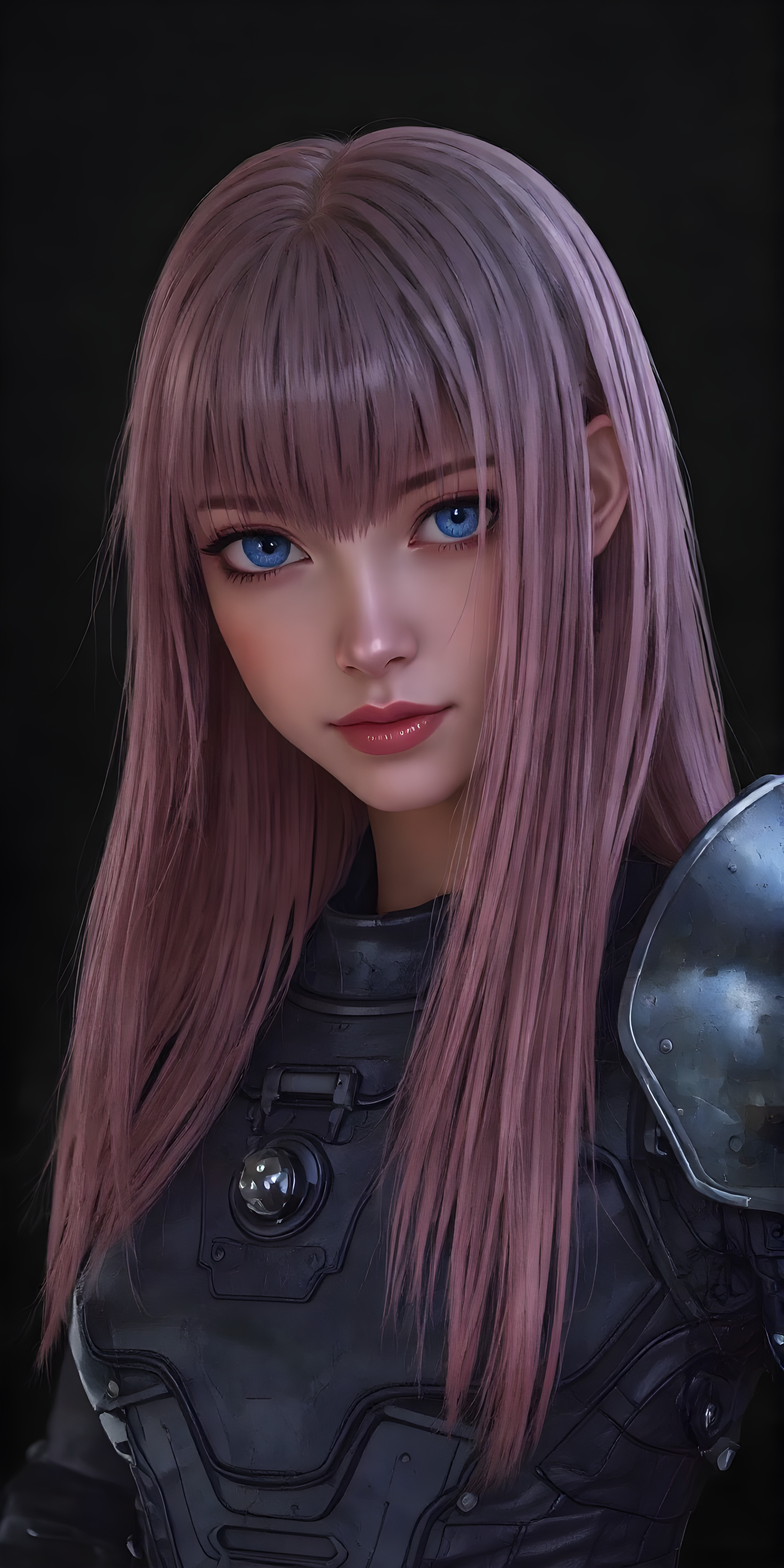 a (((teen girl from the future in a light armor))), in a perfect pose ((black background)), long shiny straight pink hair falling down her back, blue eyes, detailed, realistic