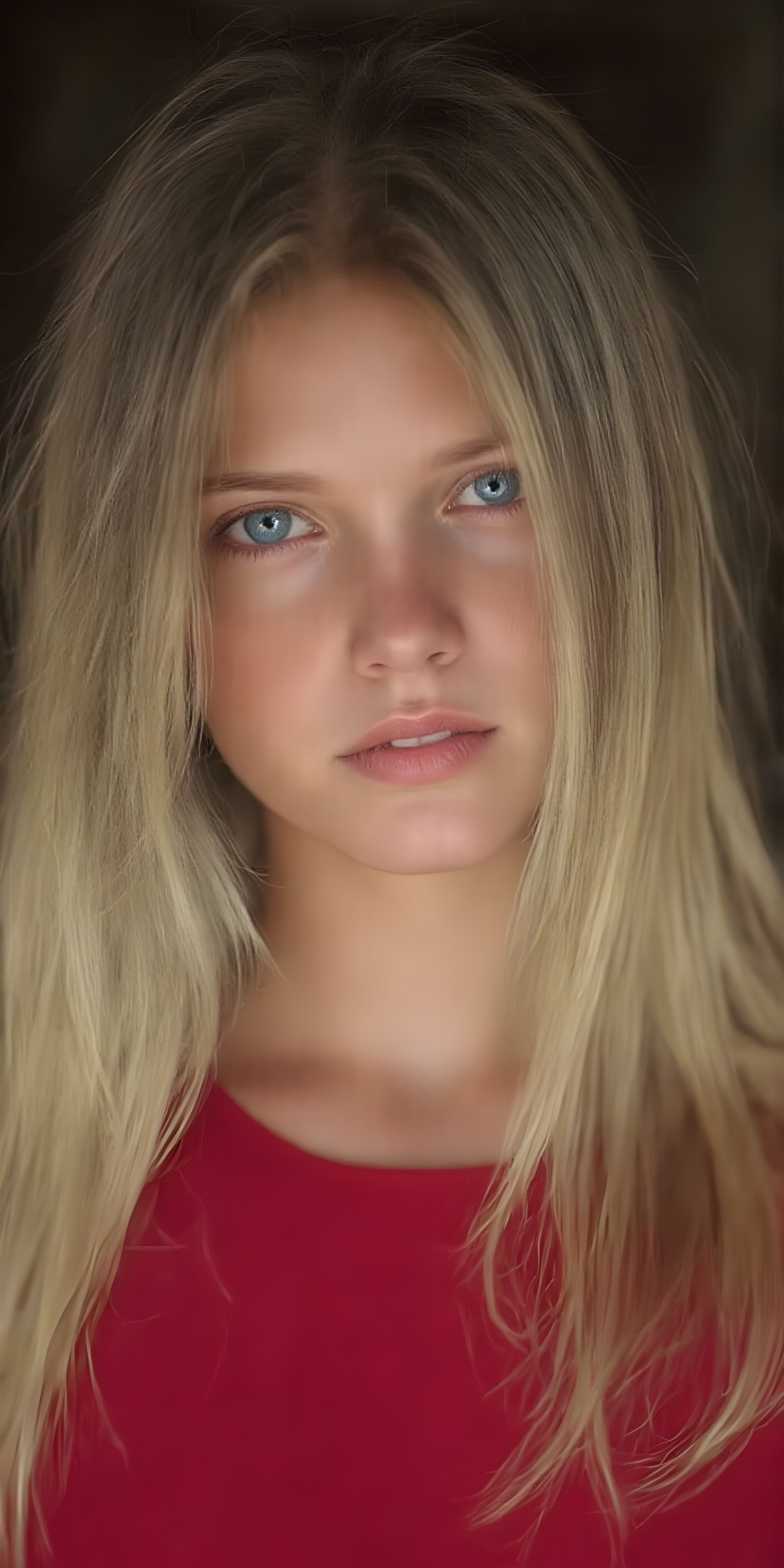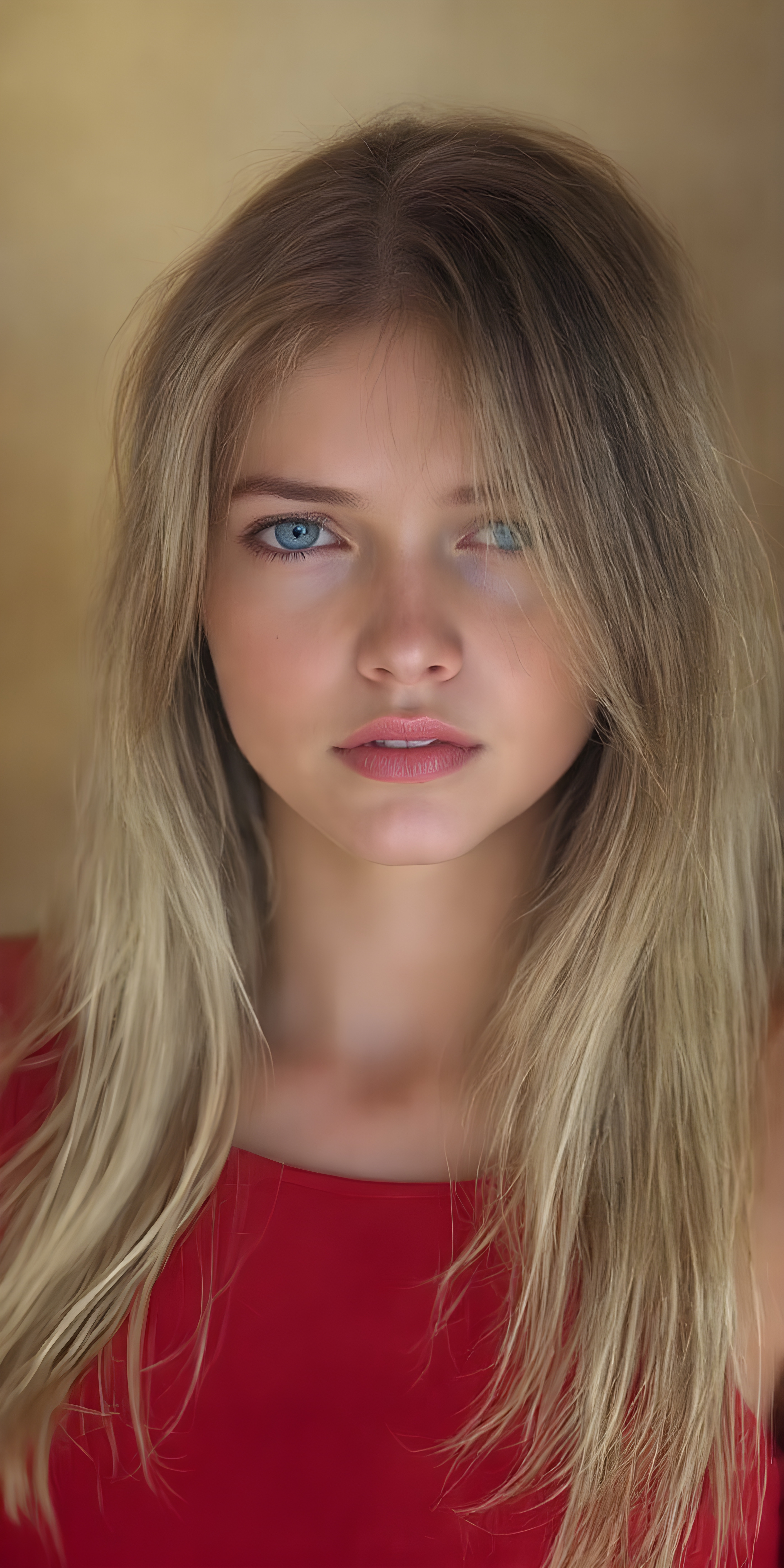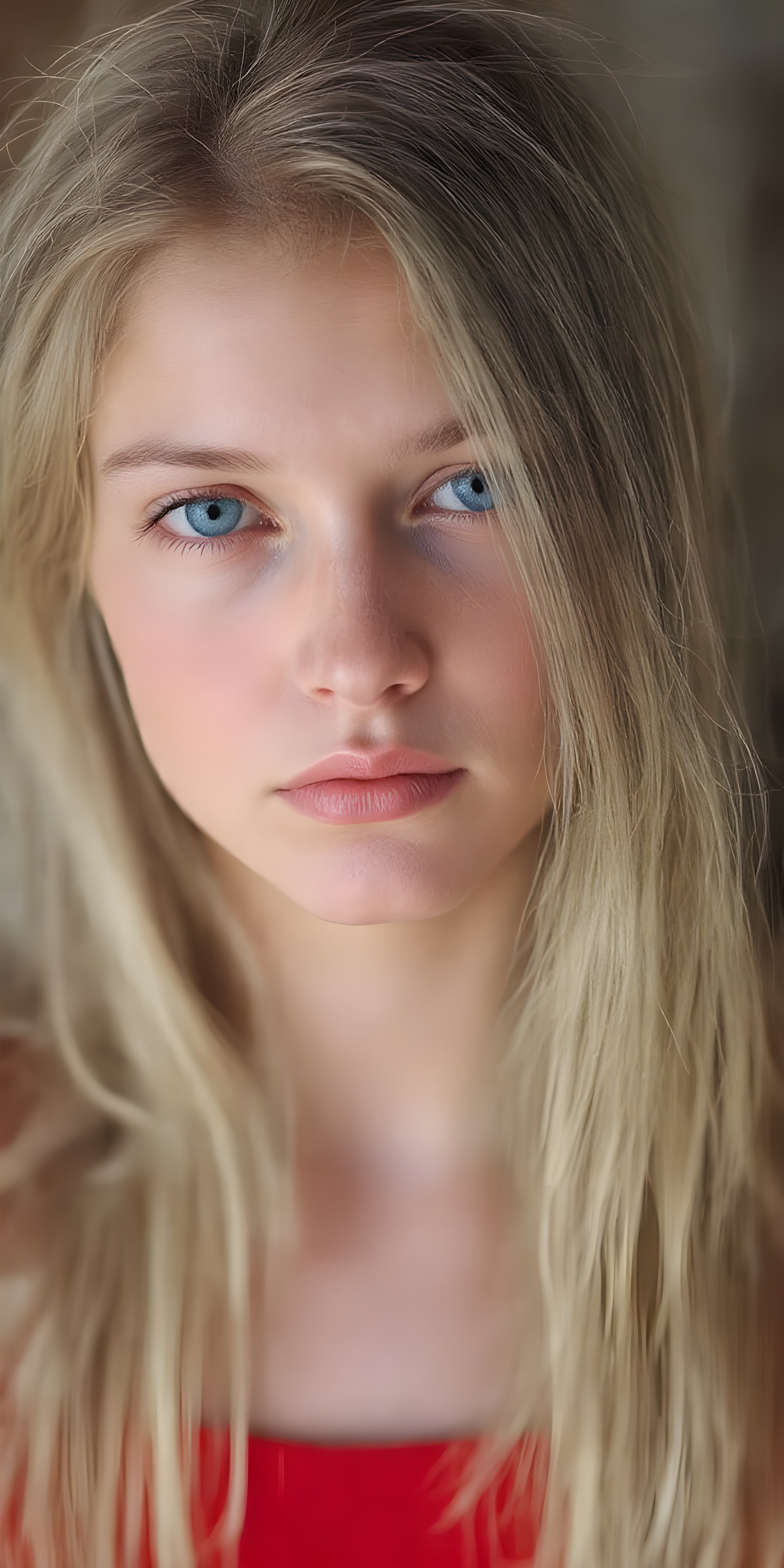 a (((super-clear and detailed photograph))) depicting a (((beautiful girl))) with ((long, straight, thick, untucked natural white golden blonde hair)) that flows down past her shoulders and captures the light as she poses elegantly in a natural and comfortable manner. Her ((natural skin is pale white)) and her ((lips are full and painted in a perfect hue of red)), which match her ((bright blue eyes))). She wears a (((perfect red dress))), which accentuates her ((perfect figure)). The overall atmosphere of the photograph is soft and warm, with a ((natural light shining on her face)), illuminating her ((face and body)) in a (((professional studio photograph))). This image has a ((golden and soft lighting)), which gives it a ((warm and inviting look)).