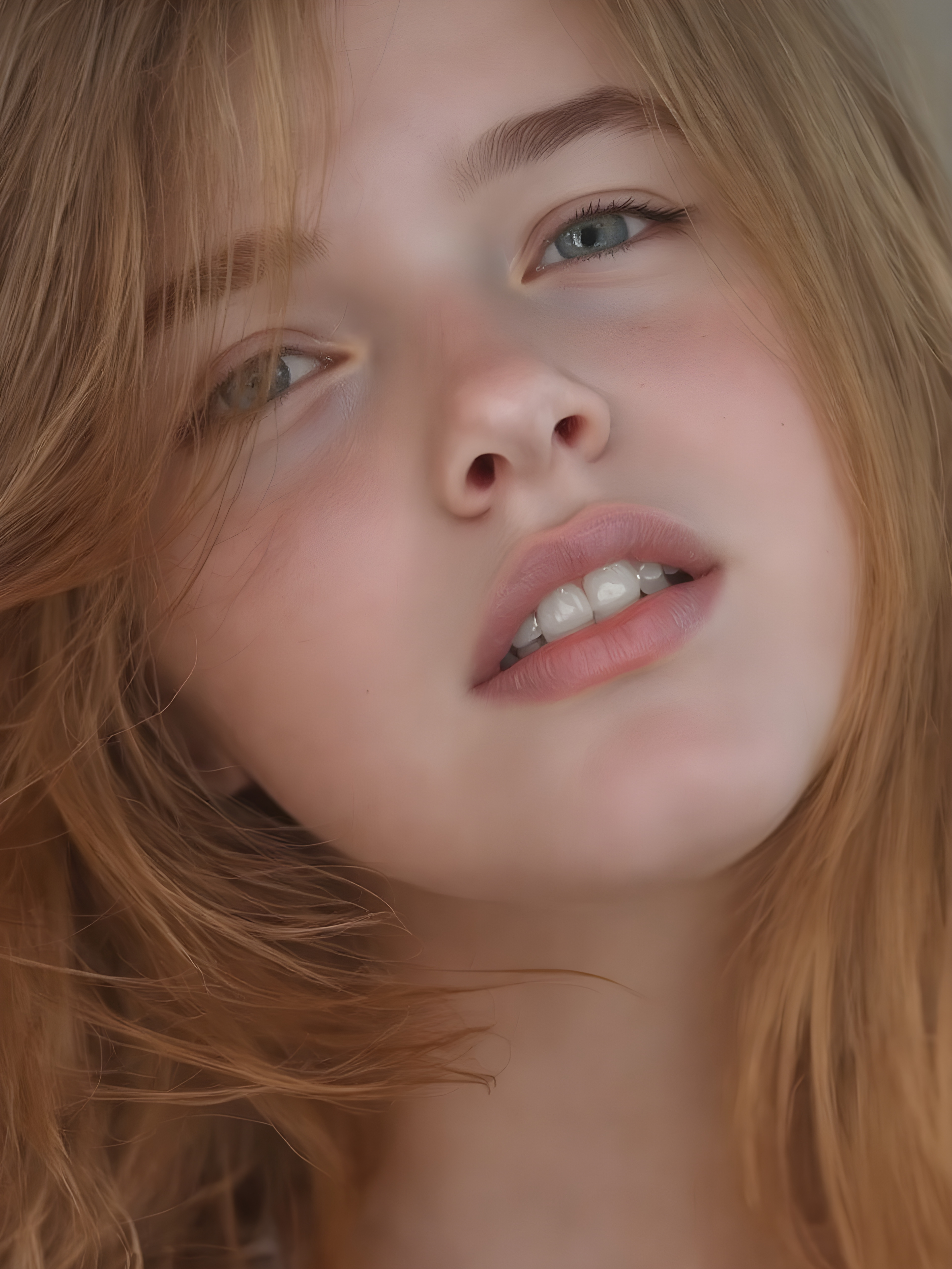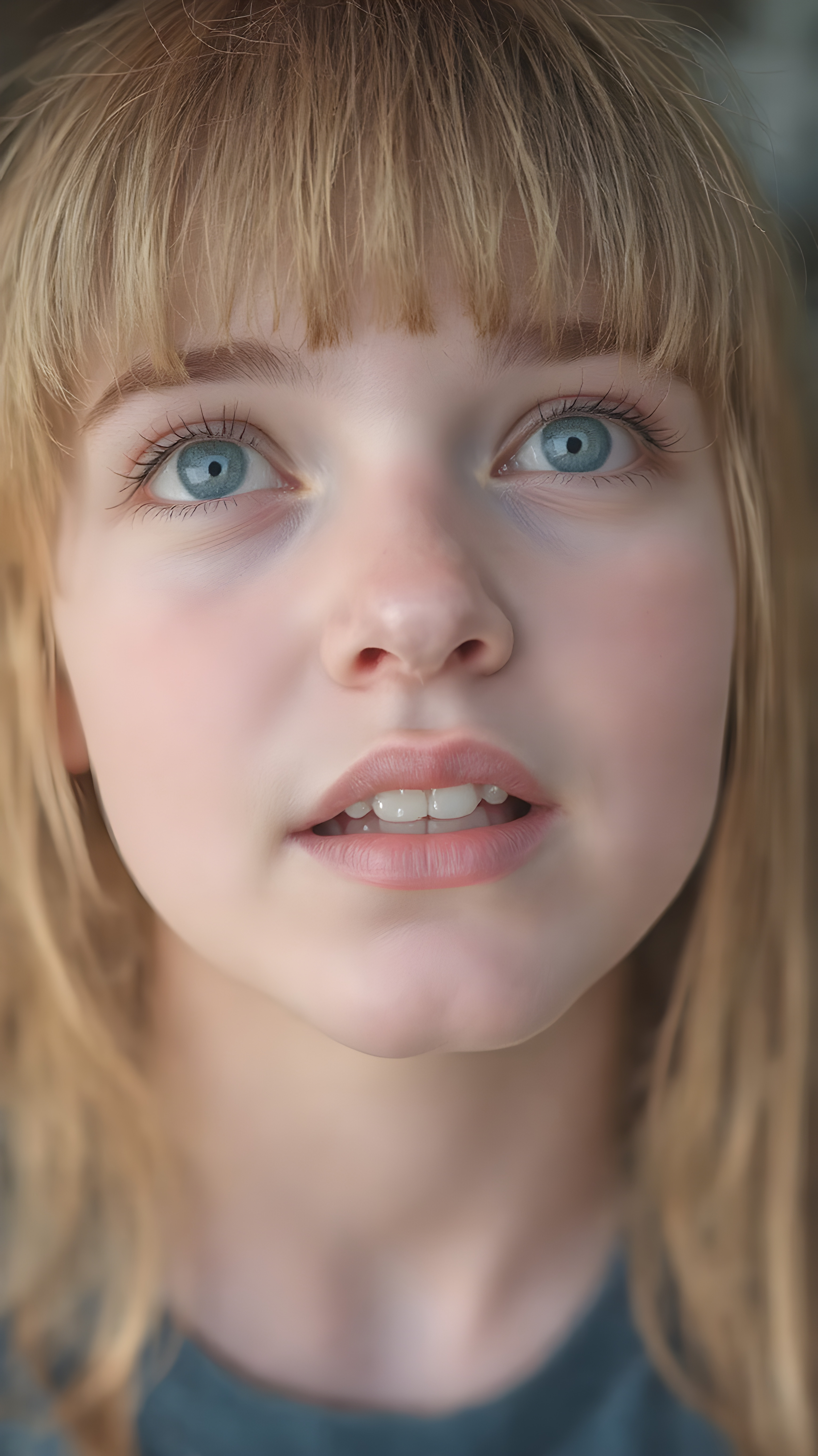 a teenage girl with straight orange soft hair, bangs, long hair, detailed face, looks up, round face, light green eyes wide open mouth, white teeth, full kissable lips, full head in focus