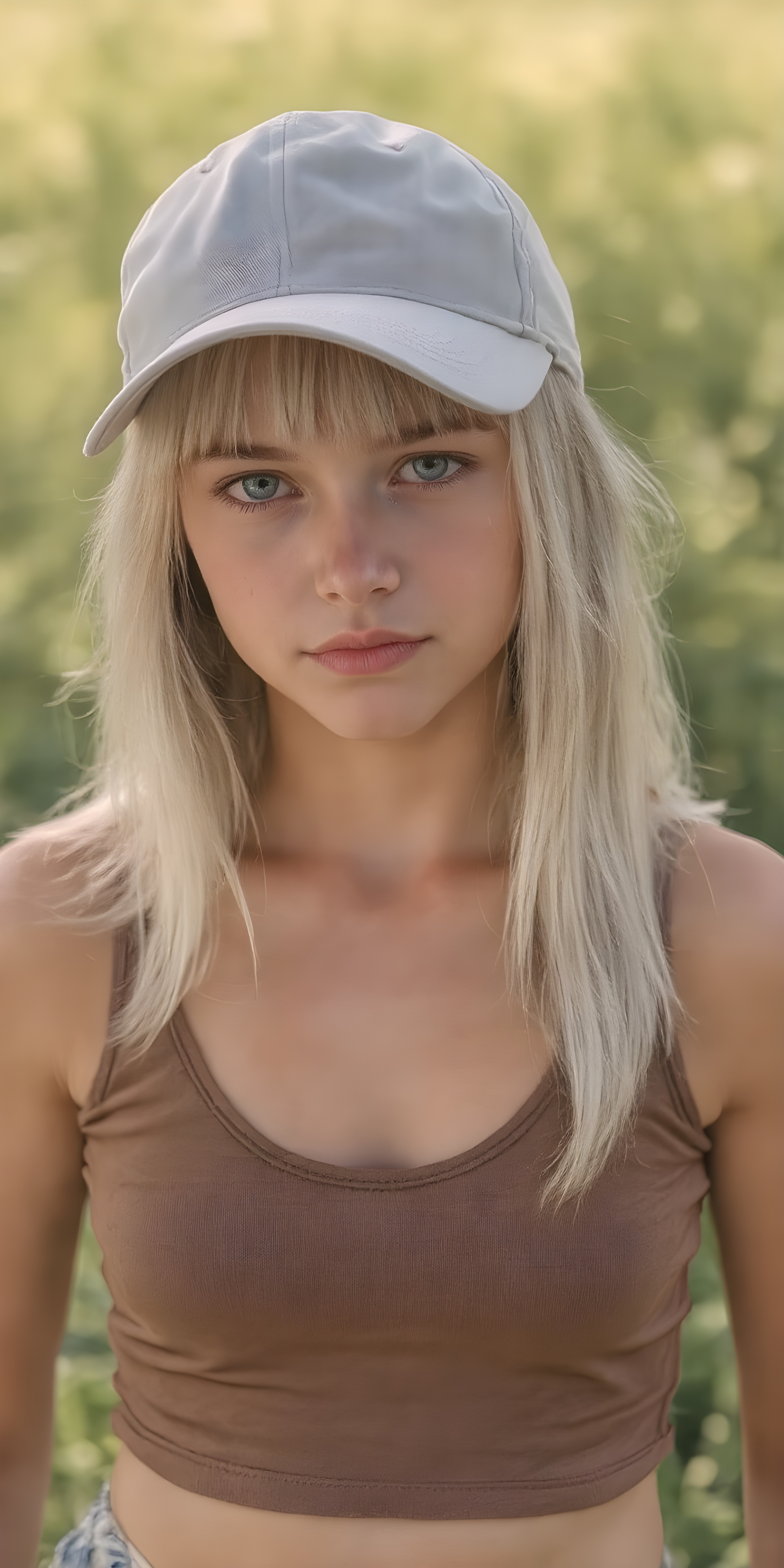 a young girl wearing a golf cap, full body shot, straight soft white hair, short cropped brown tank top, deep v-neck, fit body, detailed and realistic, sunny green background, looks seductive to viewer
