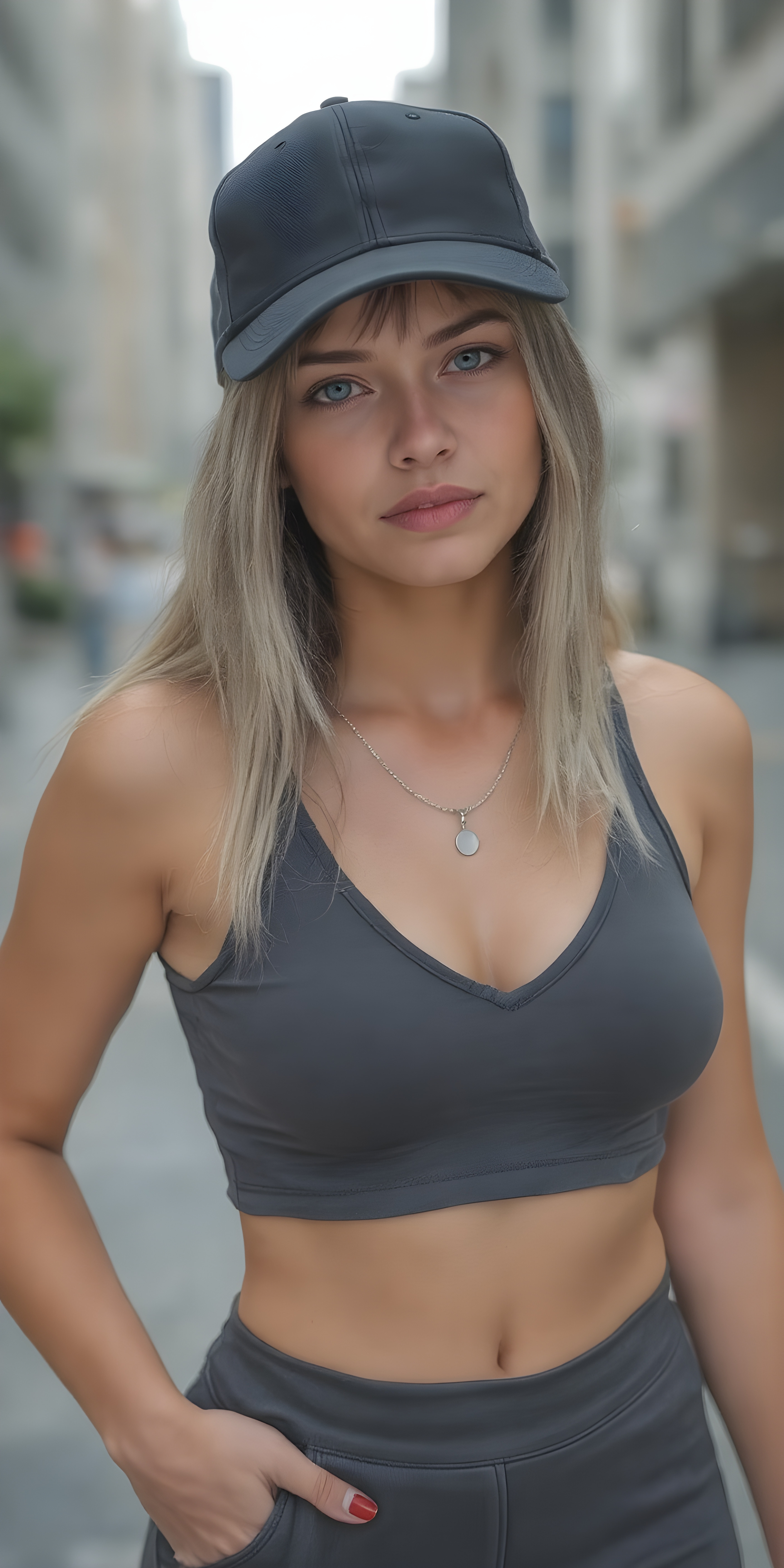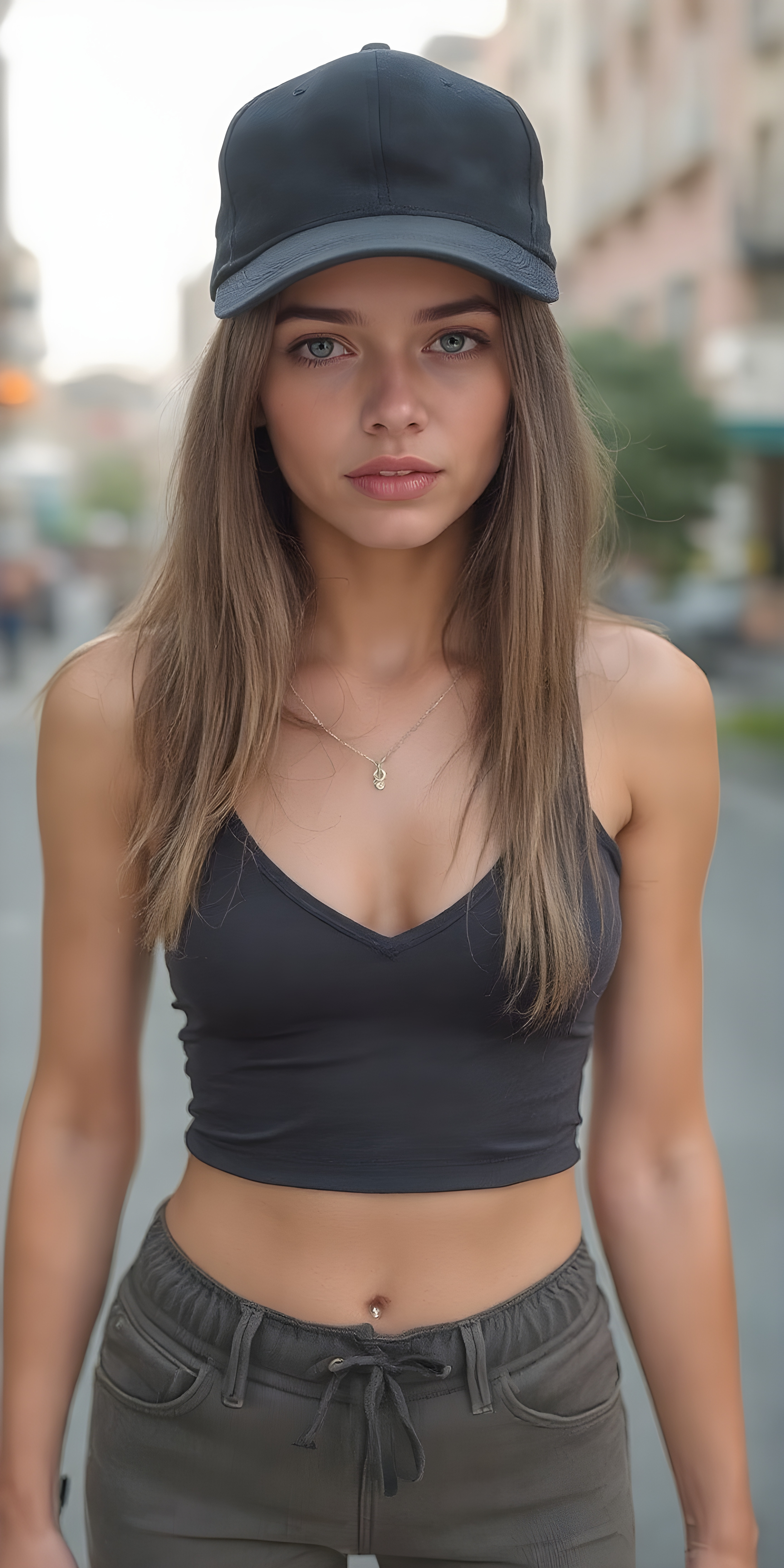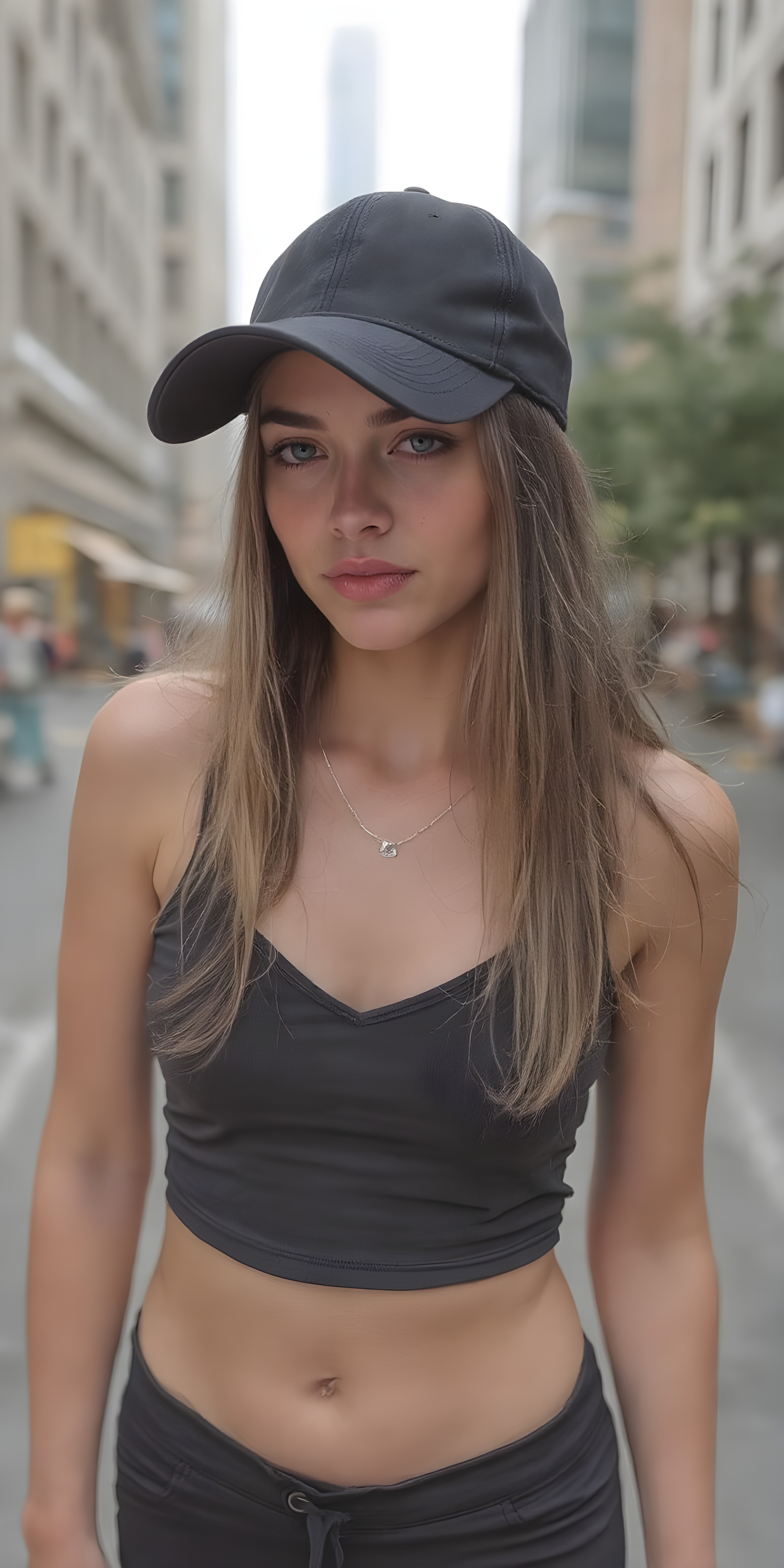 a young stunning gorgeous busty skater girl wearing a black baseball cap, full body shot, straight soft hair, short cropped tank top, deep v-neck, short sport leggins pants, fit sleek body, full kissable pink lips, detailed and realistic, in the street of a city, silver fine necklace, belly button