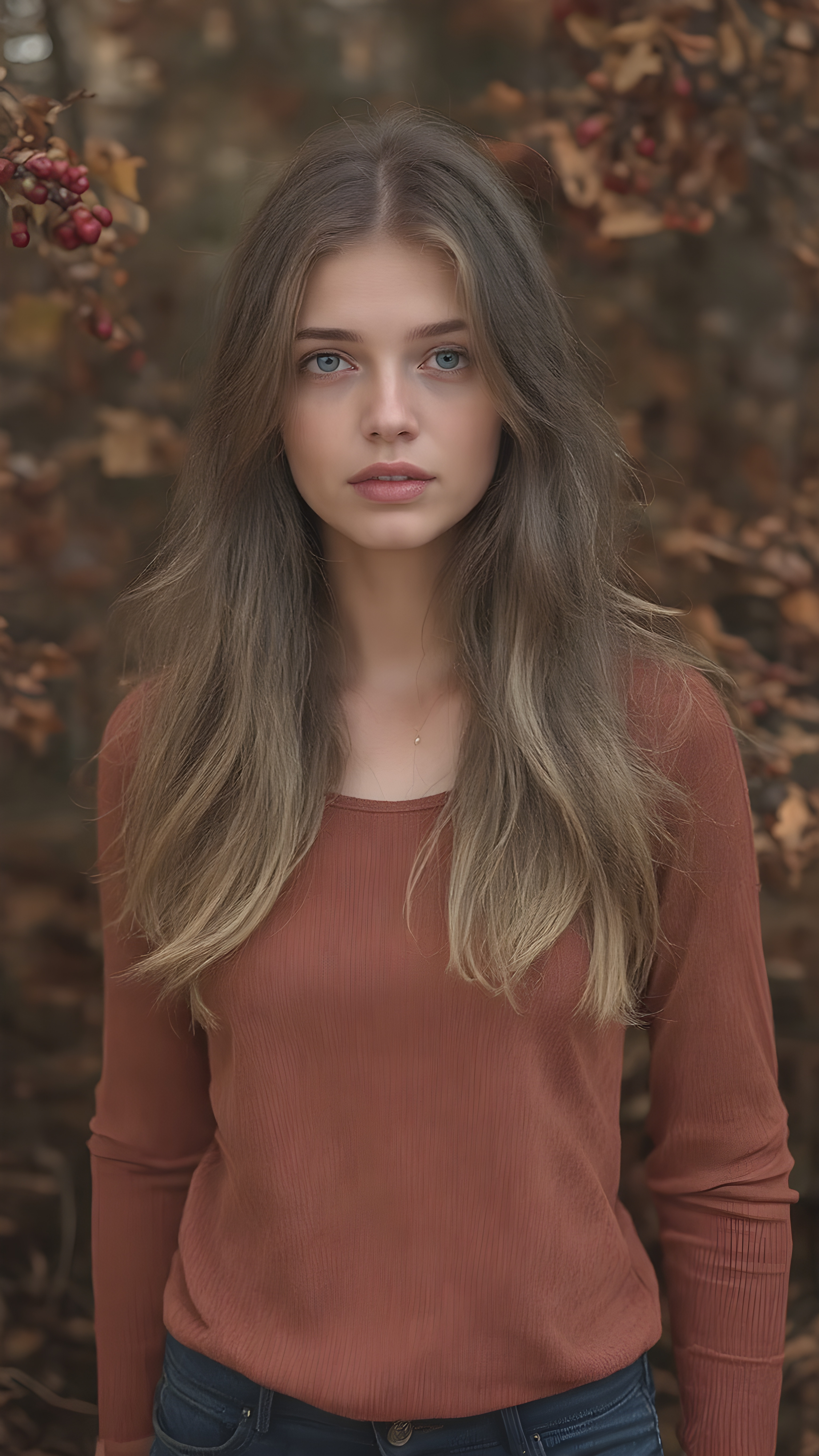 a (hyper-realistic, highly-detailed, vivid ((full-body portrait)), with ((warm highlights)) ((soft, natural light)) ((crisp details)), featuring an (extremely beautiful, mature, slim, trim, toned upper body), ((full body)), with ((dark, muted red and white berries)) that give off an (autumn glow). The scene evokes a sense of (serene, natural beauty) that makes you feel (warm and cozy) about the world around us. An ((extremely beautiful young girl with long, flowing, thick, wavy light brown hair)), with ((natural skin)), ((detailed skin)), ((perfect skin)), ((matching eyes)), ((perfect eyes)), ((perfect lips)), (((wearing a form-fitting thin, mid-neck, long, sleek, light brown shirt)) that gives off an (autumn spirit), paired with ((perfect, detailed, warm light brown hands)), (((standing in an autumnal forest))), where the ((red and white berries)) are in the foreground, ((surrounded by a cozy fall atmosphere))