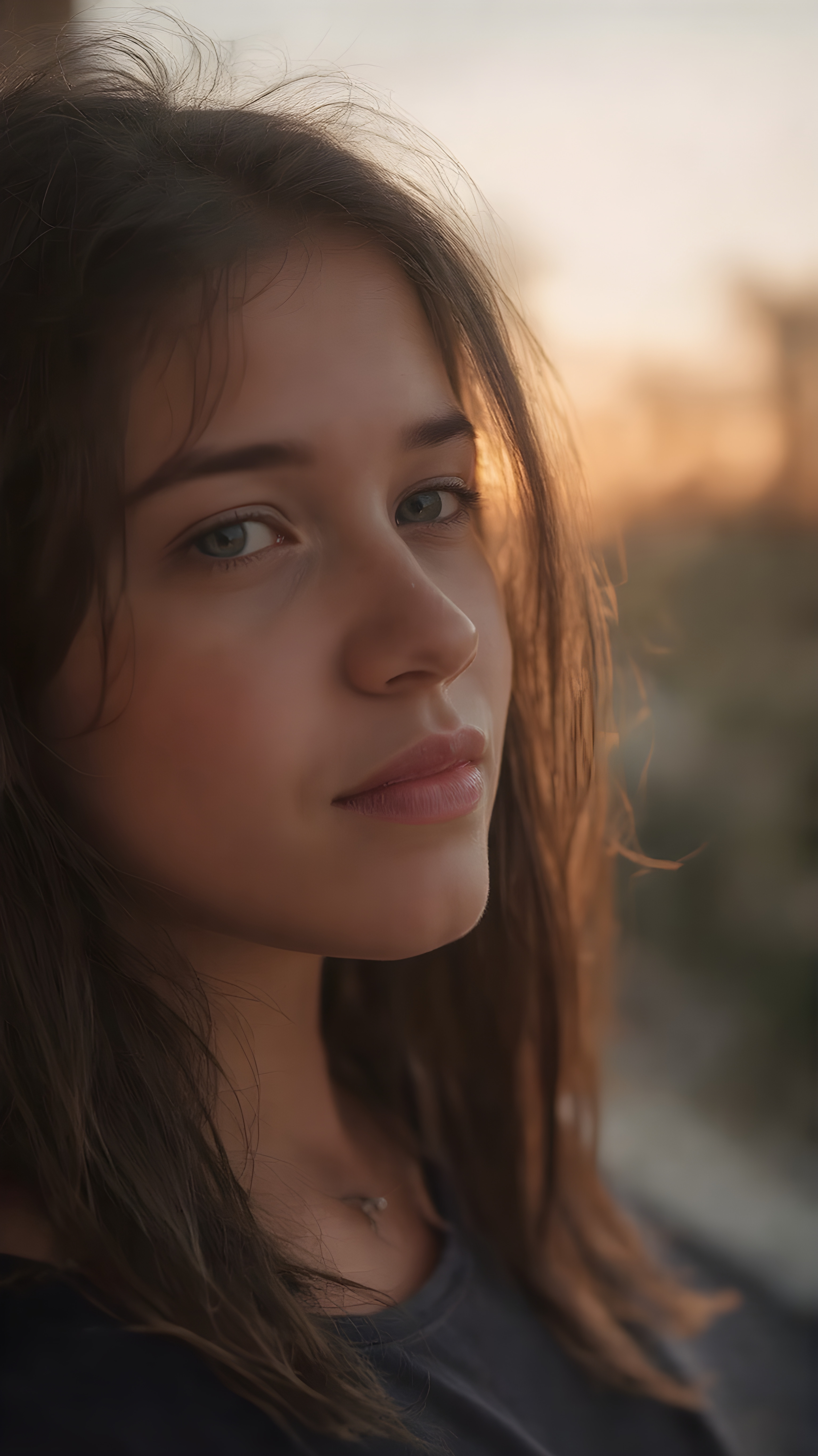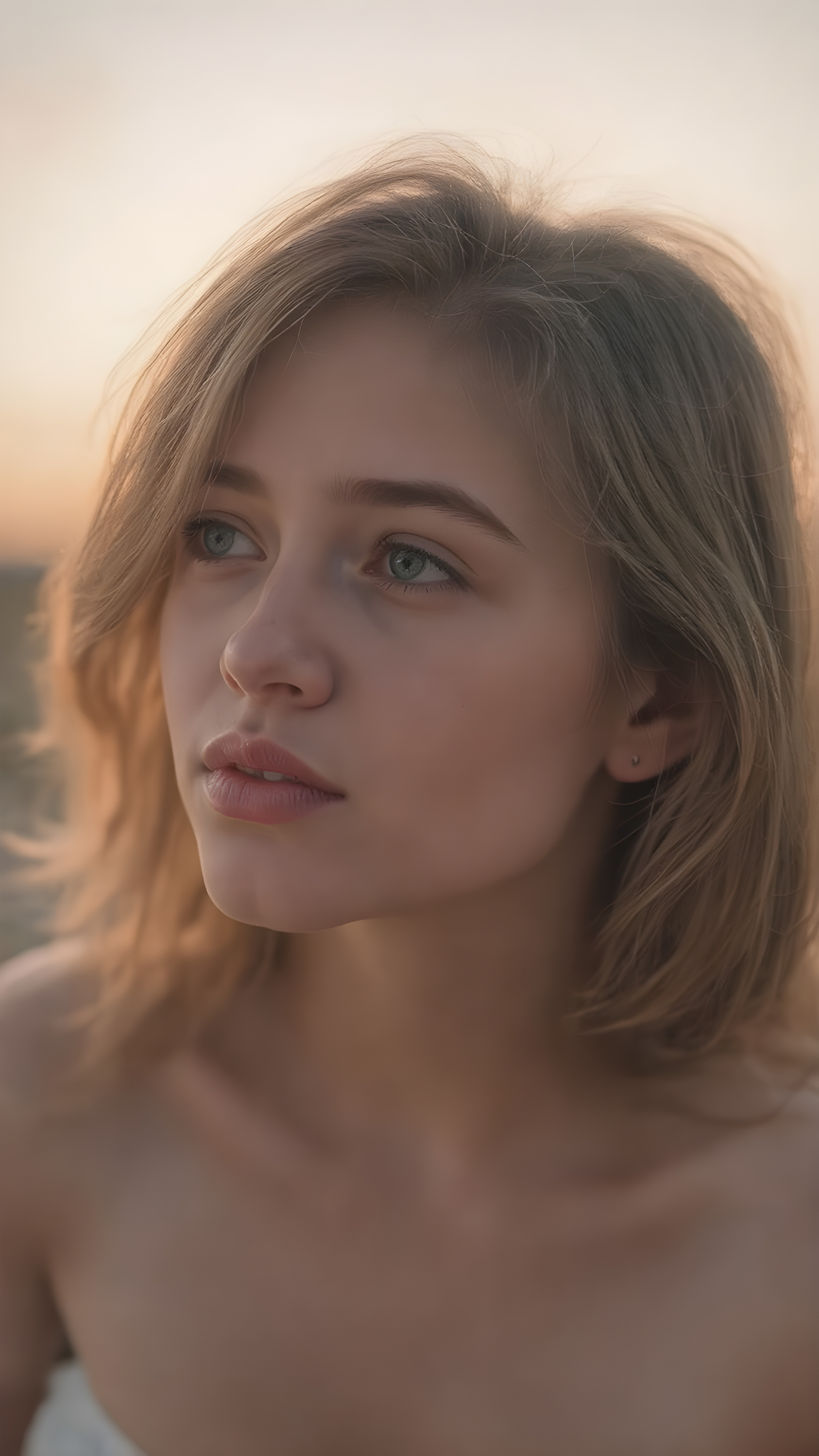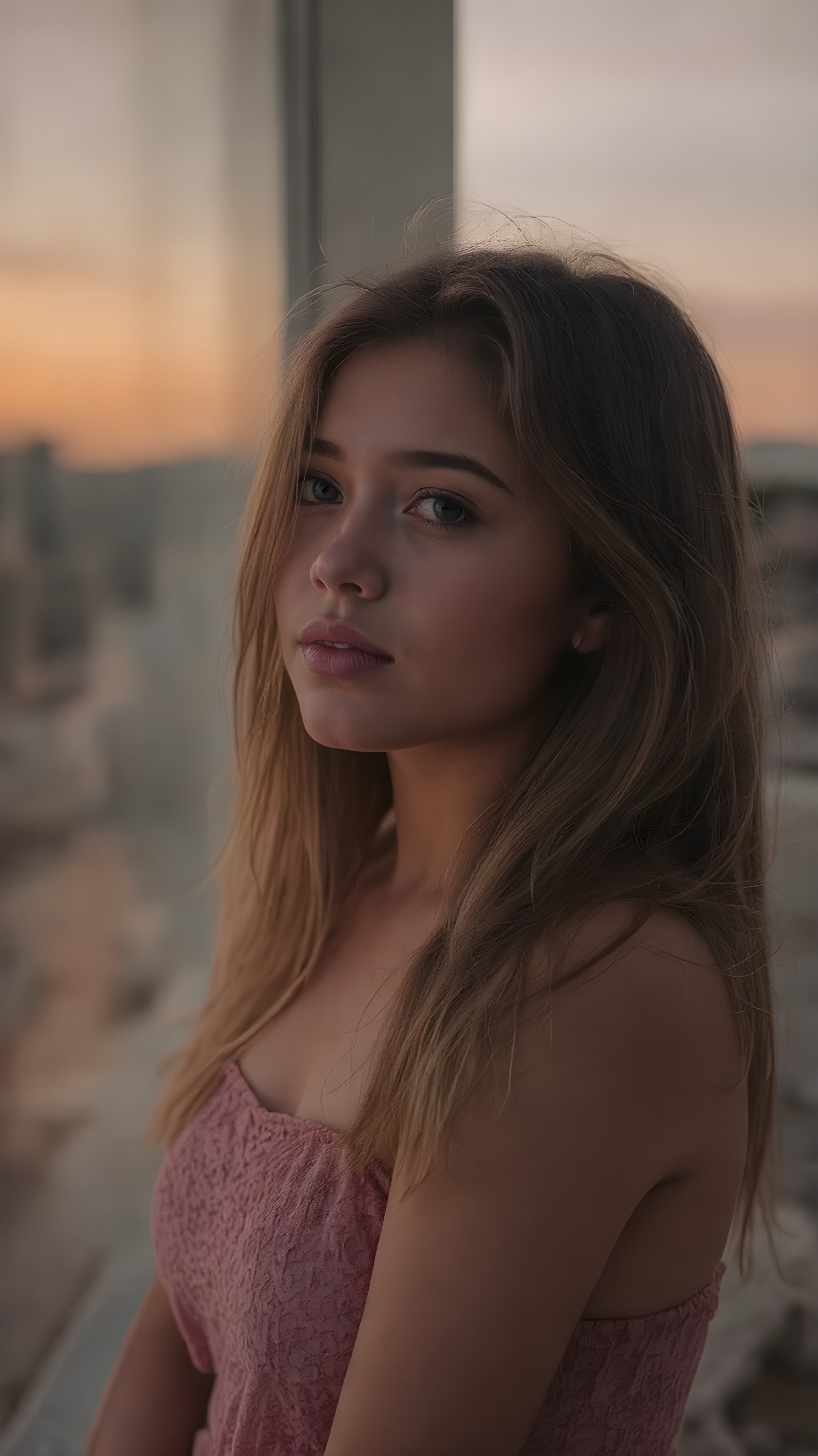 full body, a (((very cute well-busty teen girl), with a round, full kissable mouth, and a sleek, sexy, yet playful expression, poised in a (((cute, side-view position))), looking out at a (softly glowing dusk sunset) that casts an ethereal glow across her face; she’s in a (highly detailed, ultra realistic, 8K, UHD image) that exudes the essence of a (cinematic romantic drama)