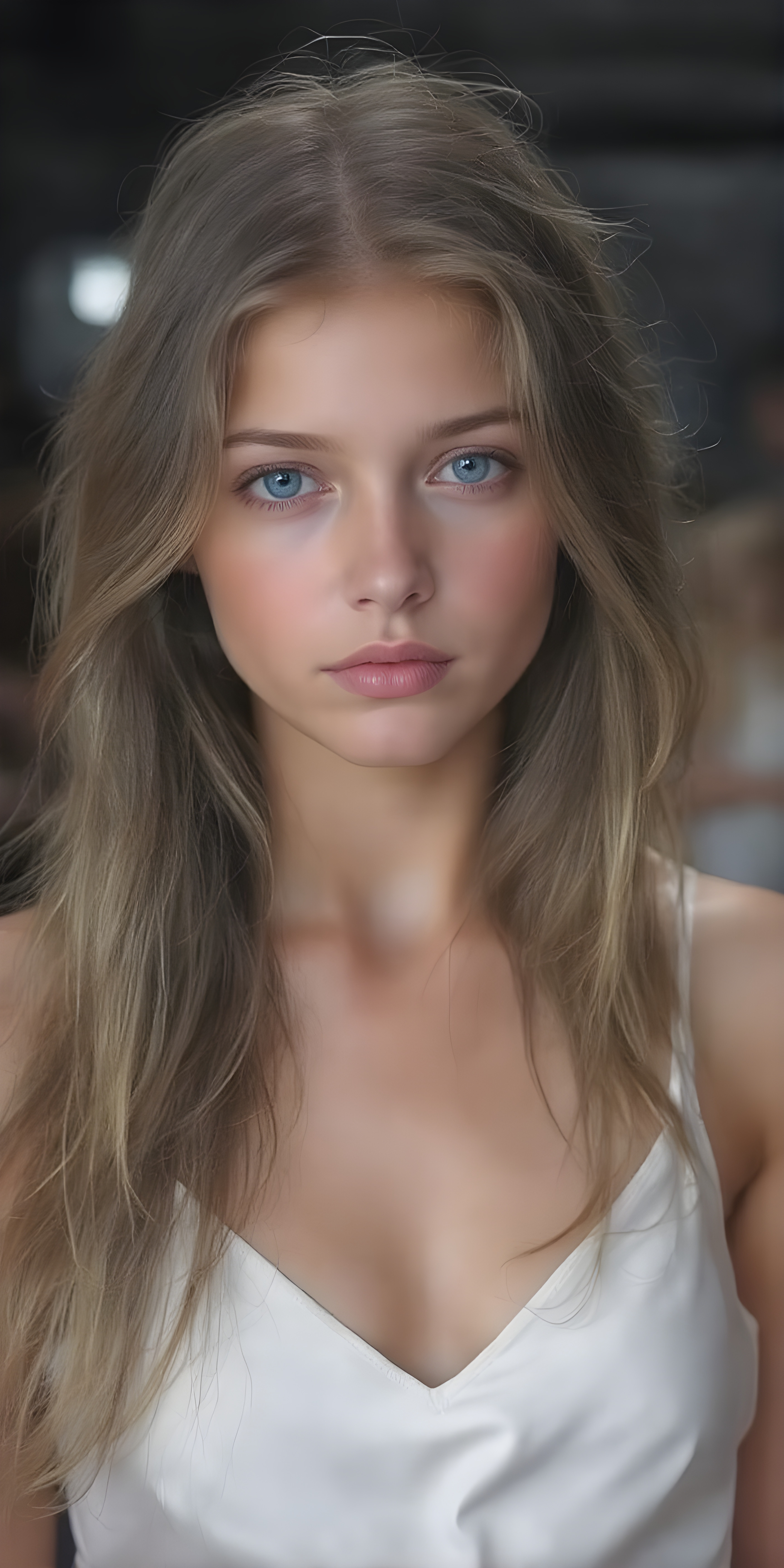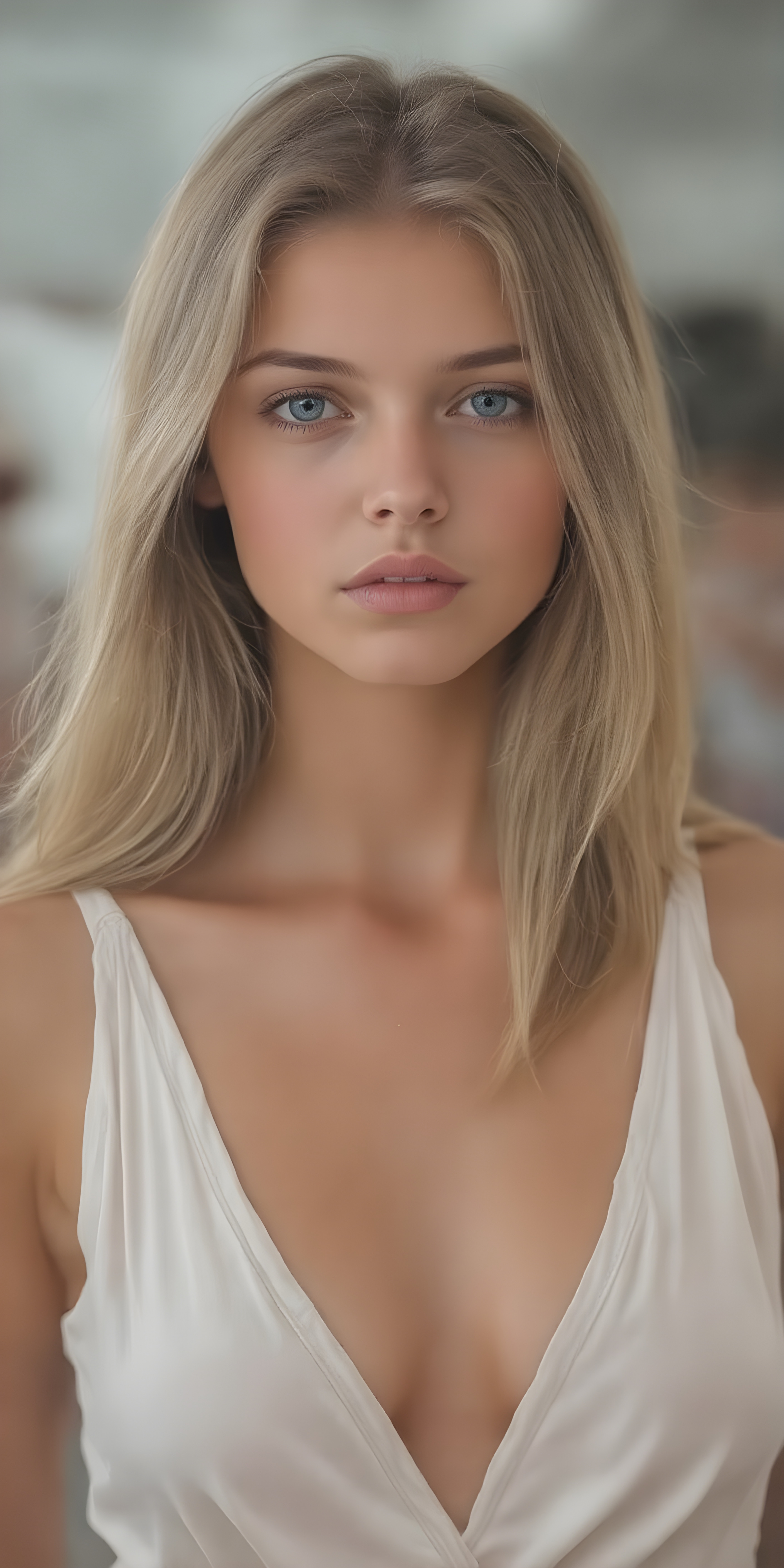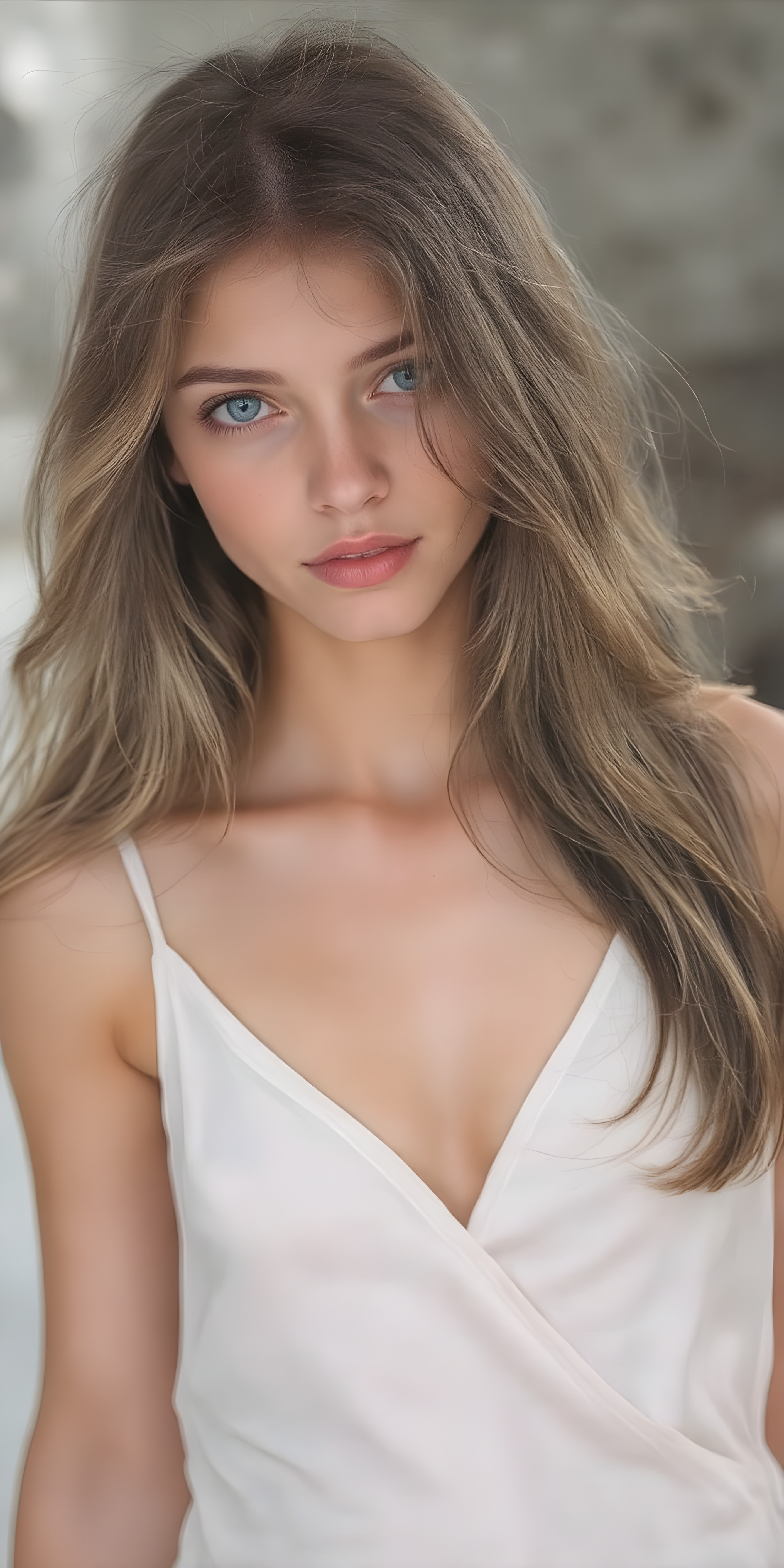 stunningly beautiful, high-resolution image, in a fine art style, reminiscent of a classical painting, showcasing a young adult girl with silky smooth skin, shiny deep blue eyes, and long soft dark blond hair, dressed in a silky white tank top and deep v-neck, the dress cascades elegantly over her upper body, highlighting her graceful figure. The artist’s meticulous strokes capture the girl’s youthful features, delicate yet confident expression. The painting embodies a dreamy, enchanting mood, evoking a timeless allure. (((Full body))), center position, with a softly diffused light, perfect curved body, busty