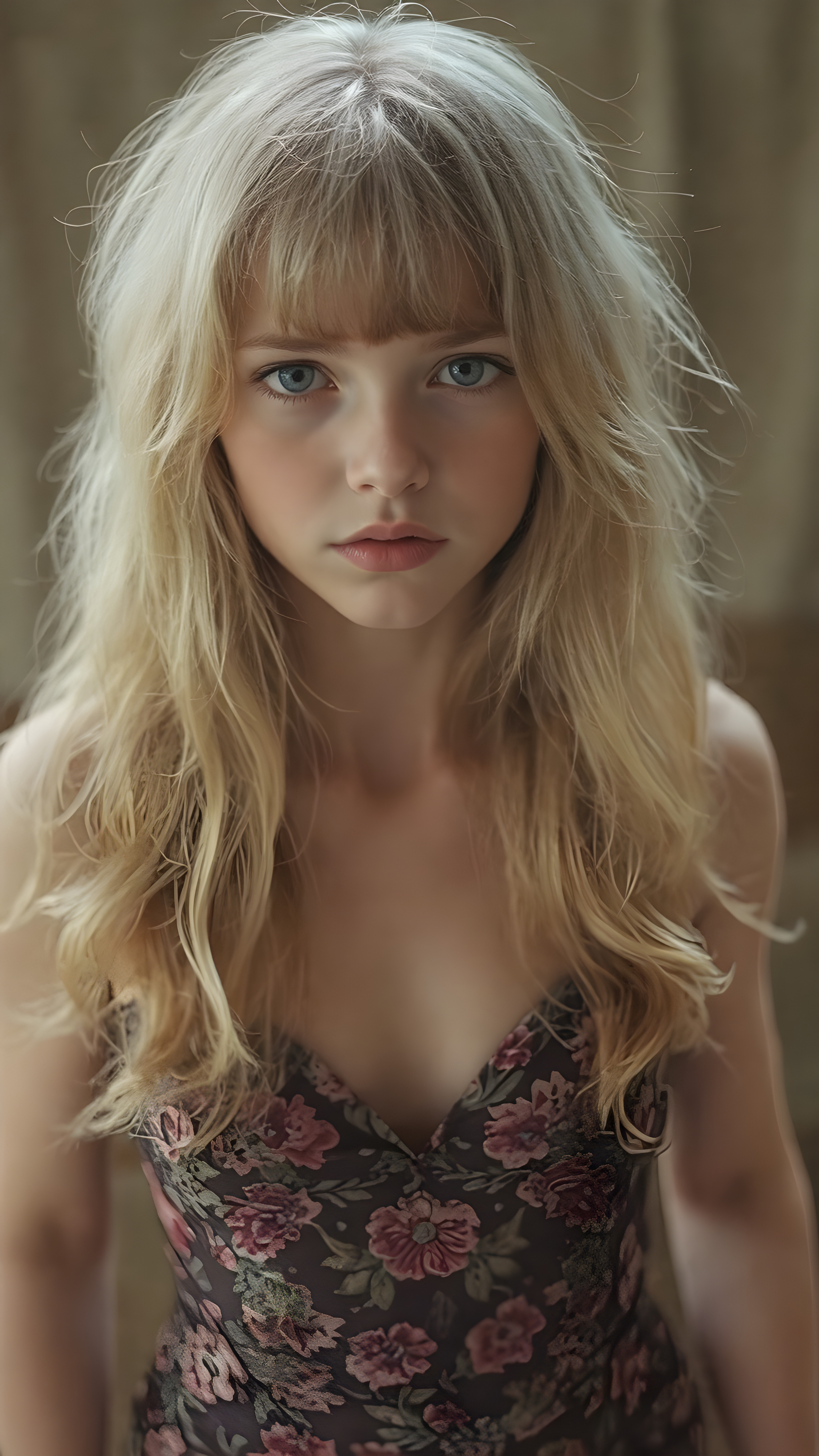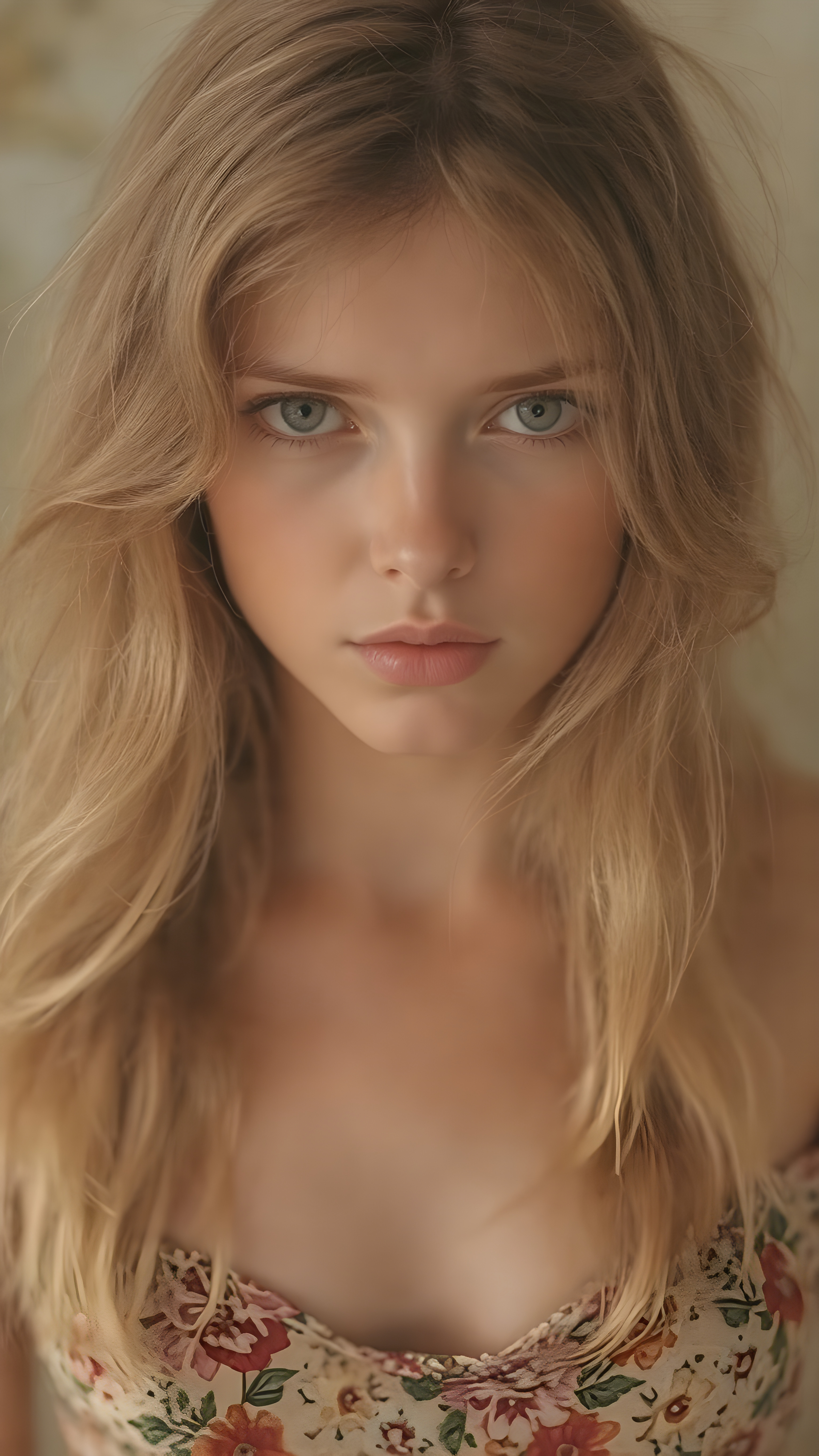 (super realistic upper body shot, 1970)) a young adult hippie girl with soft hair, deep black eyes and pale skin. Her soft hair falls over her perfectly shaped body and shines, looks seductive in the camera, she wears a one-piece suit with a floral pattern, stand in front of the viewer