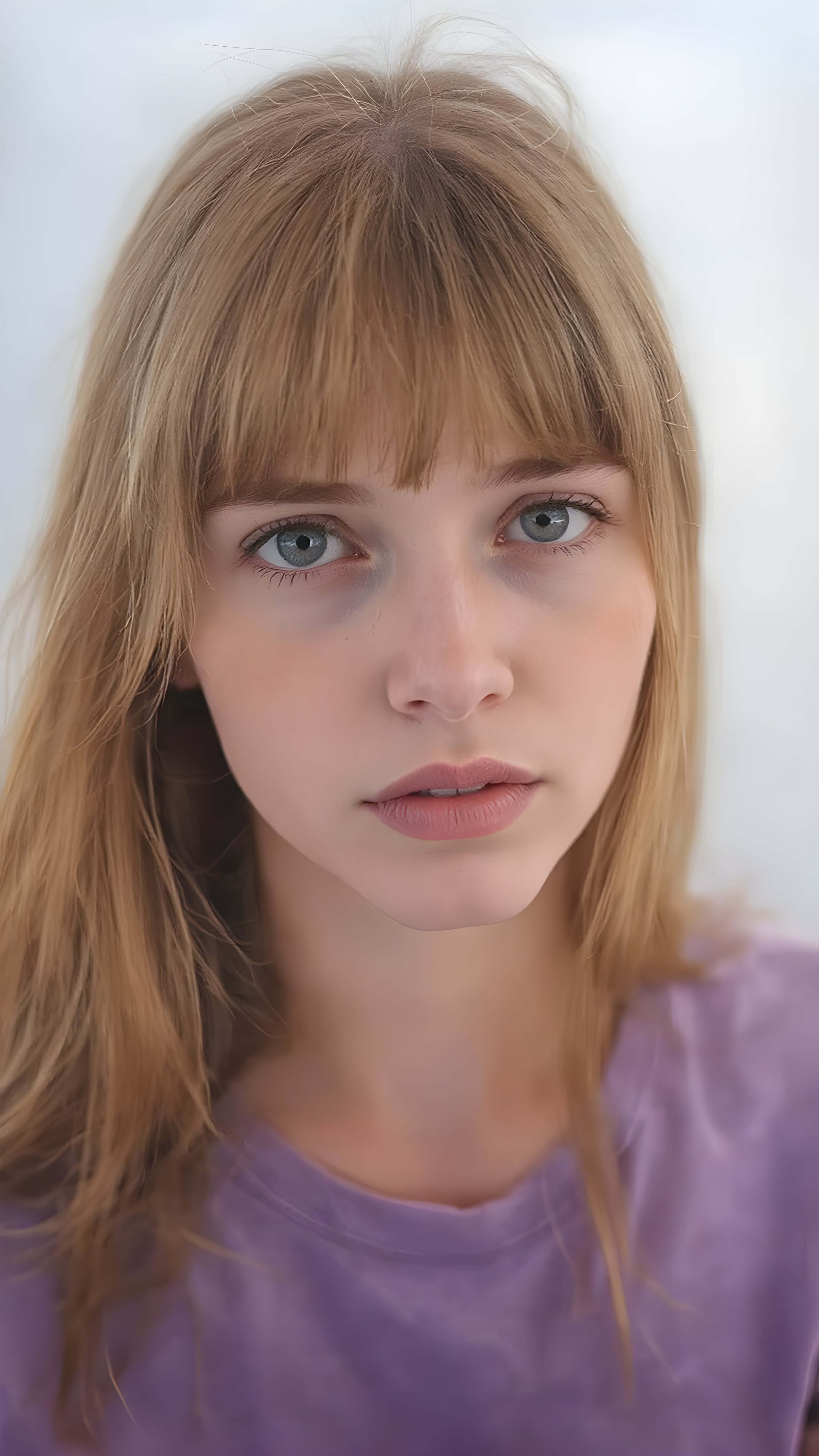 visualize a (((really detailed young teenage girl with long, soft straight red hair framing her face in classic bangs, her lips looking seductively, ((dressed in a plain violet t-shirt)) that accentuates every curve of her stunningly beautiful form, against a backdrop that suggests an ethereal mist