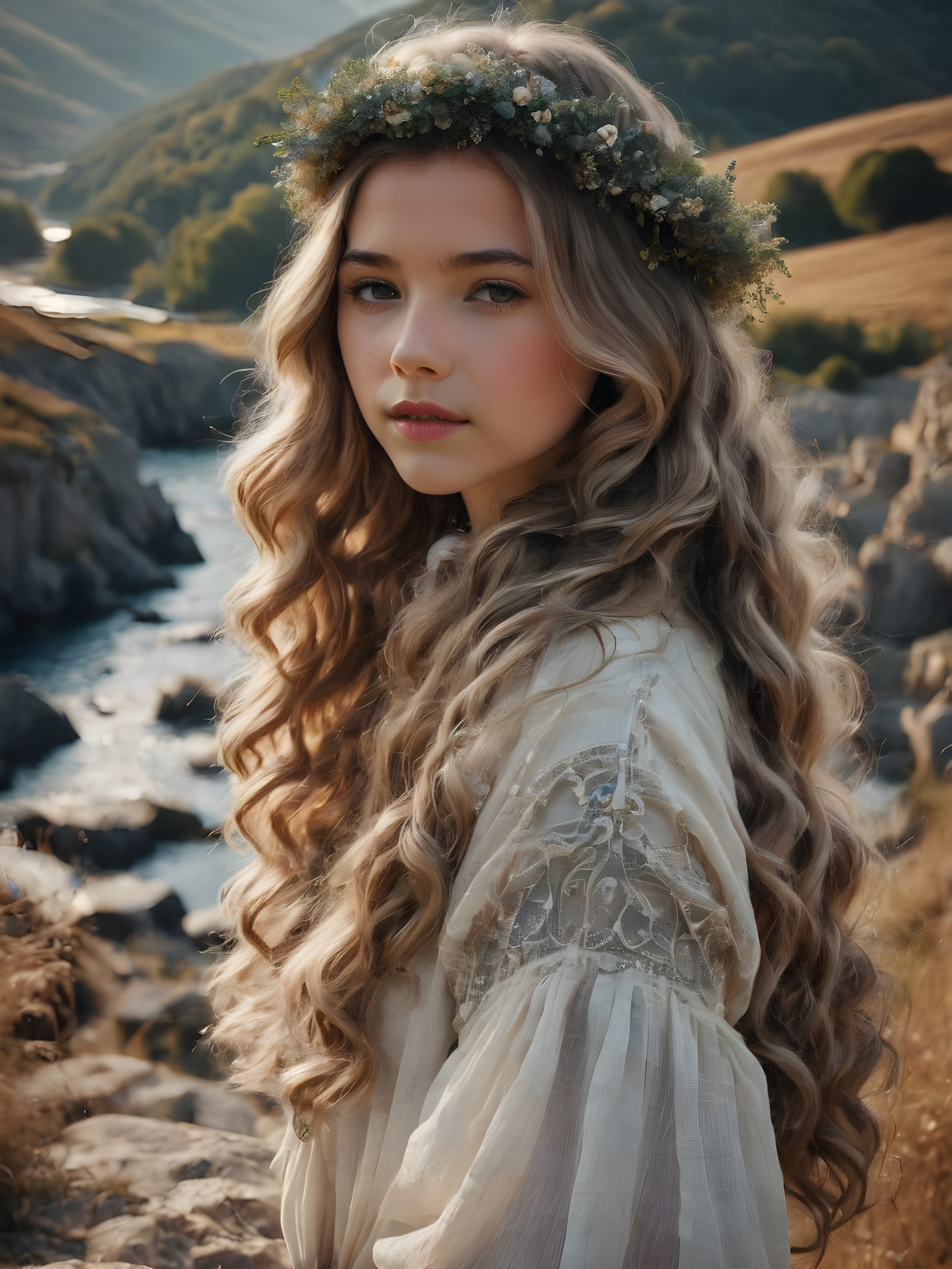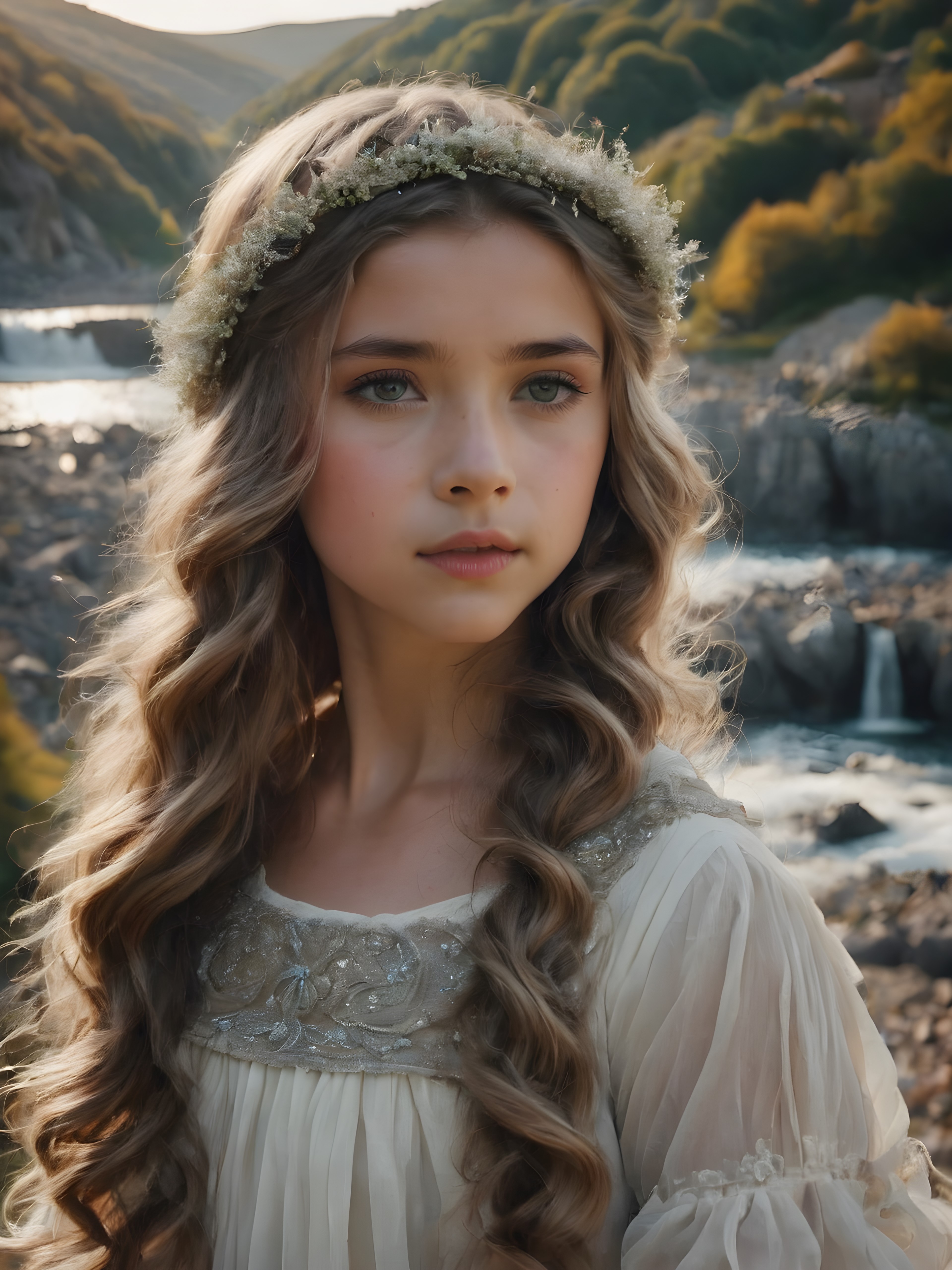 an ethereal (((young girl))), with flowing hair and facial features that convey a sense of otherworldliness, dressed in a ((fantastically detailed outfit)), surrounded by (mysterious patterns and colors) that give off an air of magic and wonder