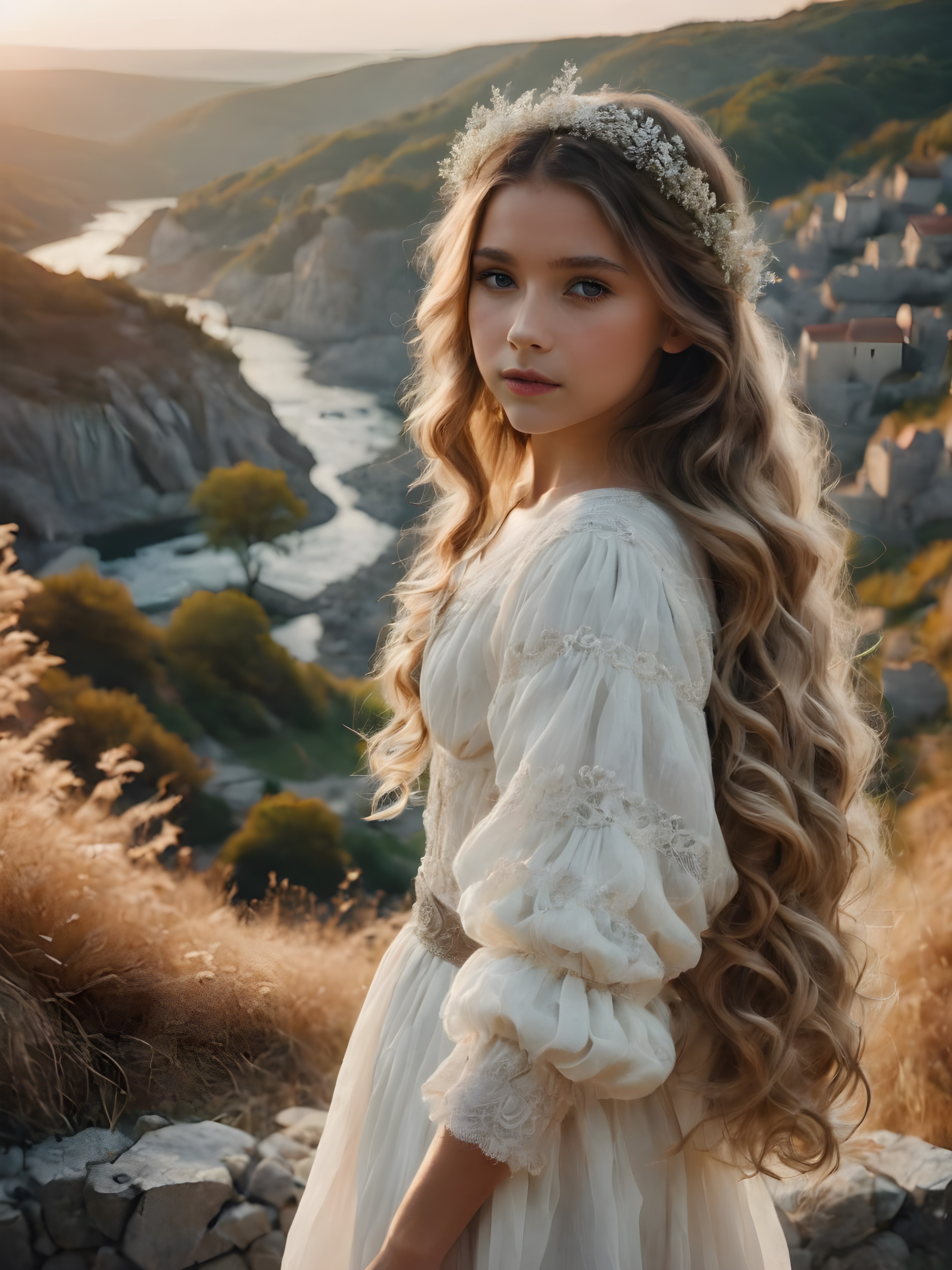 a (((small, young girl))), her hair in (((long, wavy locks))), with dark, striking eyes and a cap on head, exuding an air of innocence and cuteness. Her features are sharply defined, with full lips and an ethereal beauty reflective of an angelic visage. In the (((background))), a (quarry) with its distinctive contours and stone walls provide a beautifully contrasting backdrop