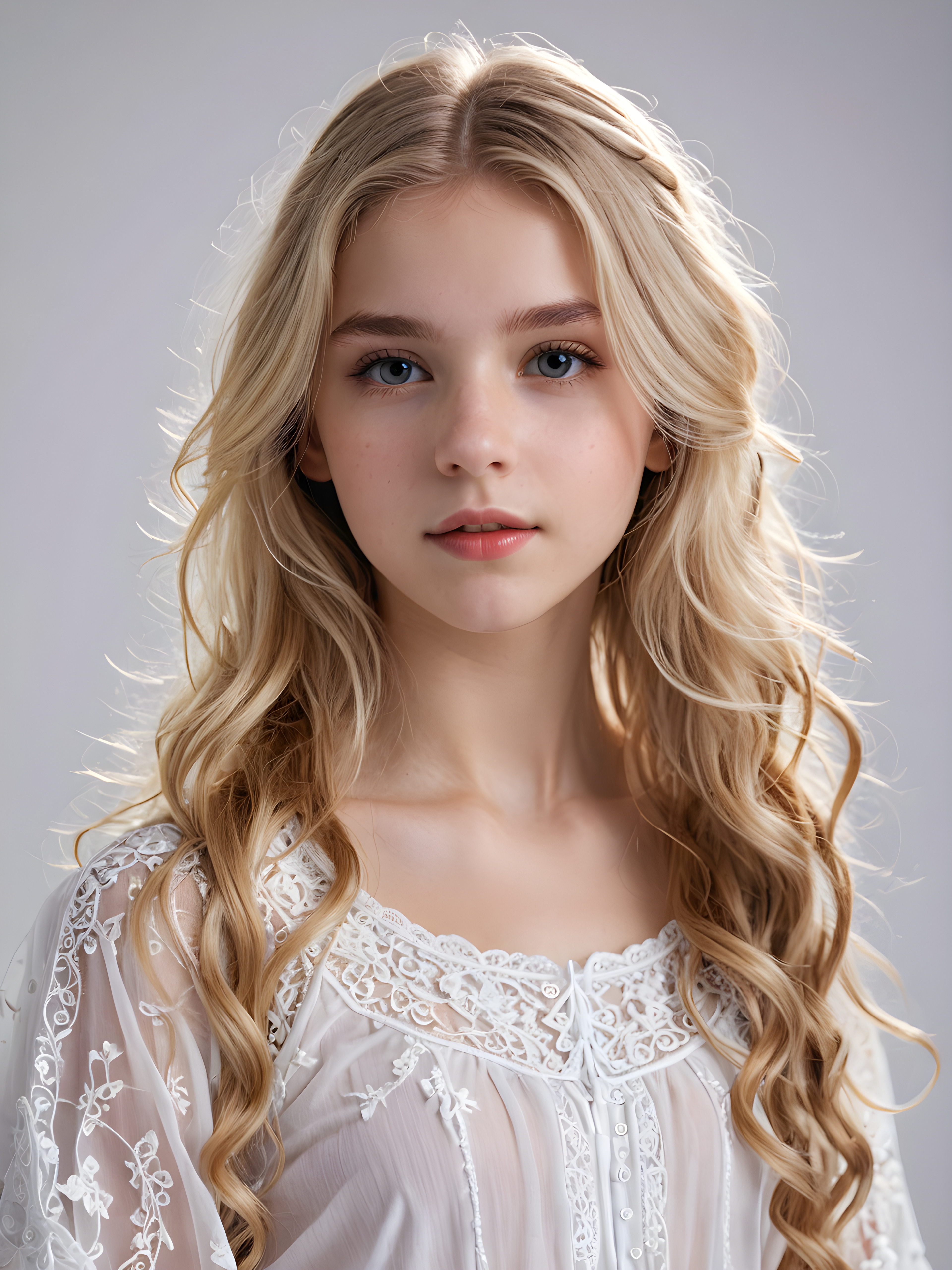 An ethereal (((young detailed teen girl))), with flowing hair and facial features that convey a sense of otherworldliness, dressed in a ((fantastically detailed outfit)), blond hair, perfect body, ((white background))