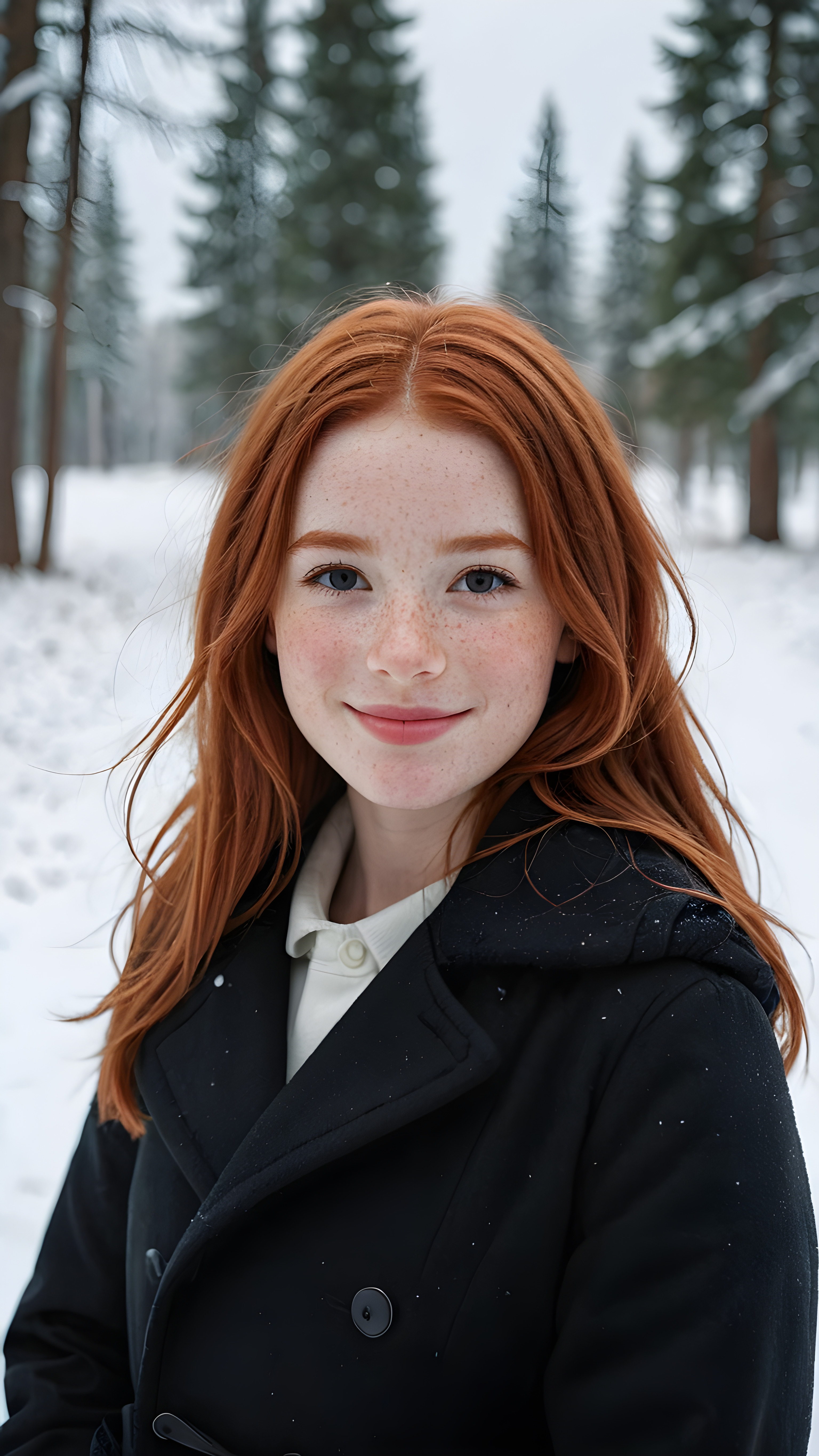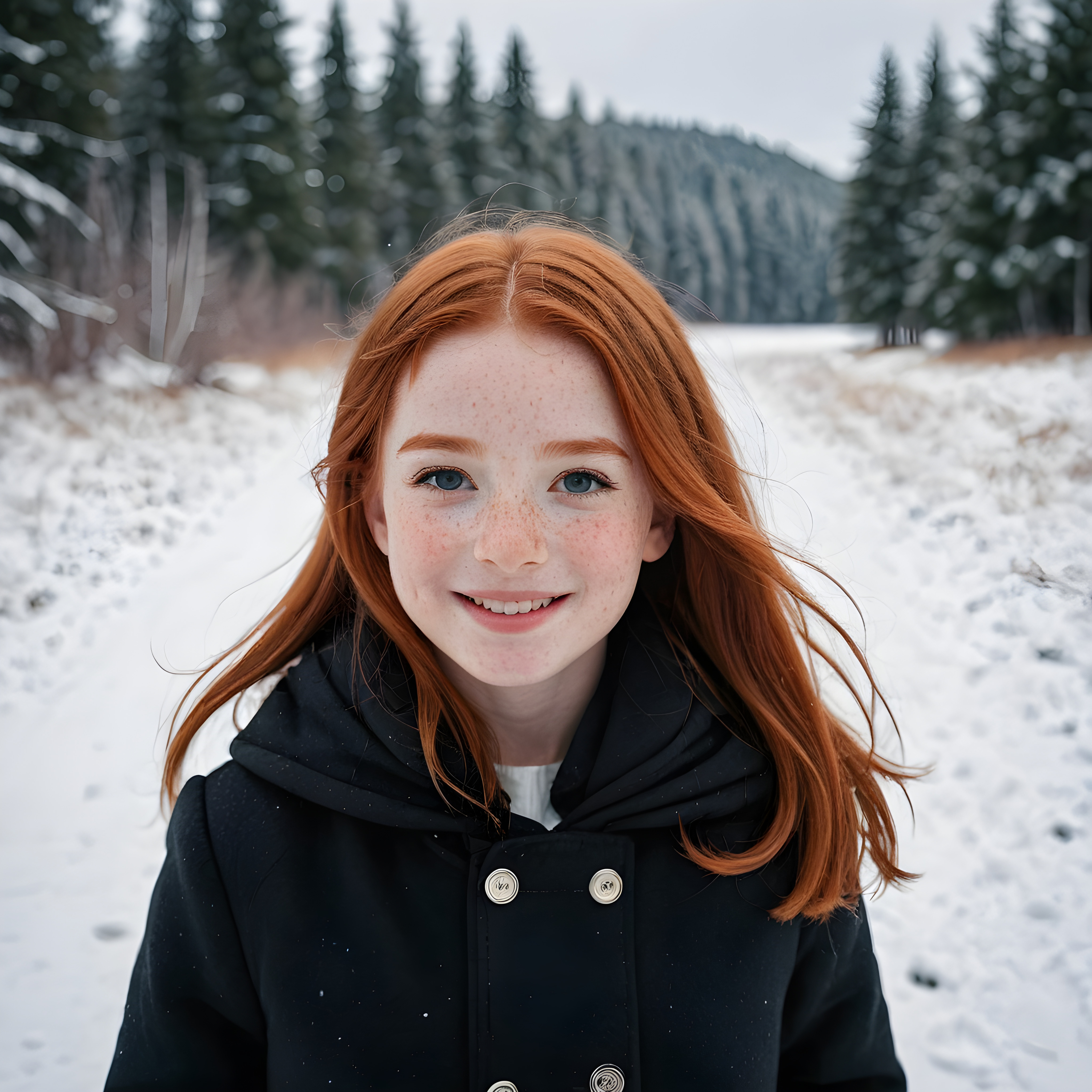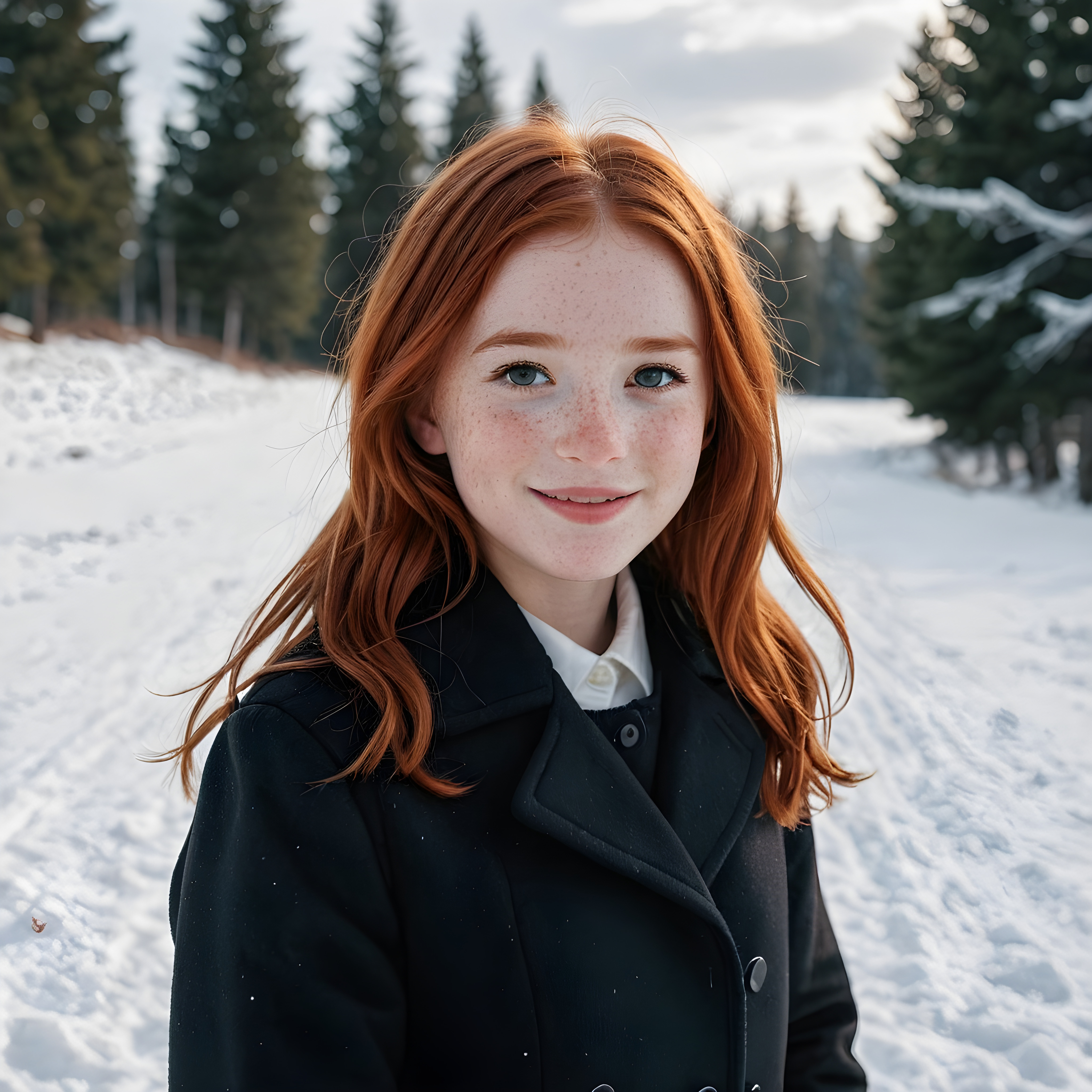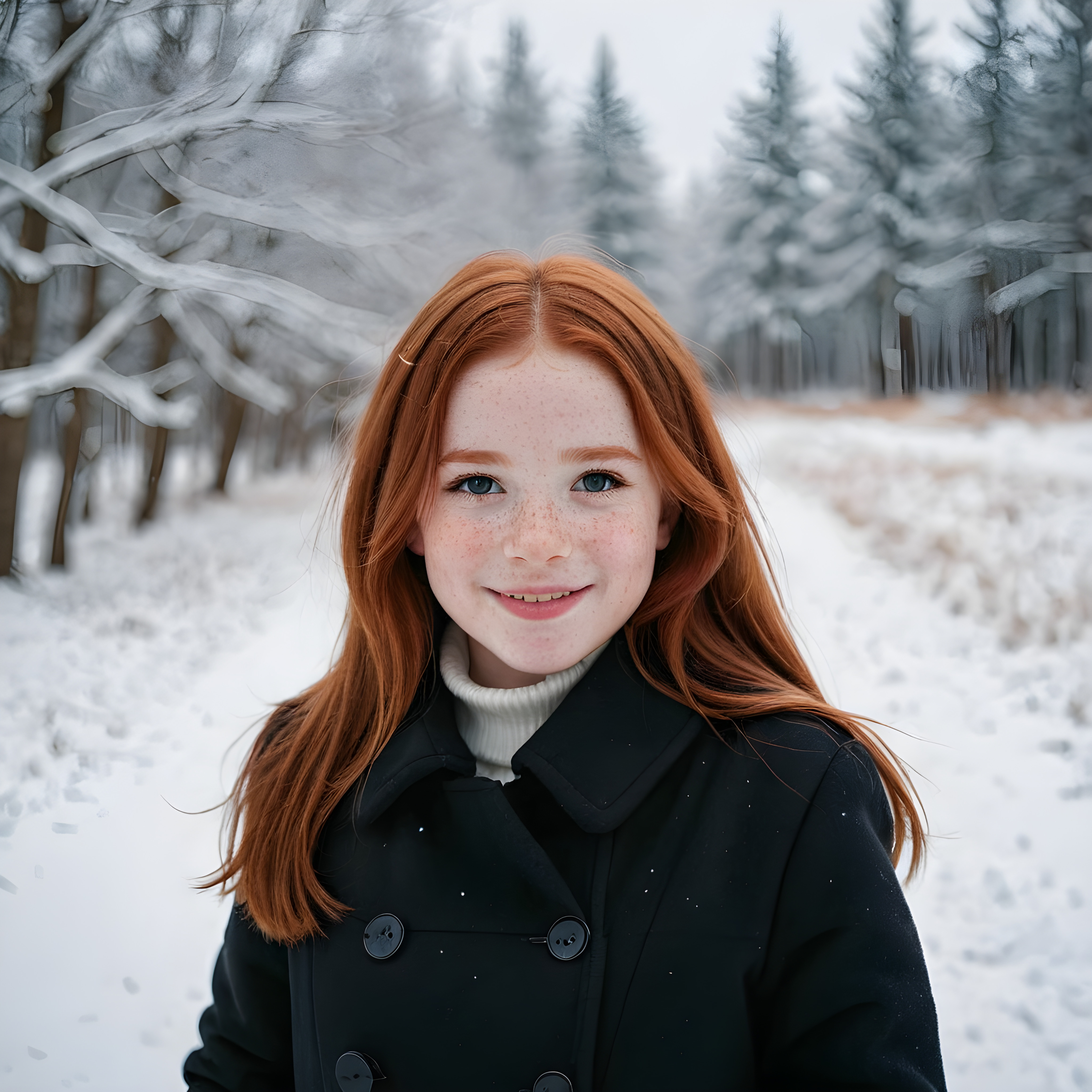 a cute little red-haired girl with freckles. Shoulder-length, straight hair. She is wearing a thick black coat and is standing in a white, snowy landscape. She is very happy and smiling. She has a chubby face. Perfect shot. Beautiful. Enchanting.