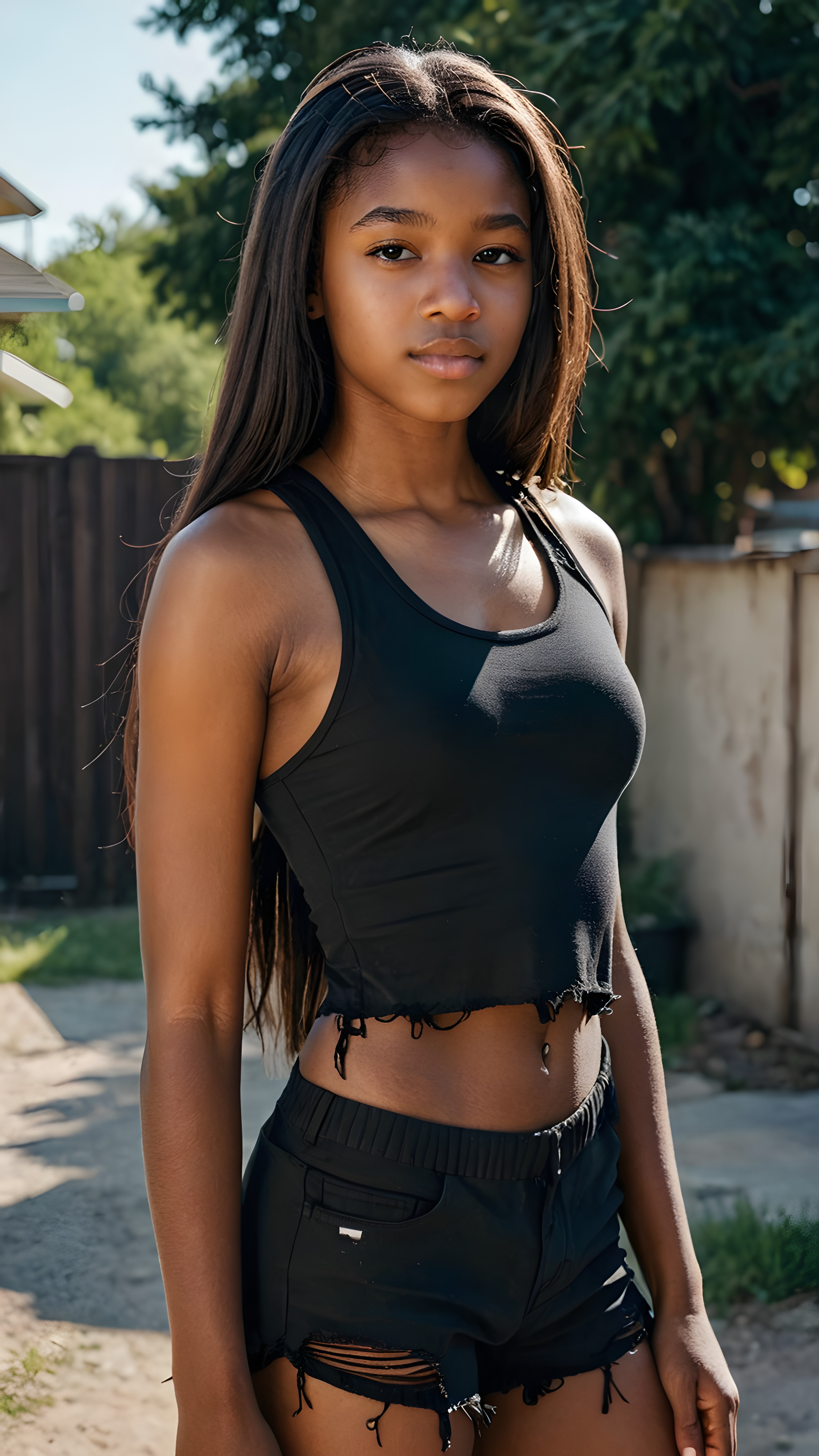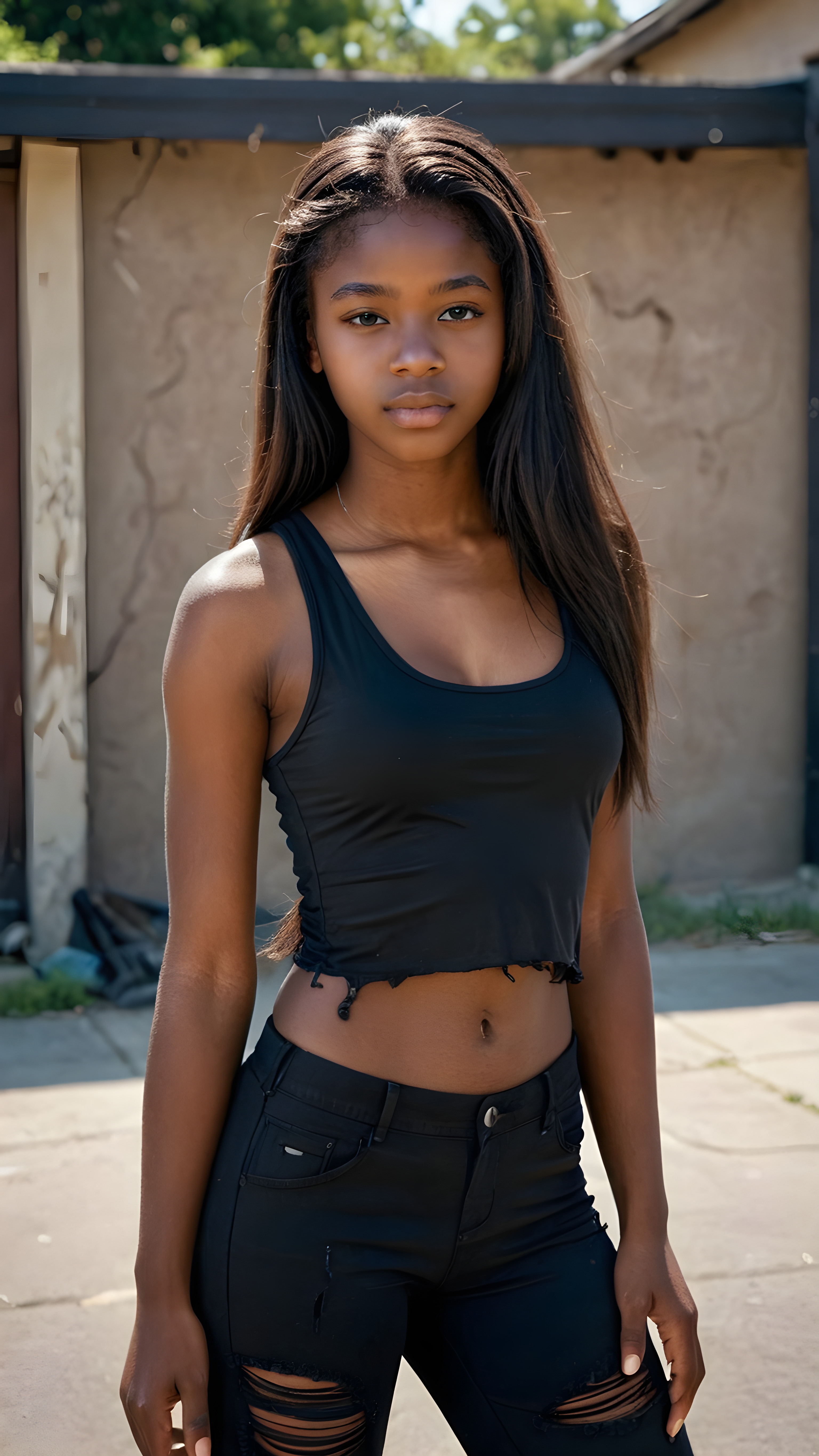 a (((dark-skinned teen girl))) with long, flowing (straight hair), aged 14, who exudes an air of seduction with a (((tattered cropped black tank top))), exhibiting a perfect, (curvaceous body)