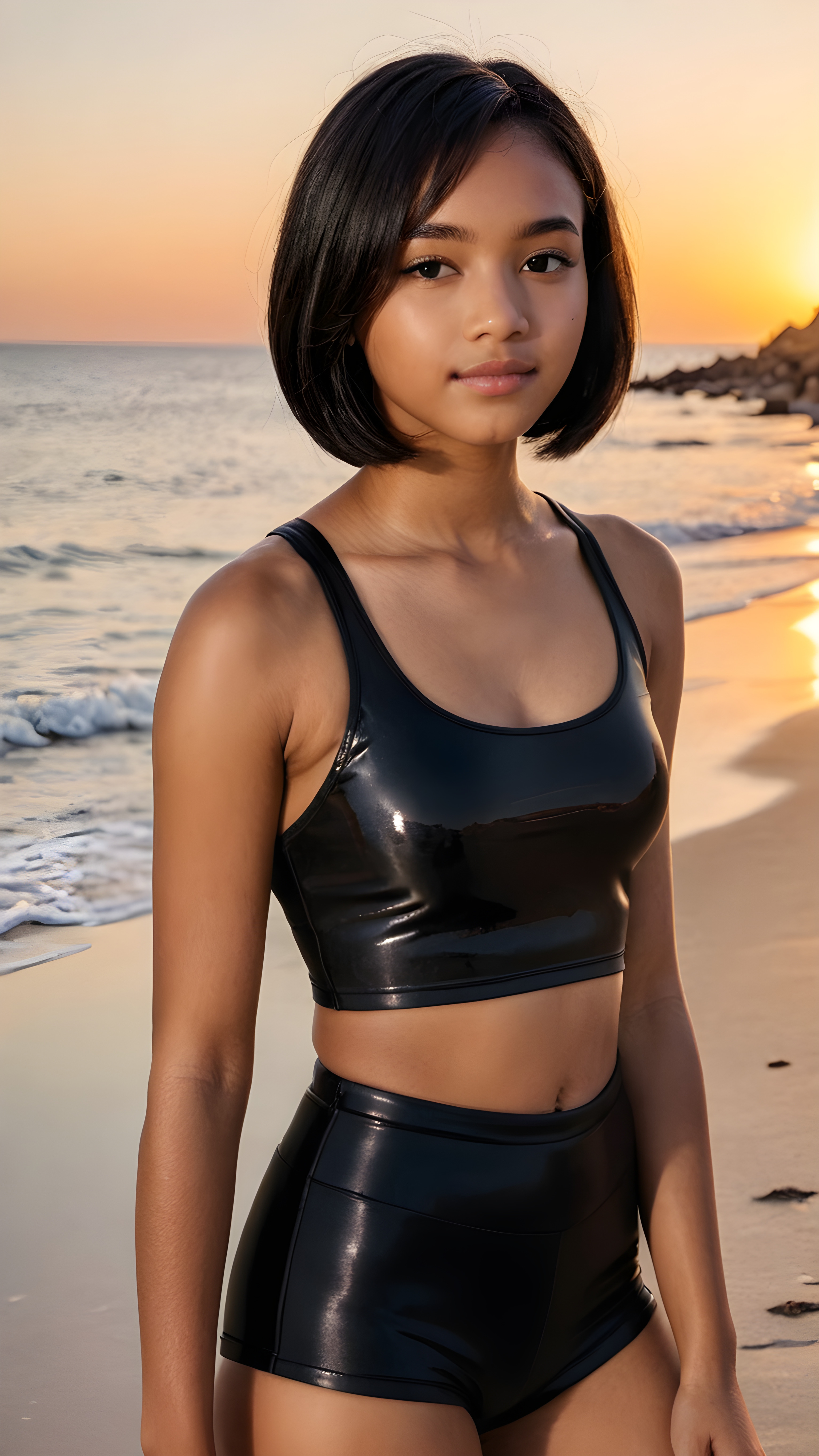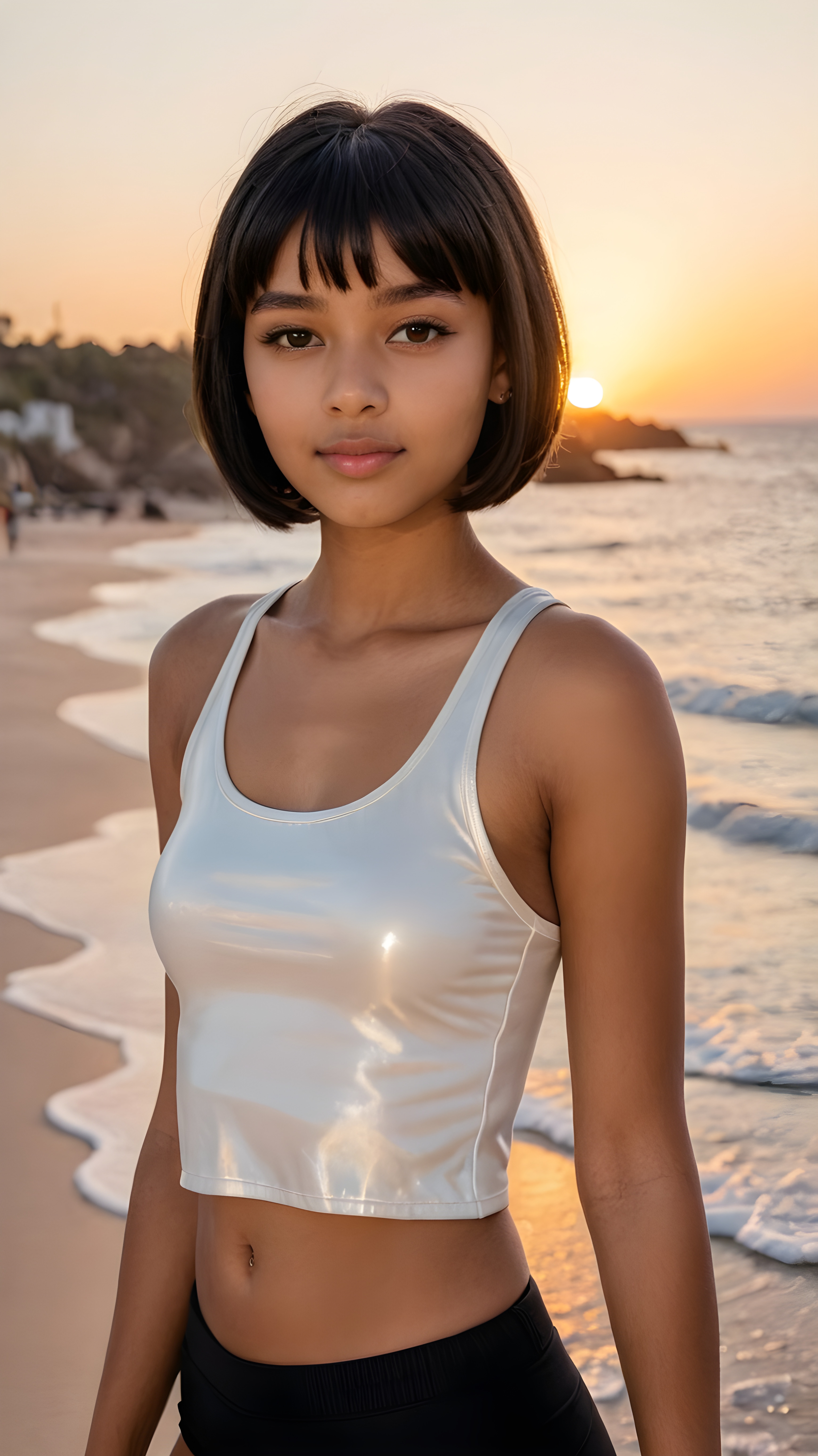 a (((cute brown-skinned teen girl))) aged 13, with a (((straight, glossy black bob))), radiating a sense of seduction as she poses confidently in a (((cropped tank top))), highlighting her perfectly curved figure against a backdrop of a (gorgeous sunset at the beach)