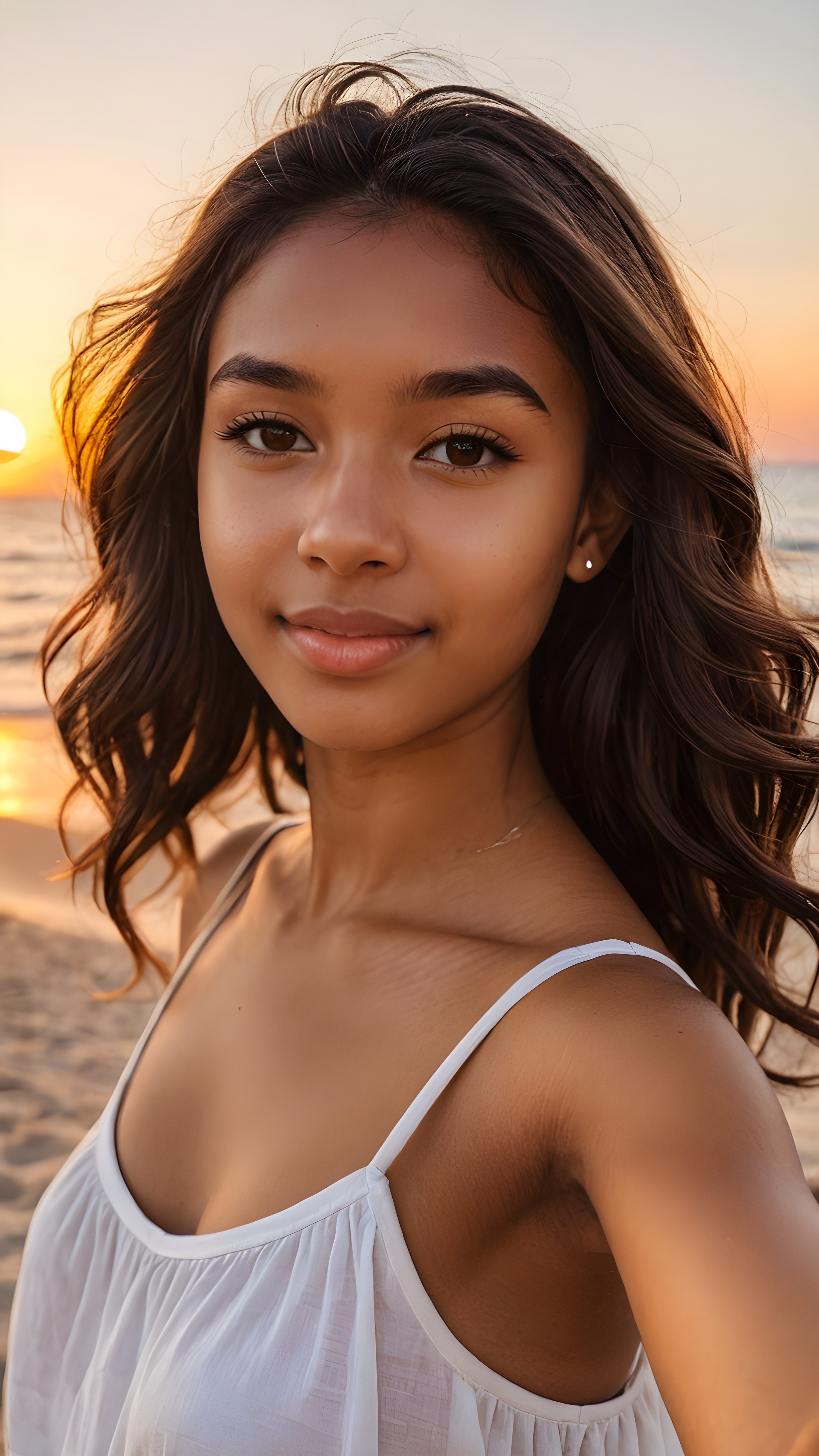 a (((cute brown-skinned teen girl))) take a selfie (gorgeous sunset at the beach)
