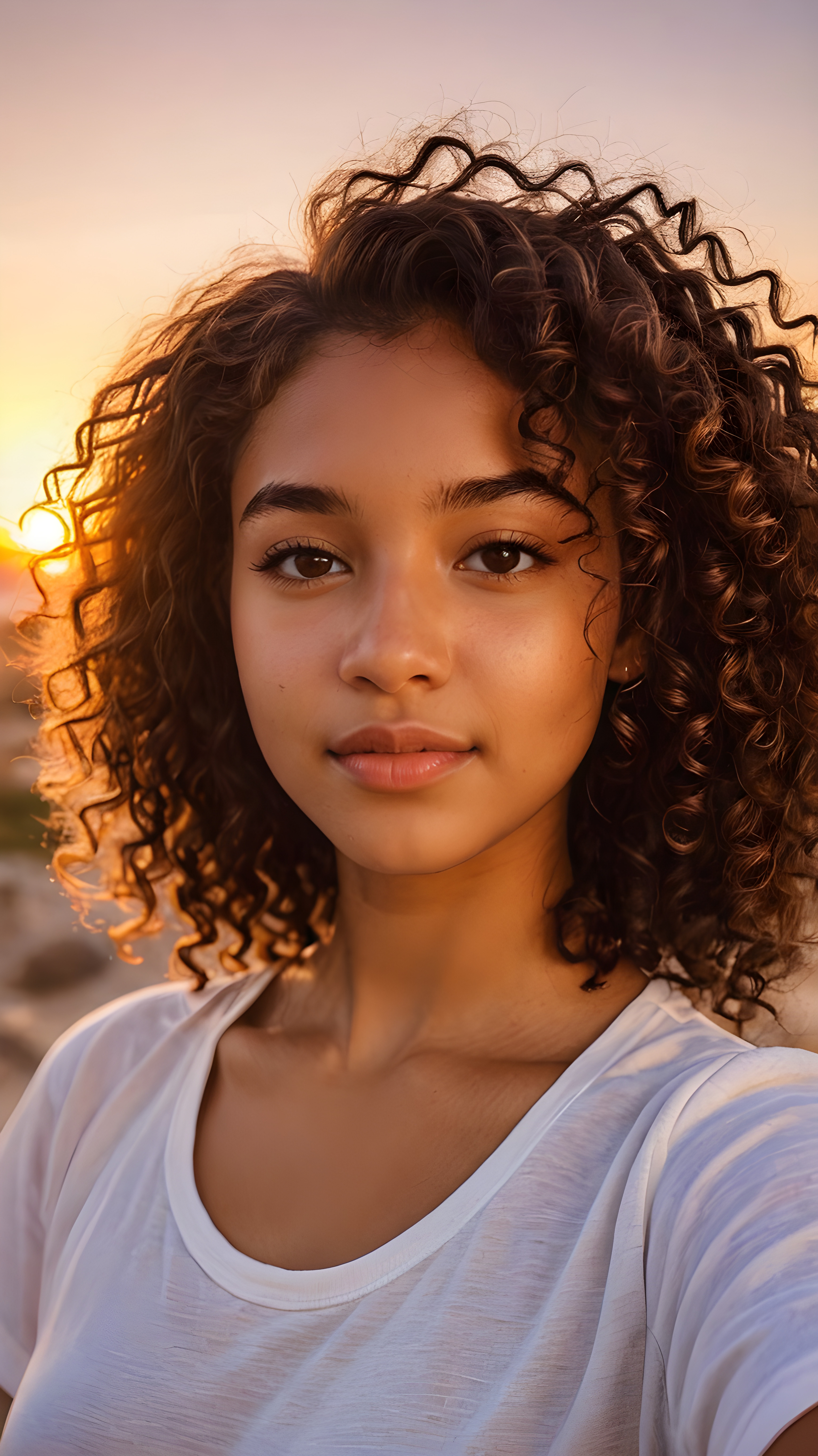 a (((cute brown-skinned teen girl))) with naturally curly, brown-toned hair and a realistically drawn face capturing a perfect moment of taking a selfie against a backdrop of a (((gorgeous sunset))), with its radiant hues bouncing off her skin