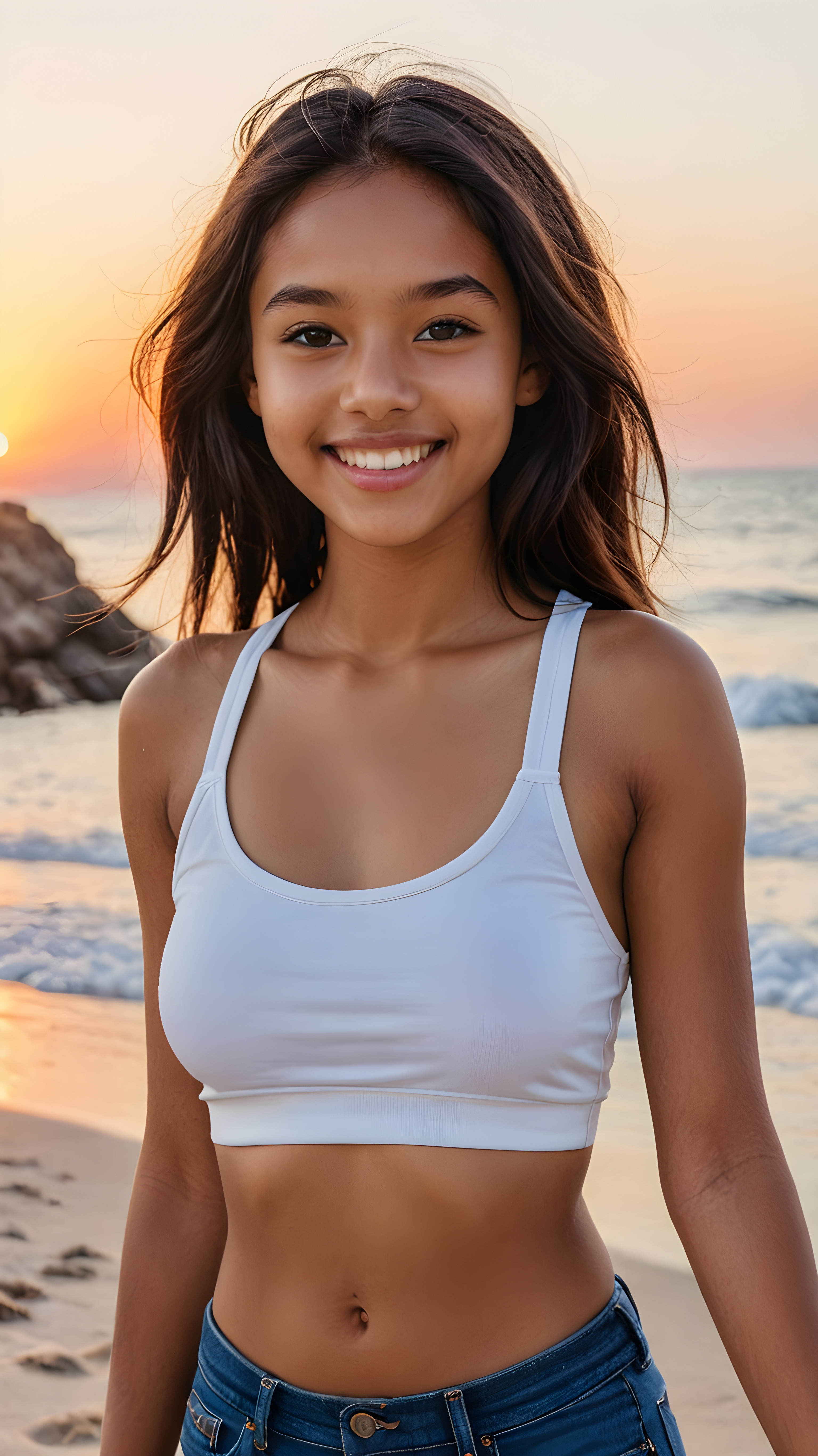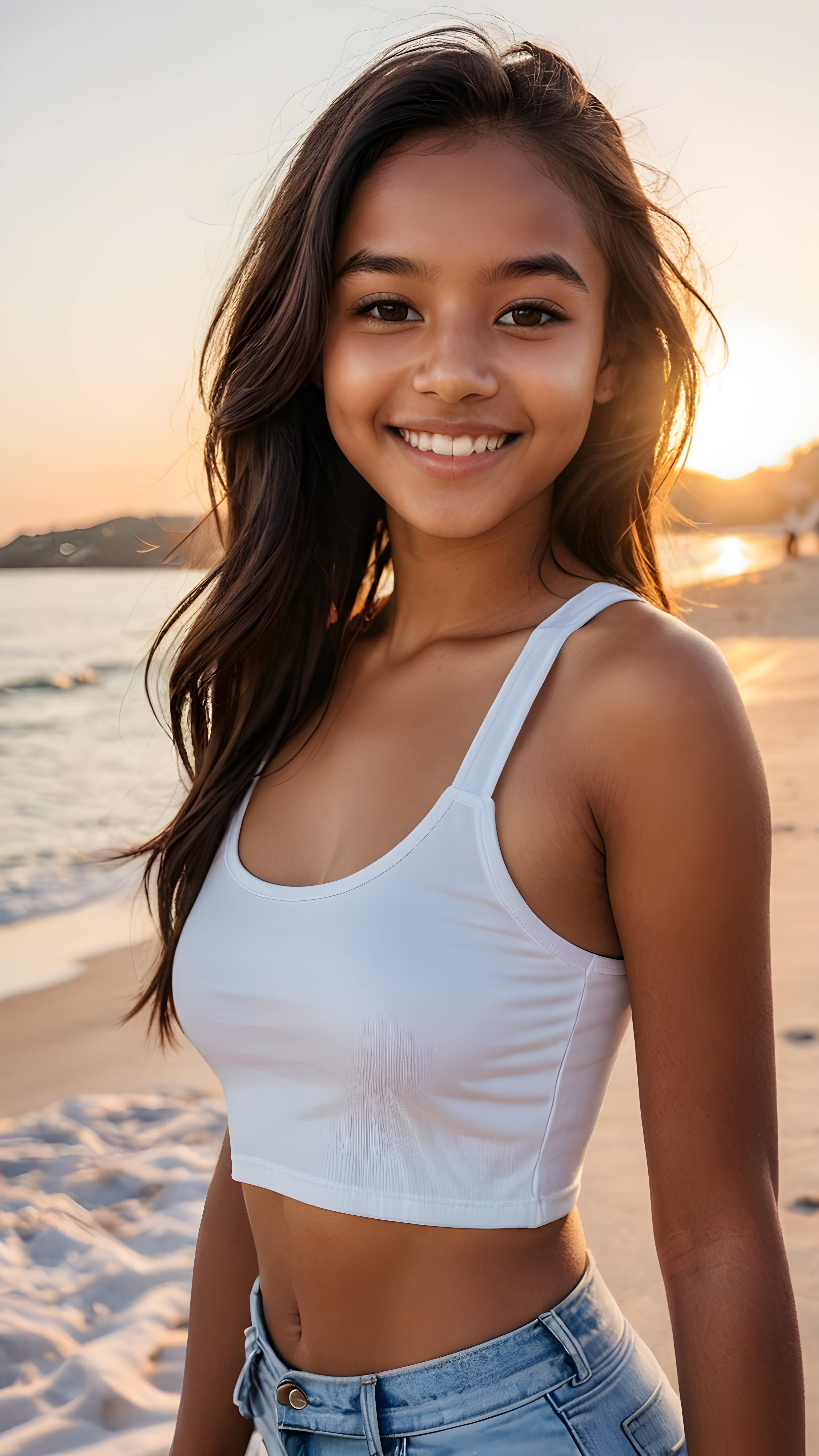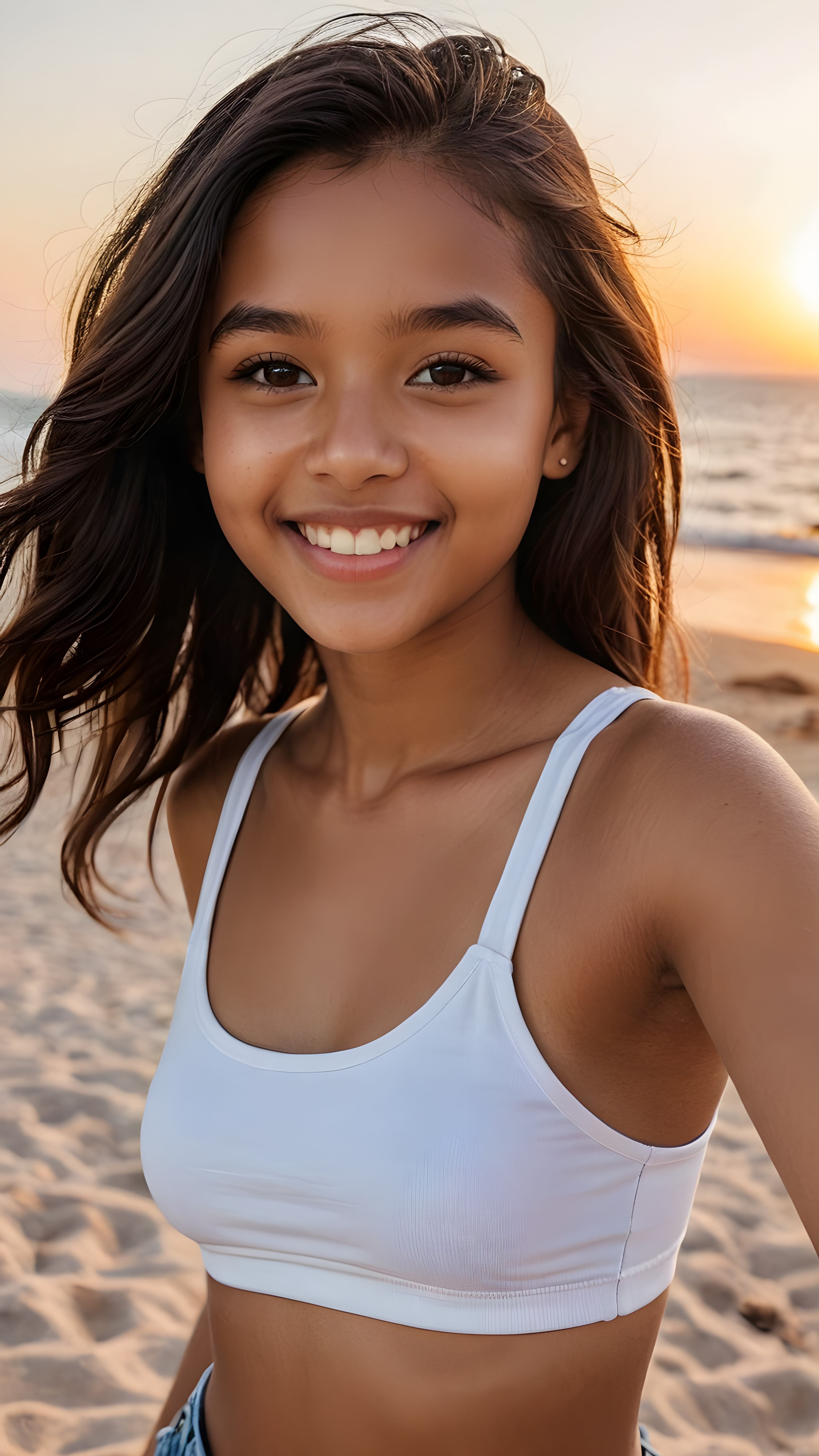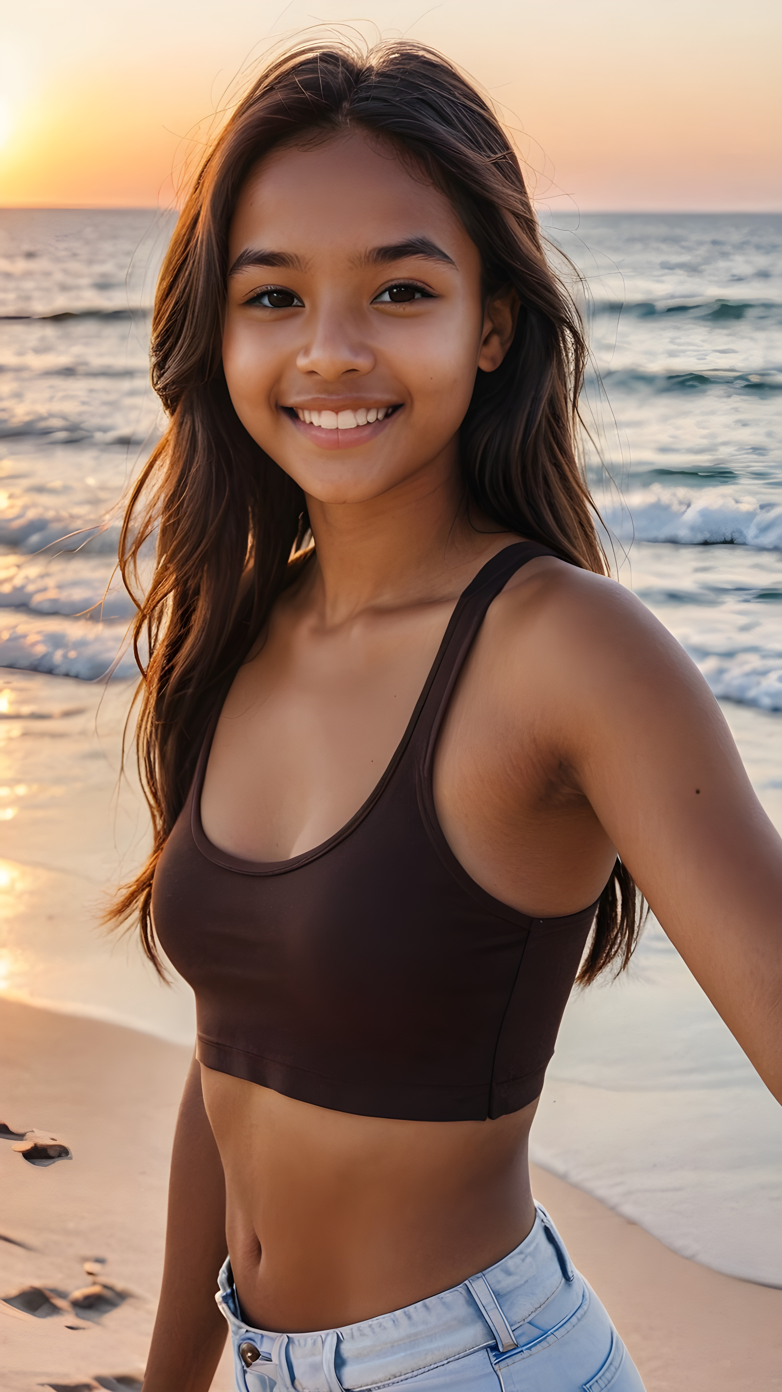 a cute (((brown-skinned teen girlie))), 13 years old, smile, straight black long hair, who exudes an air of seduction with a (((cropped tank top))), exhibiting a perfect curved body, (take a selfie at beach, beautiful sunset)