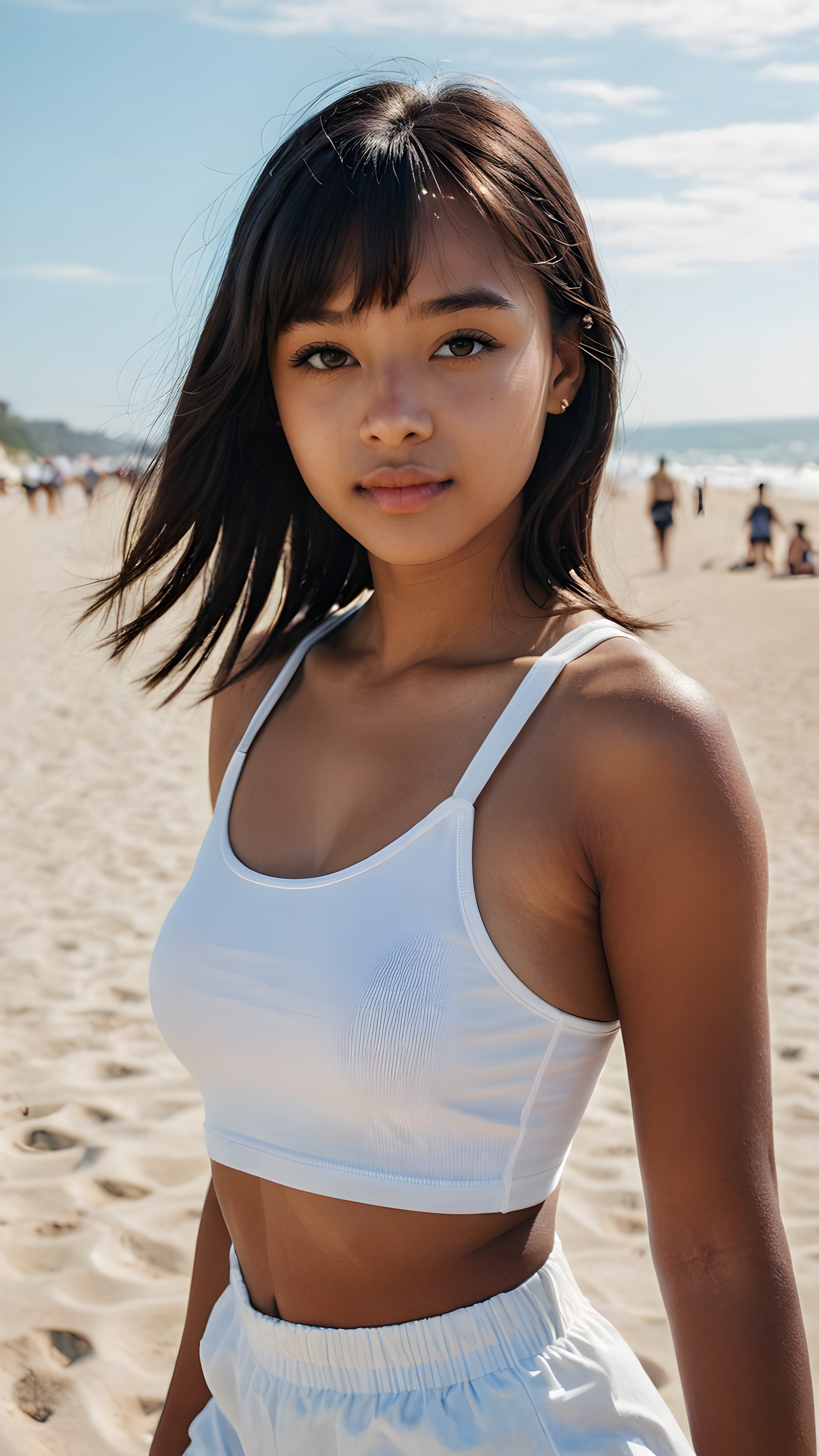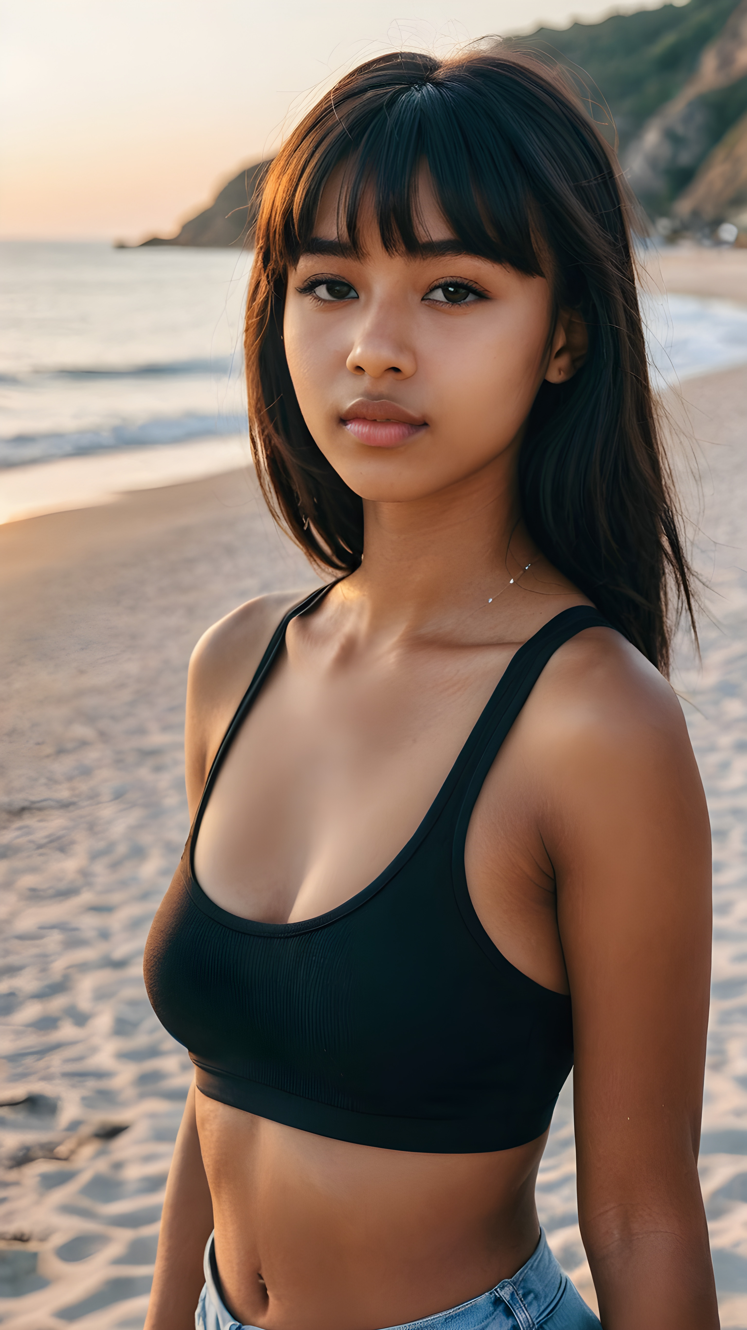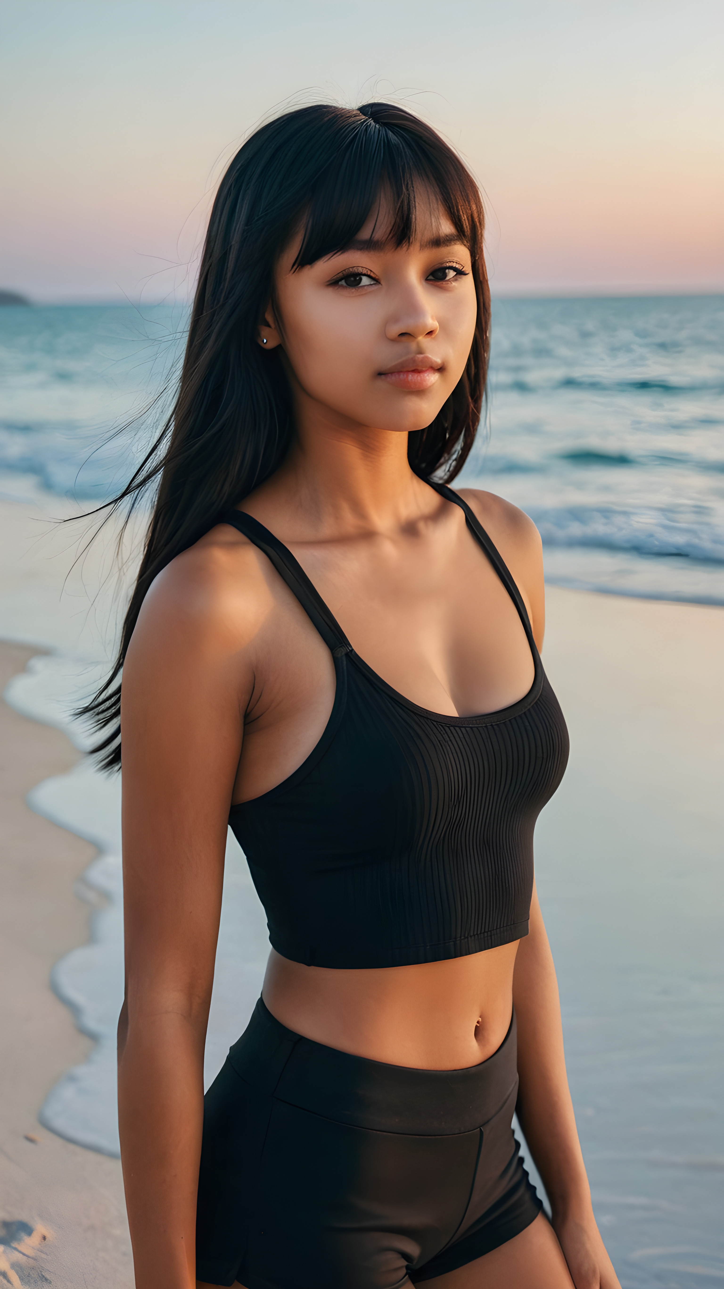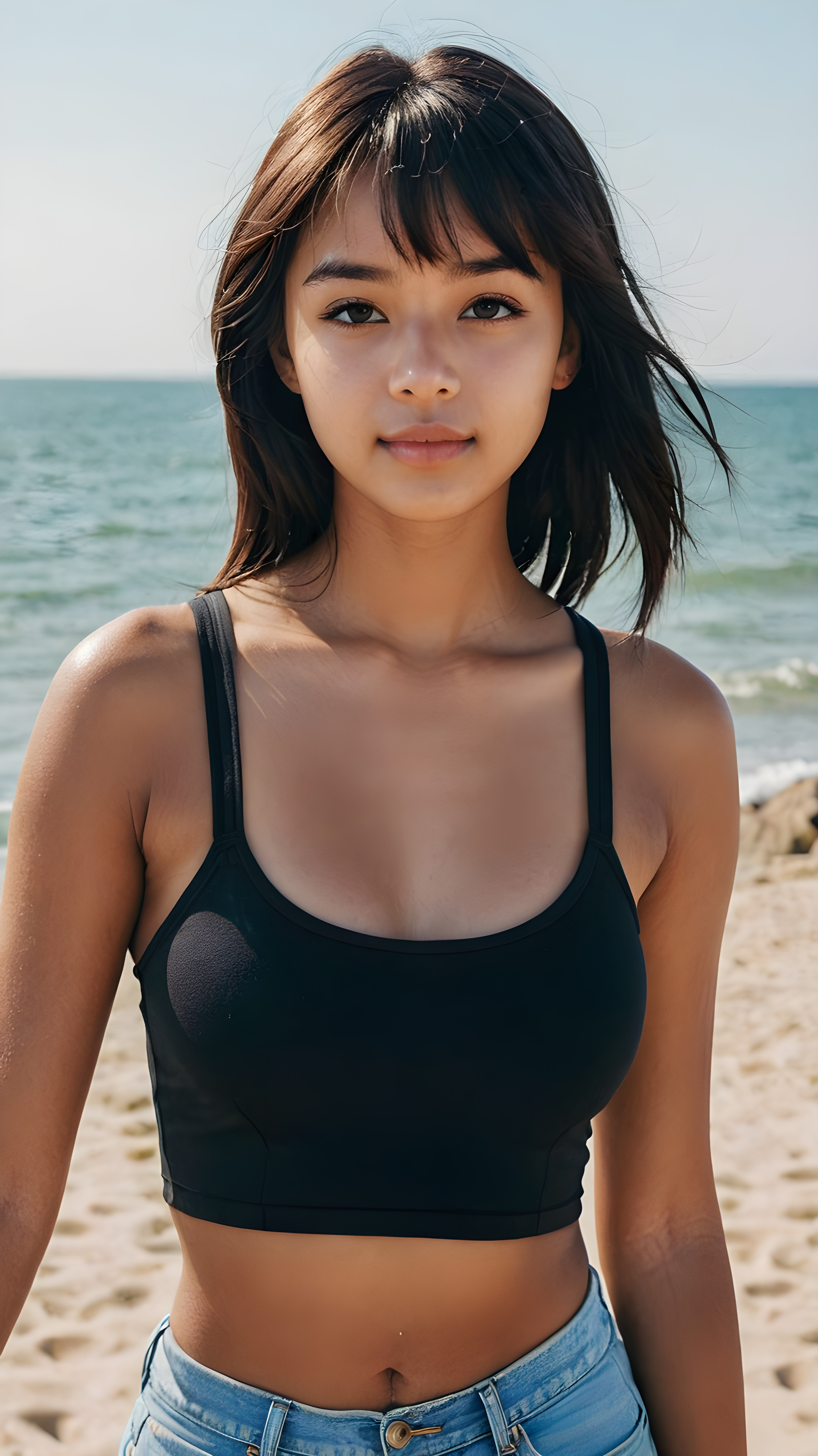 a cute (((dark-skinned teen girlie))), straight black long hair in bangs cut, who exudes an air of seduction with a (((cropped tank top))), exhibiting a perfect, (curvaceous body) (at beach)