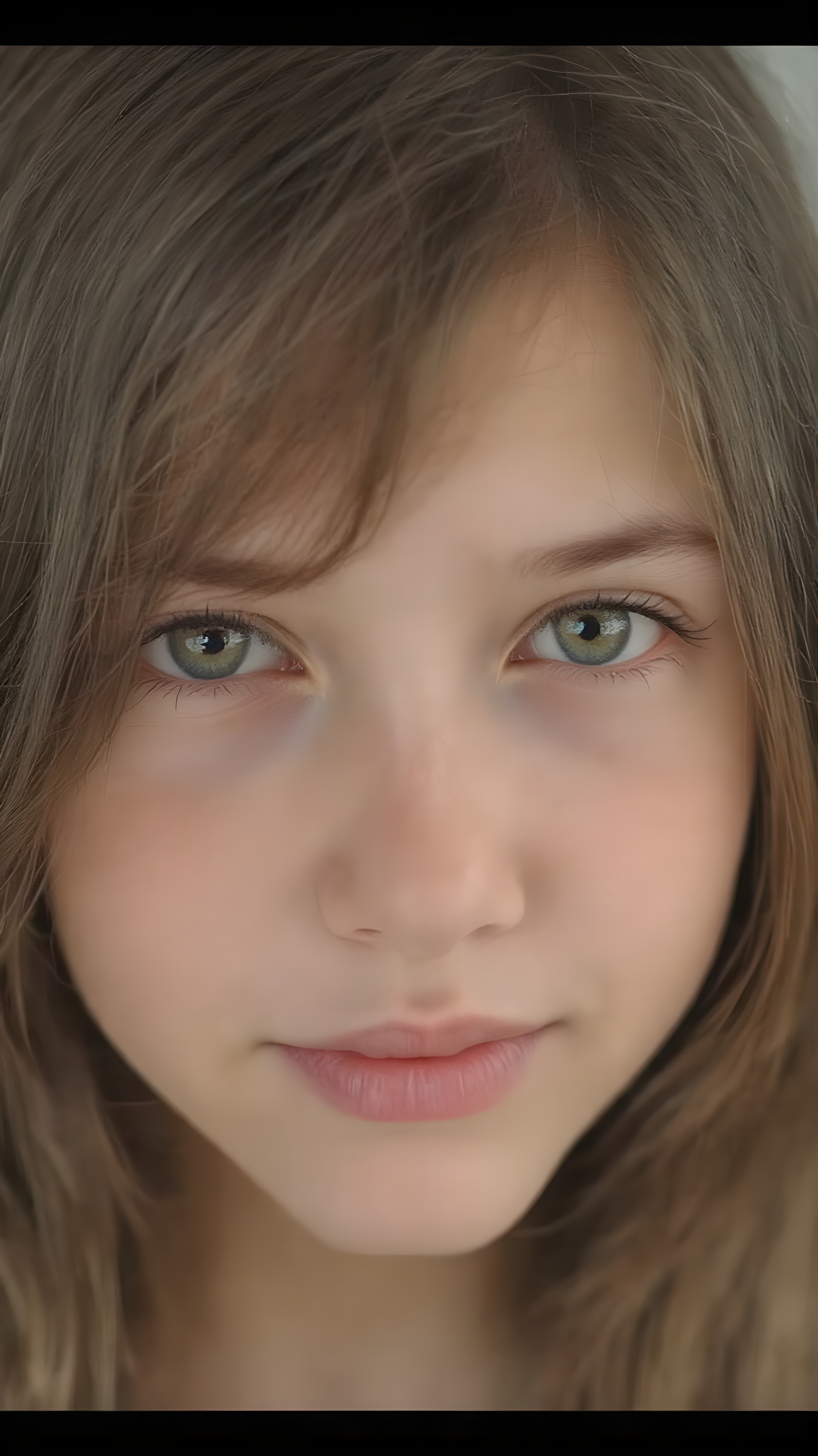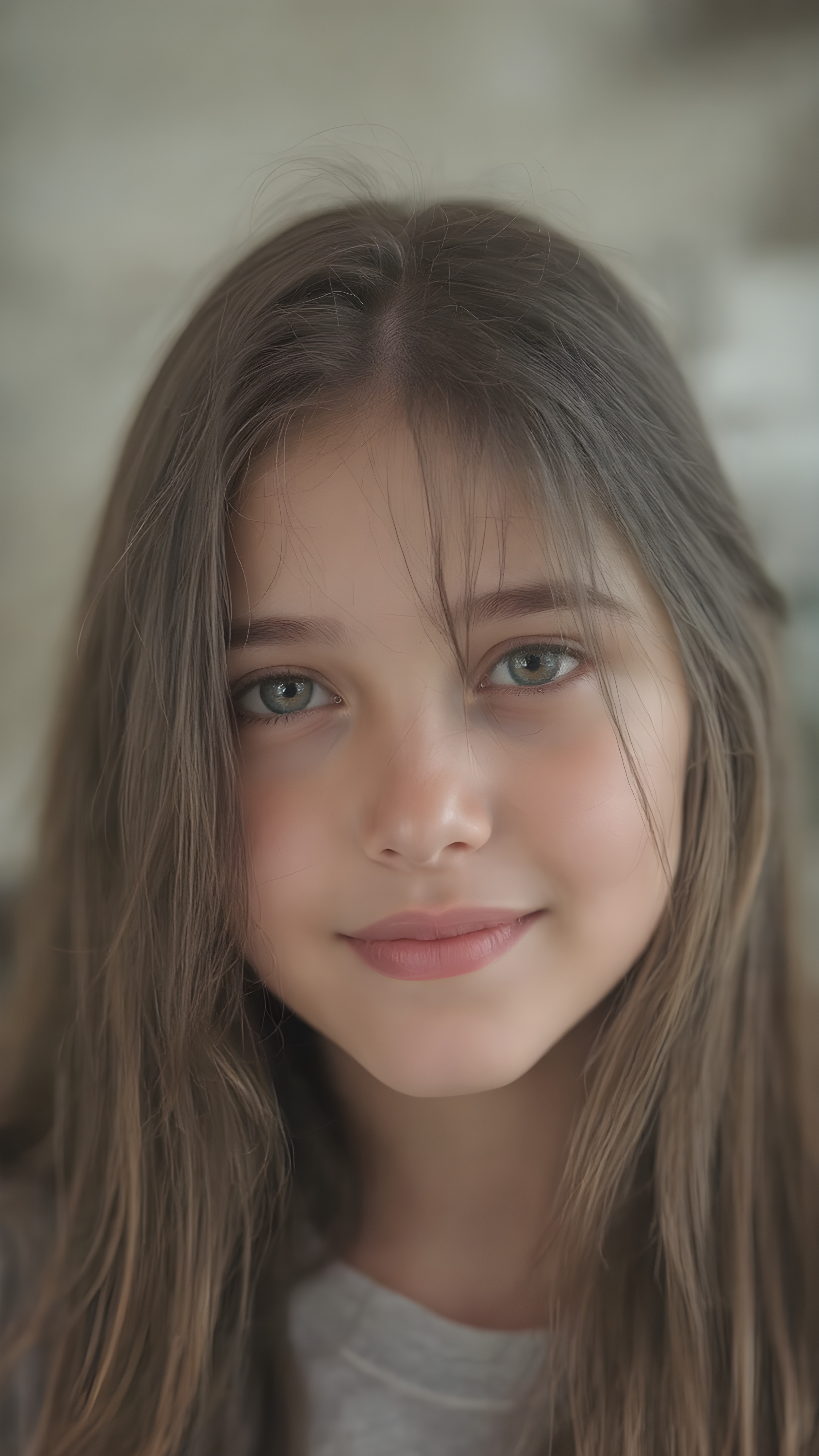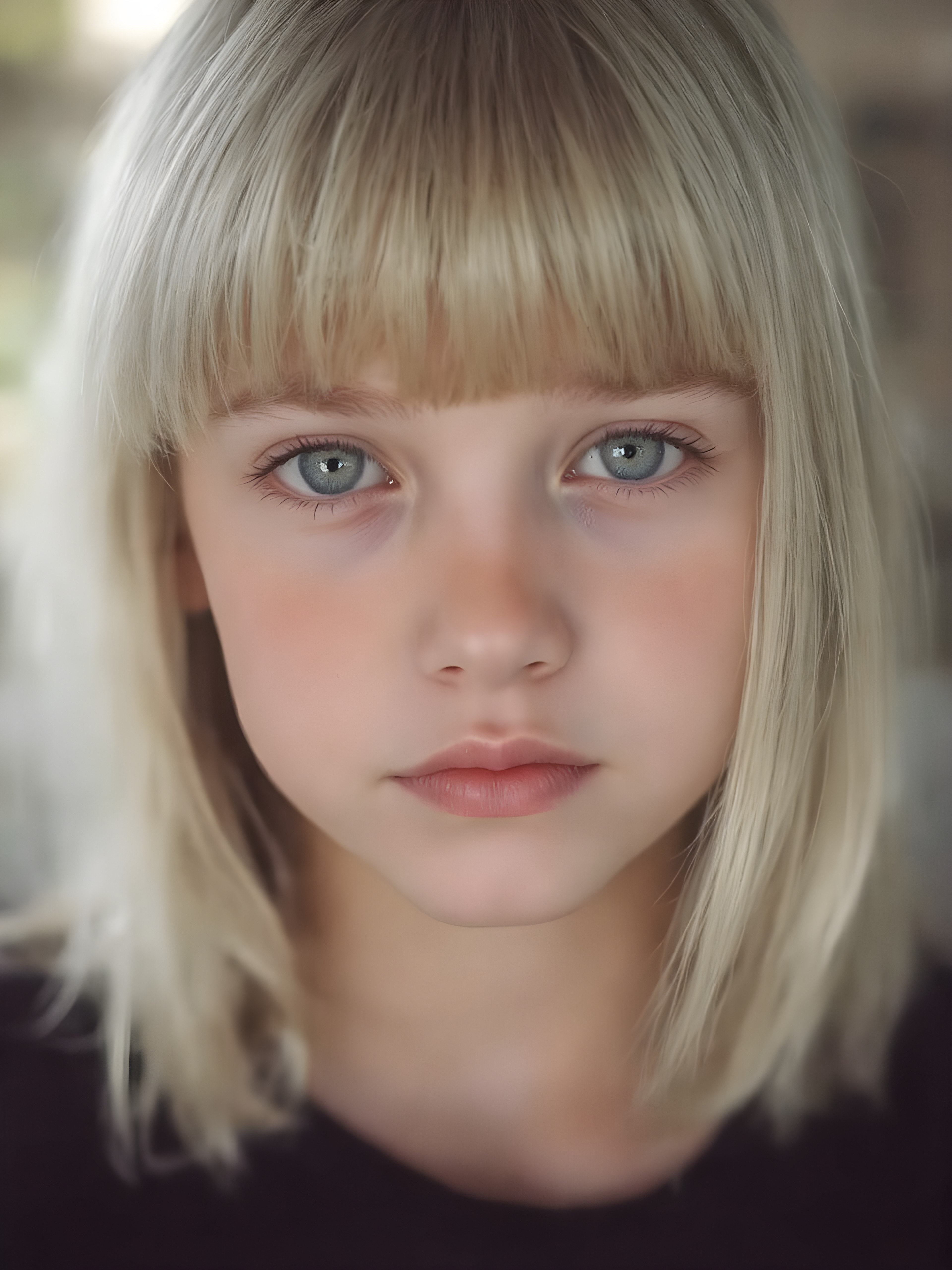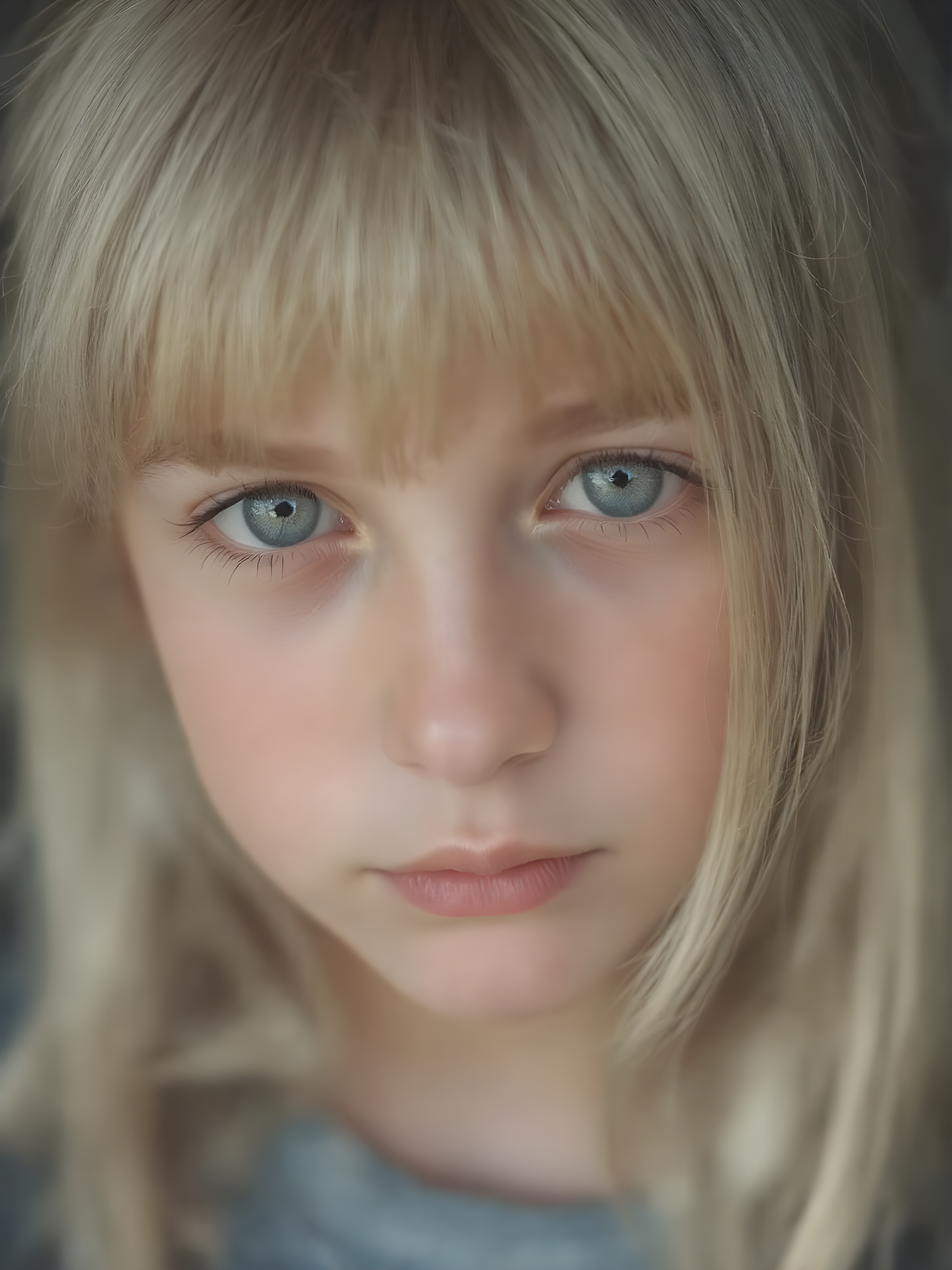a beautiful close-up portrait of a young, innocent and pretty teen girl, 13 years old. She has an angelic face and long, straight ((platinum blond hair)) in bangs cut, (light brown eyes)), ((detailed)) ((stunning)) ((gorgeous)), perfect light, realistic shadows