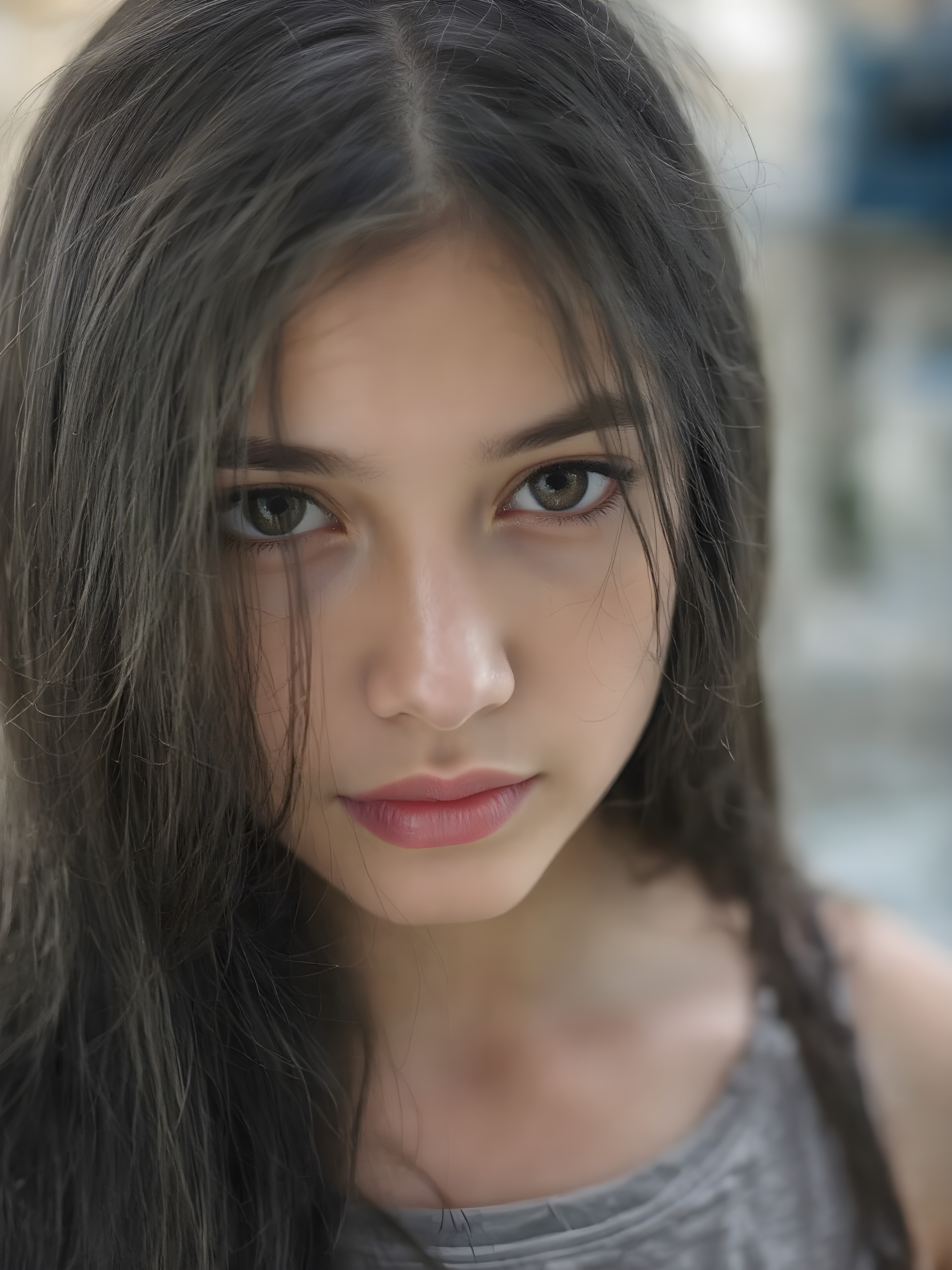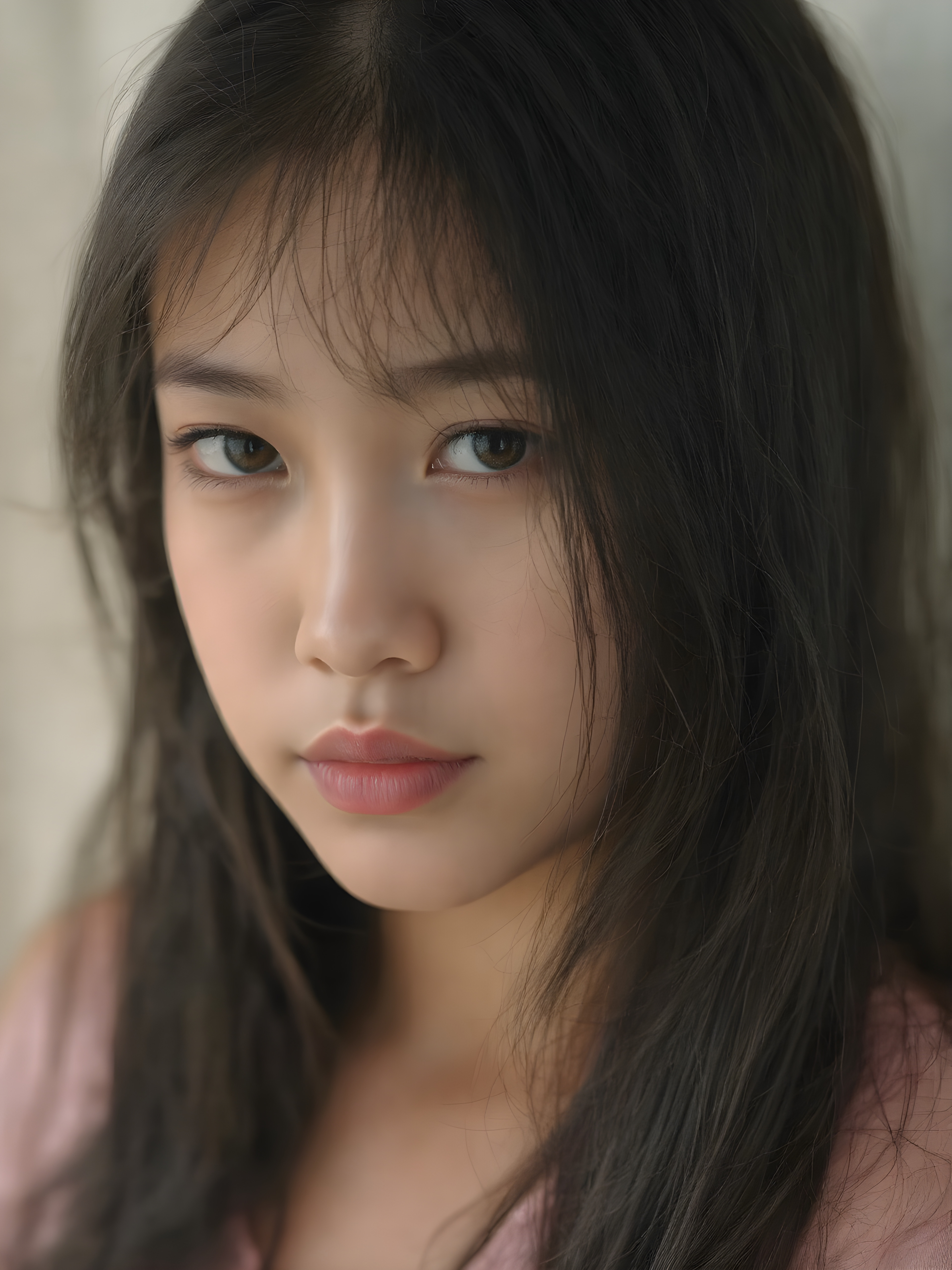 a beautiful close-up portrait of a young and pretty teen girl. She has an angelic face and long, straight black hair, ((detailed)) ((stunning)) ((gorgeous)), perfect light, realistic shadows