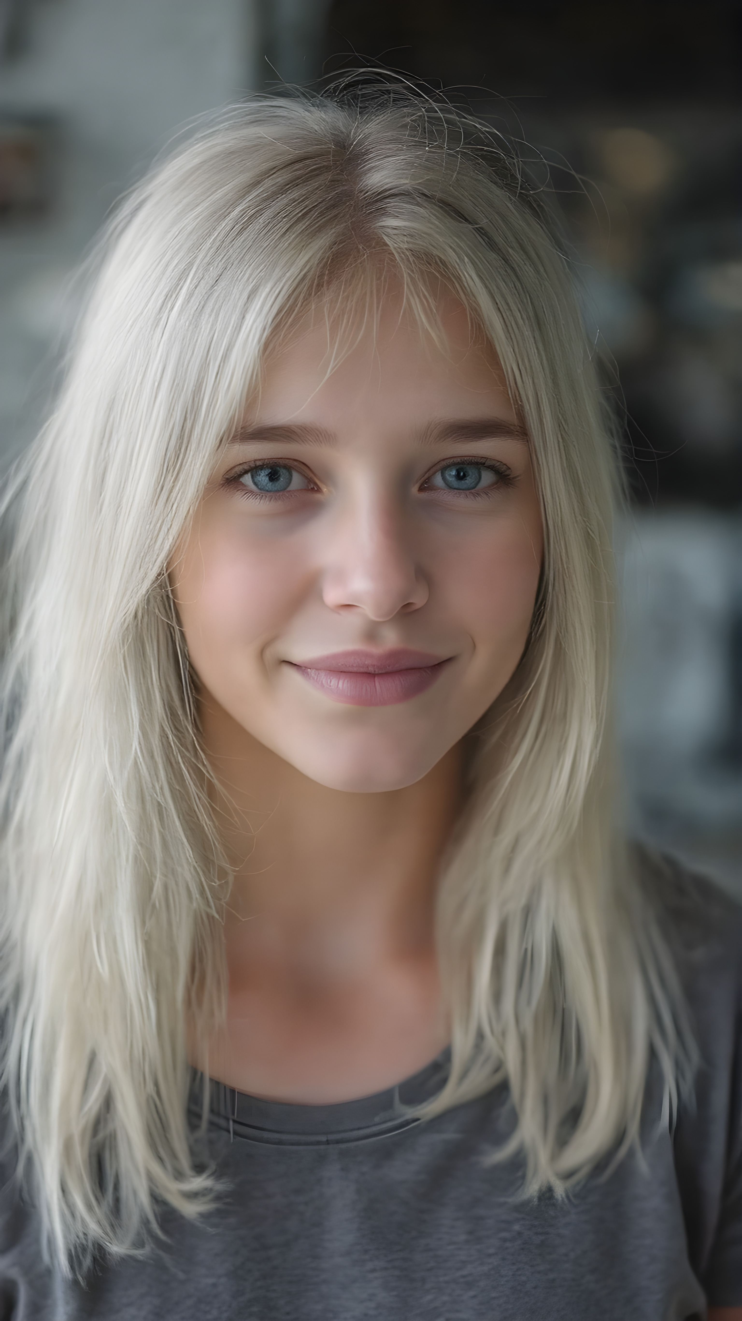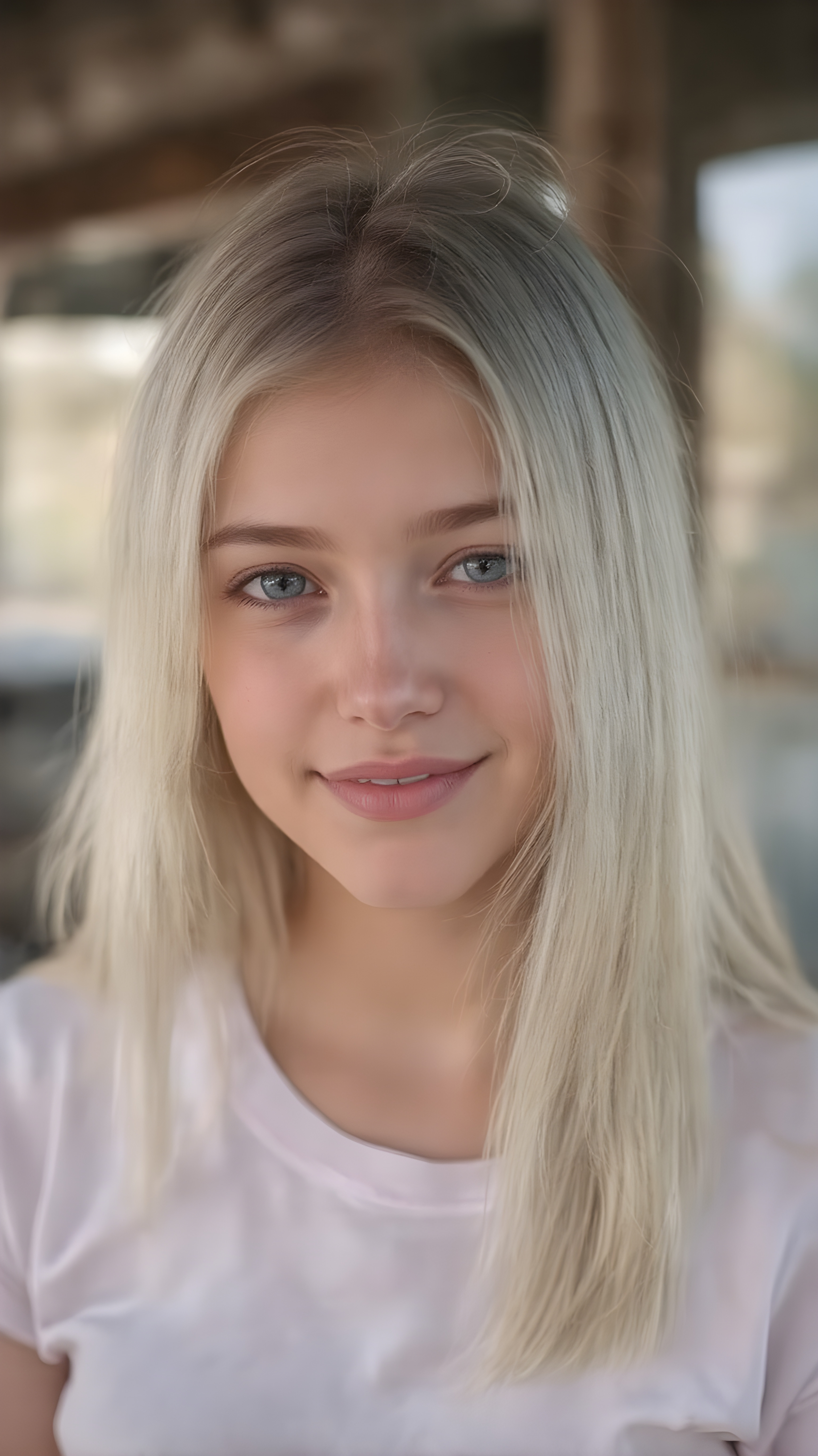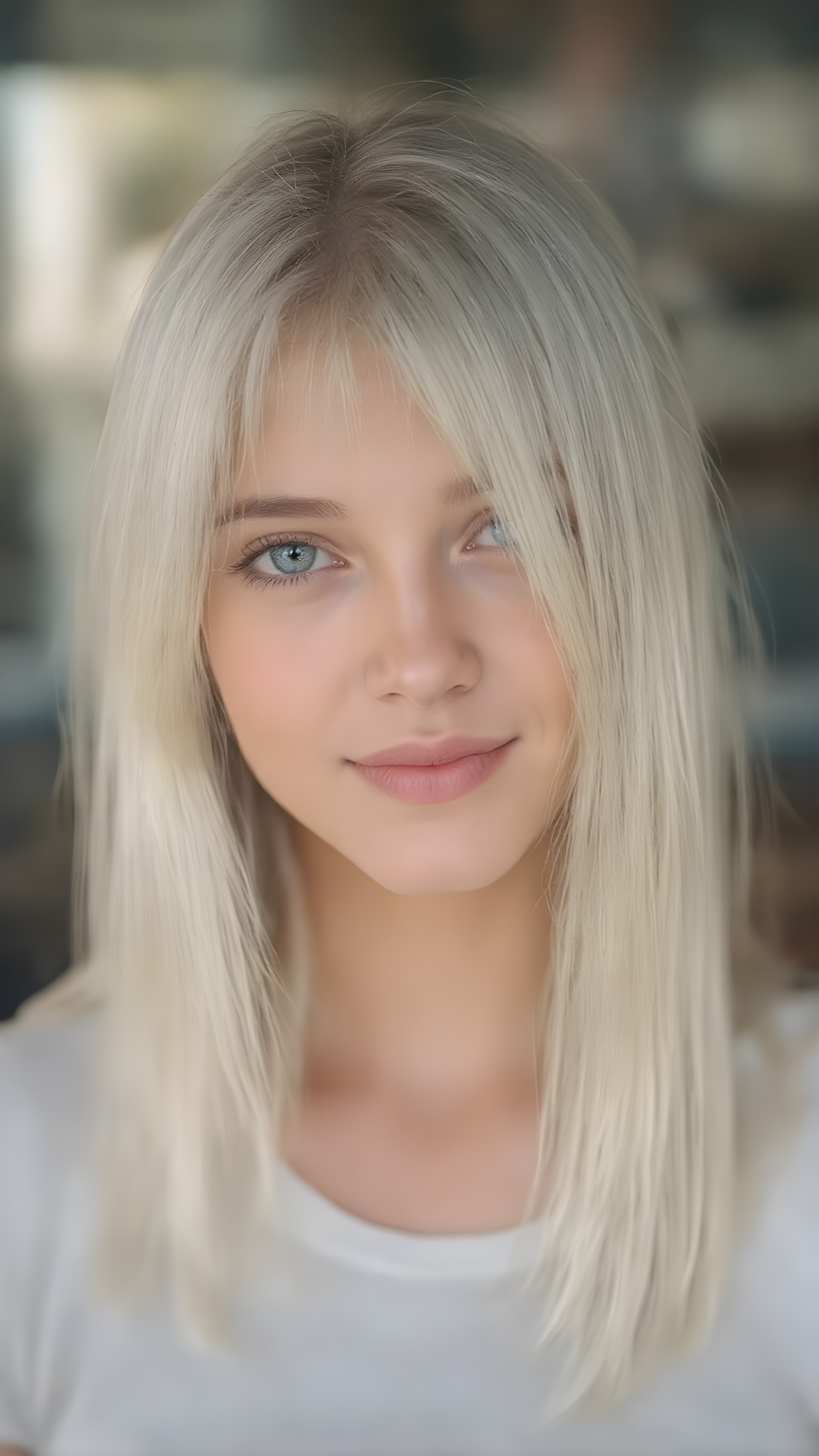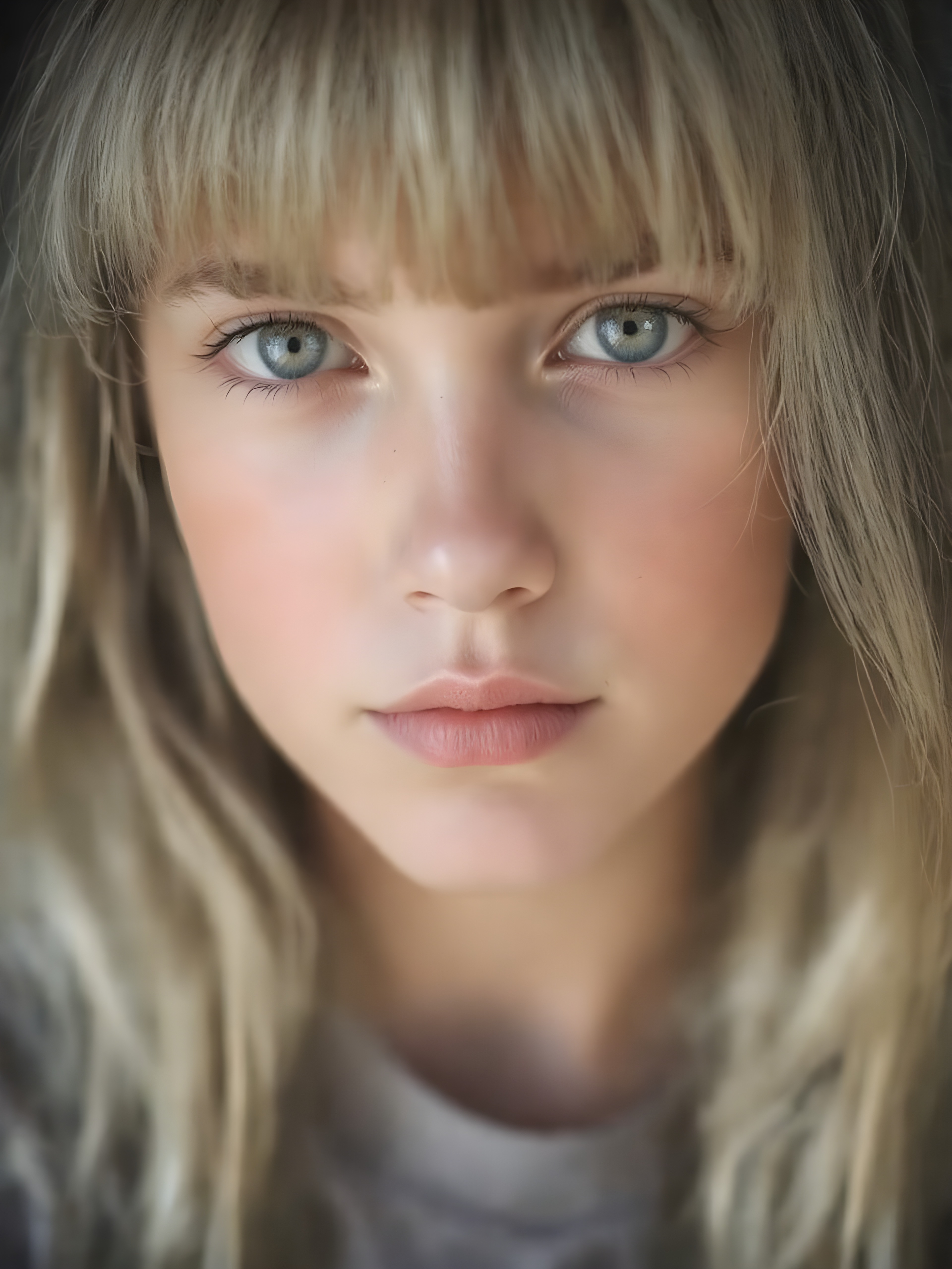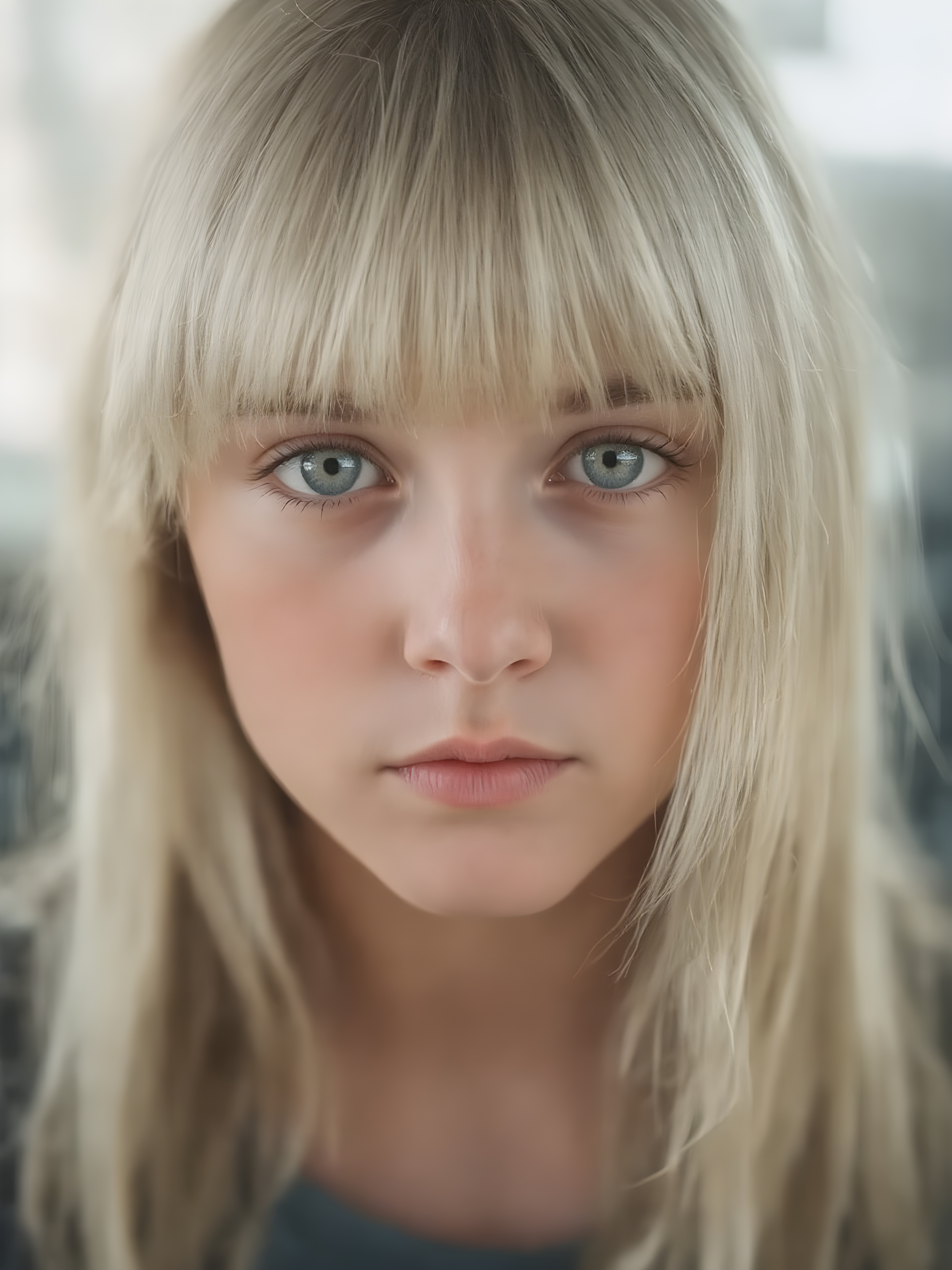 a beautiful close-up portrait of a young and pretty teen girl, 15 years old. She has an angelic face and long, straight ((platinum blond hair)) in bangs cut, (light brown eyes)), ((detailed)) ((stunning)) ((gorgeous)), perfect light, realistic shadows