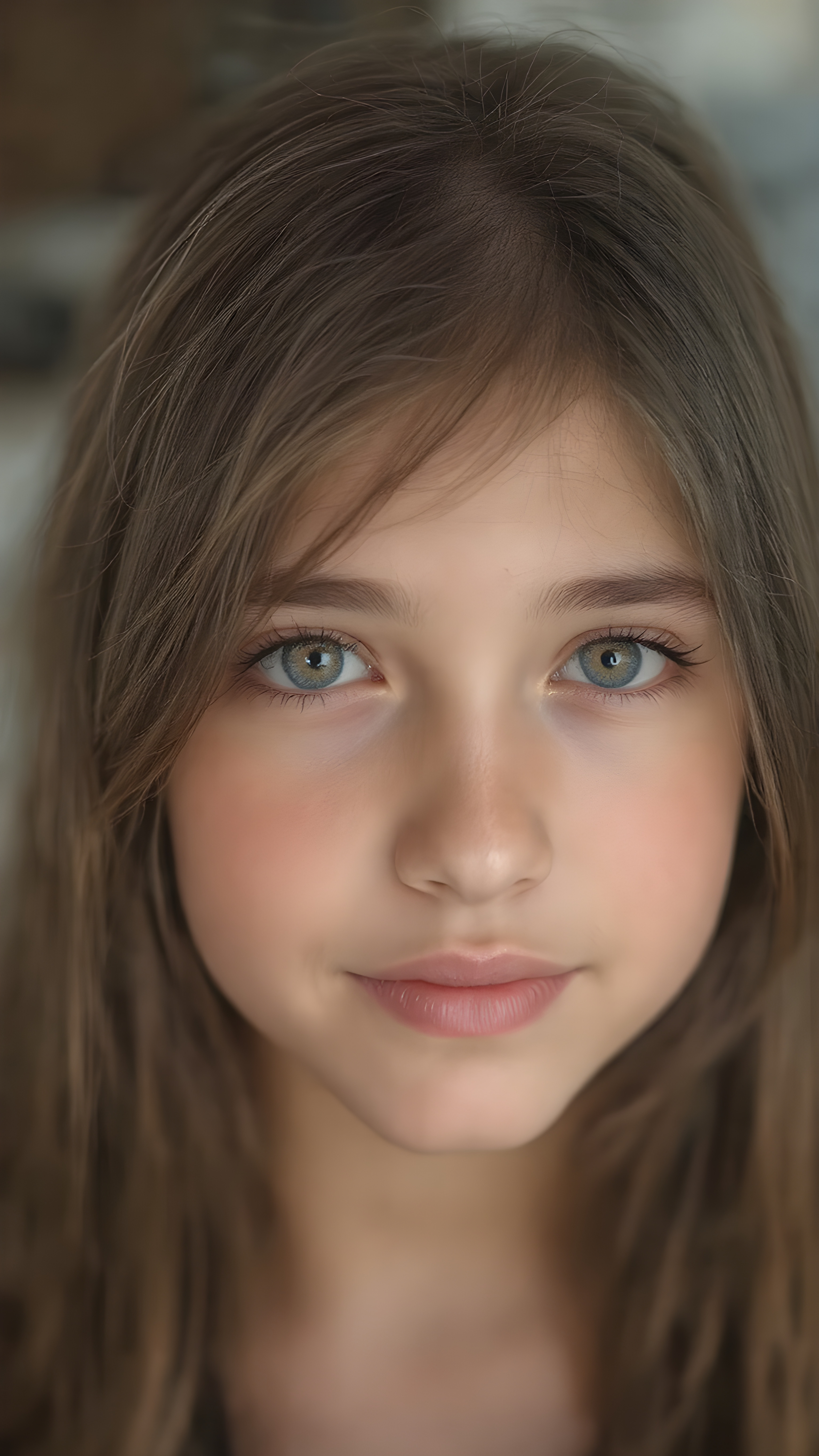 a beautiful close-up portrait of a young and pretty teen girl. She has an angelic round face and long, straight brown hair, amber detailed eyes, ((detailed)) ((stunning)) ((gorgeous)), perfect light, realistic shadows, she smile very happy