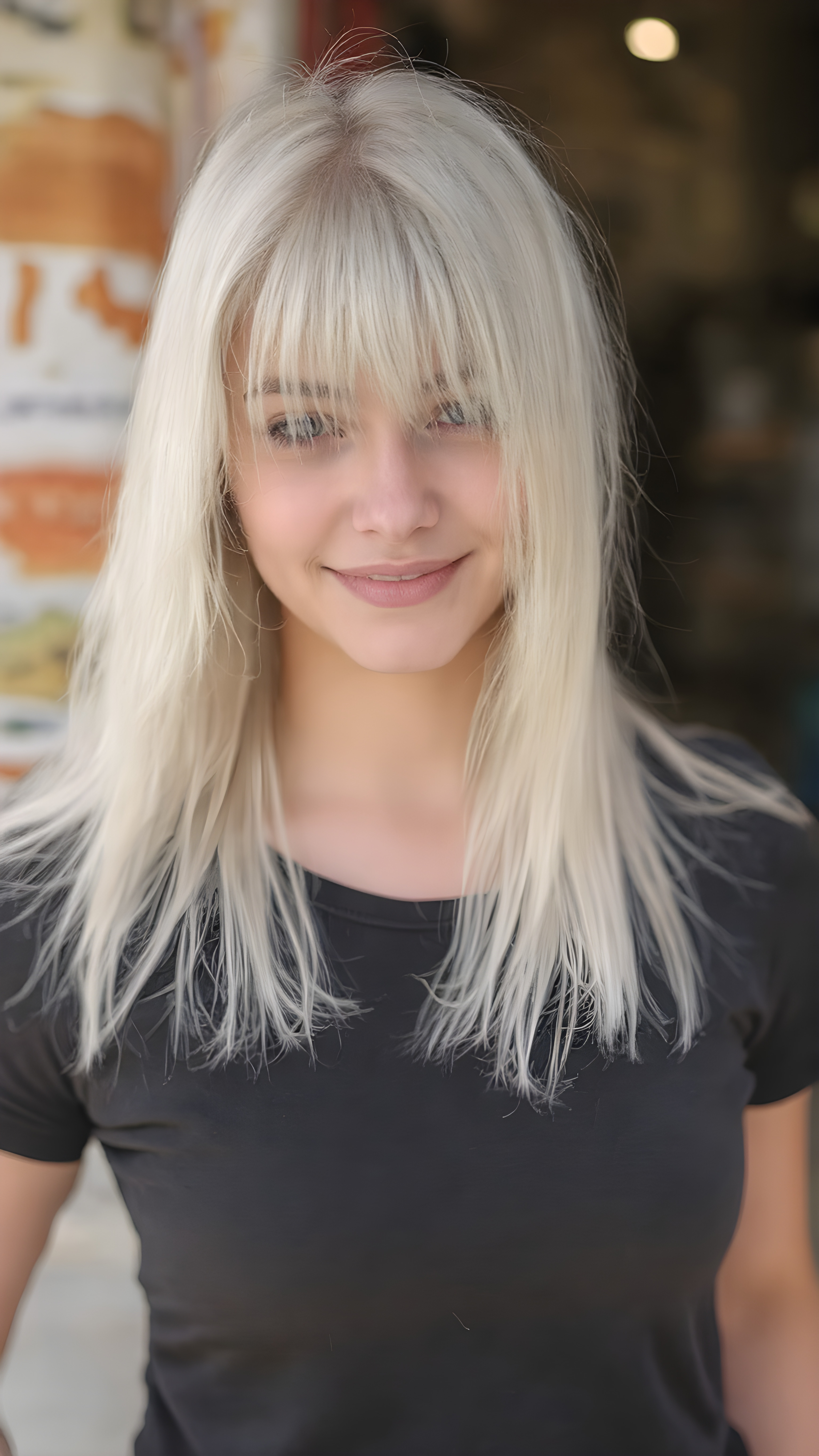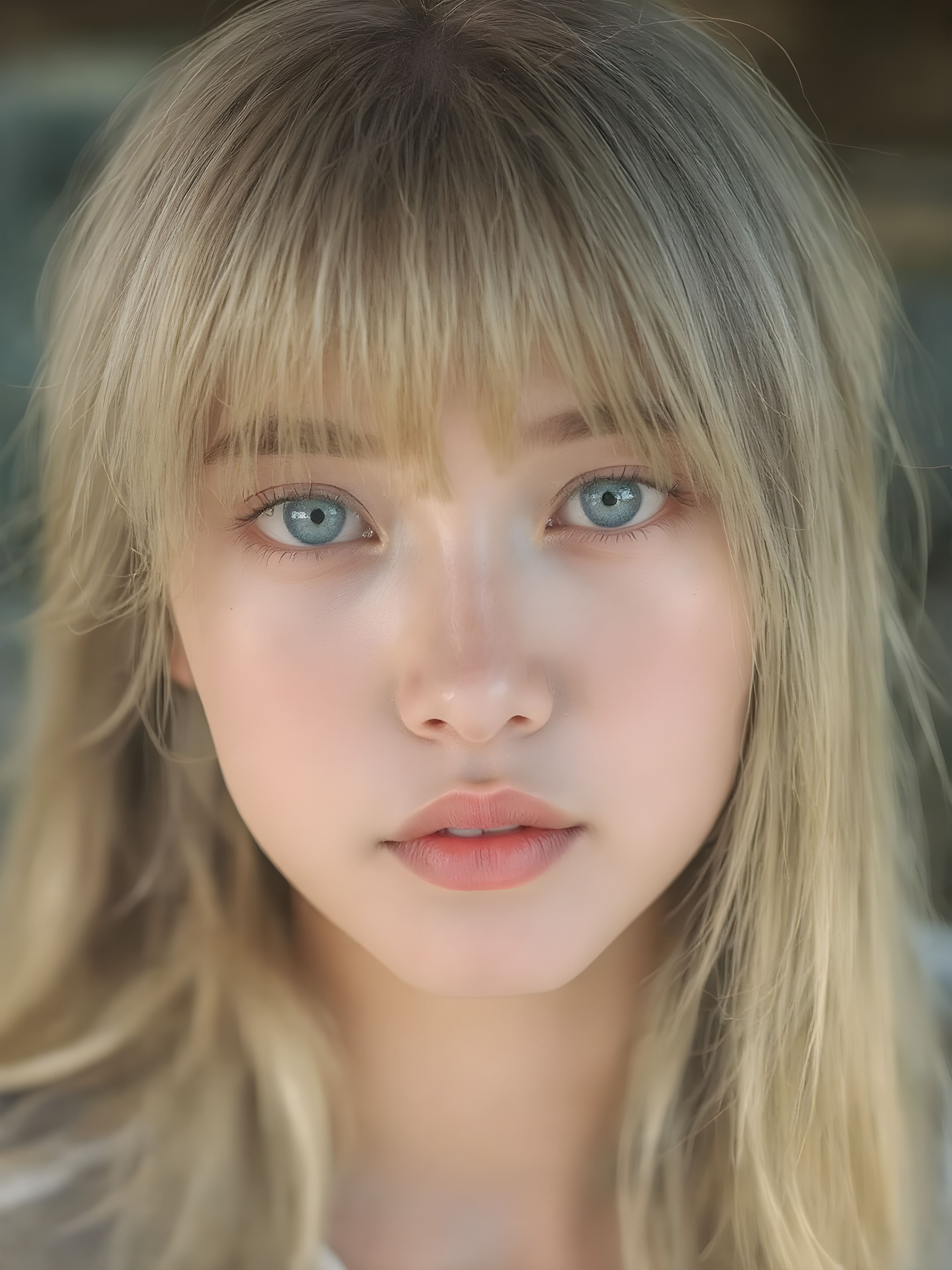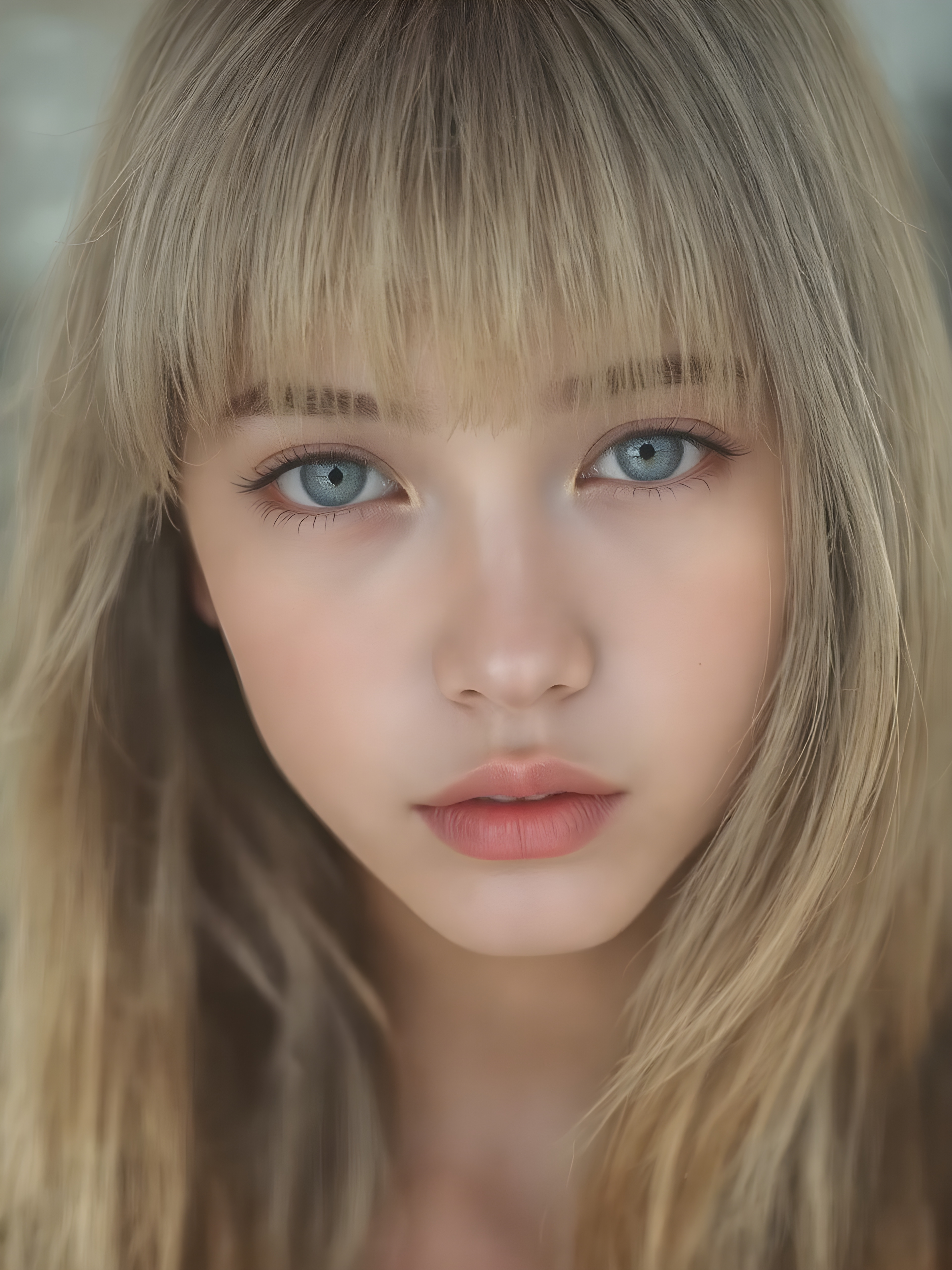 a beautiful close-up portrait of a young and pretty Exotic teen girl, 15 years old. She has an angelic face and long, straight ((platinum blond hair)) in bangs cut, (light brown eyes)), ((detailed)) ((stunning)) ((gorgeous)), perfect light, realistic shadows
