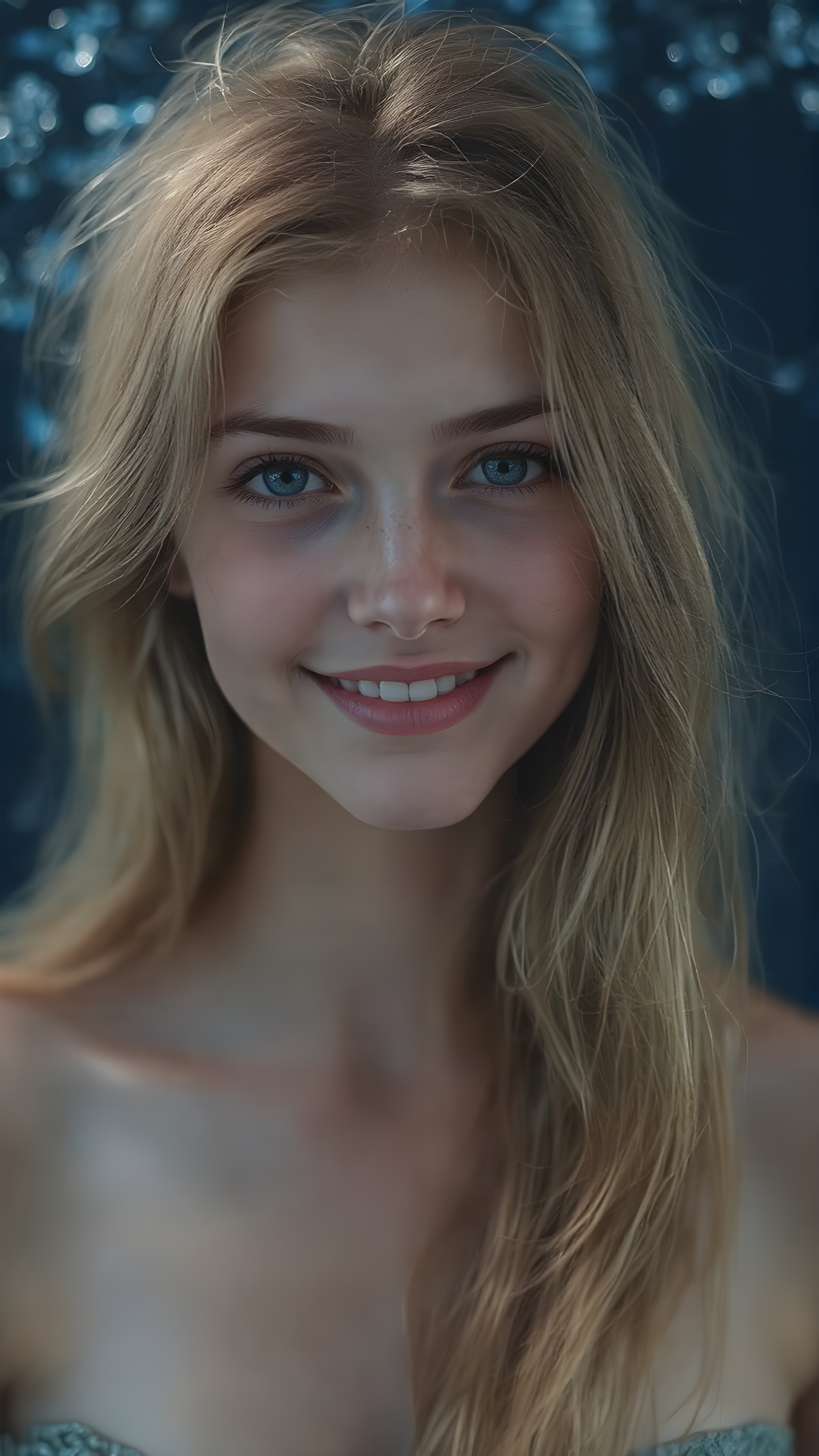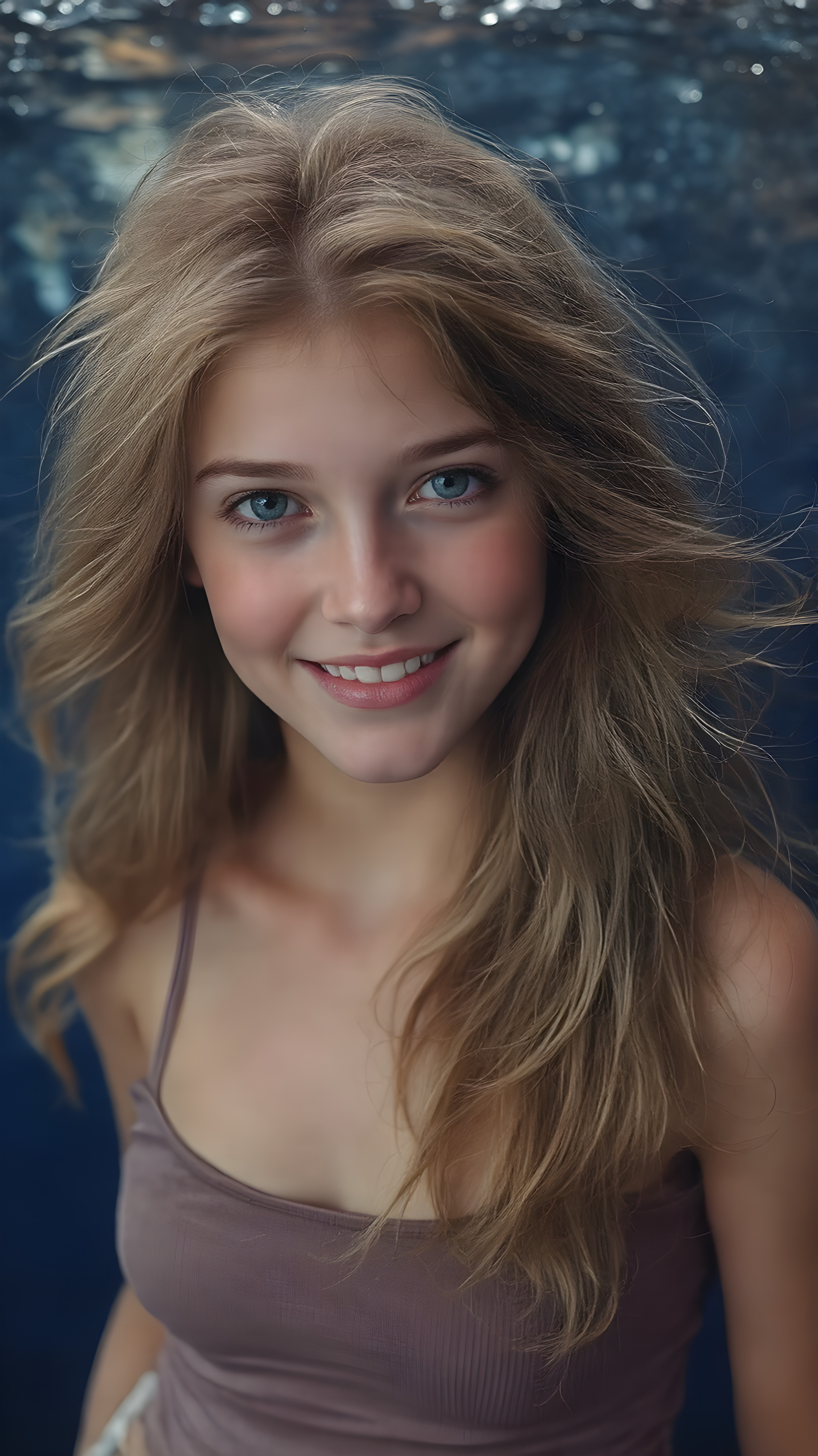a (((super realistic full body portrait))), with intricate details and perfect proportions, capturing a ((cute teen girl)) with (long, flowing amber hair) and (detailed, brown eyes) that exude (warmth) and (soft, white skin) that blends seamlessly into a (deeply saturated, dark blue background) where the focus is on her upper body and she’s posed with a (warm smile) and perfect white teeth, wearing a (short, sheer, tight tank top) that accentuates her (perfectly proportioned figure) against a (blurry, underwater backdrop) that captures the essence of a (fantastical fantasy) atmosphere