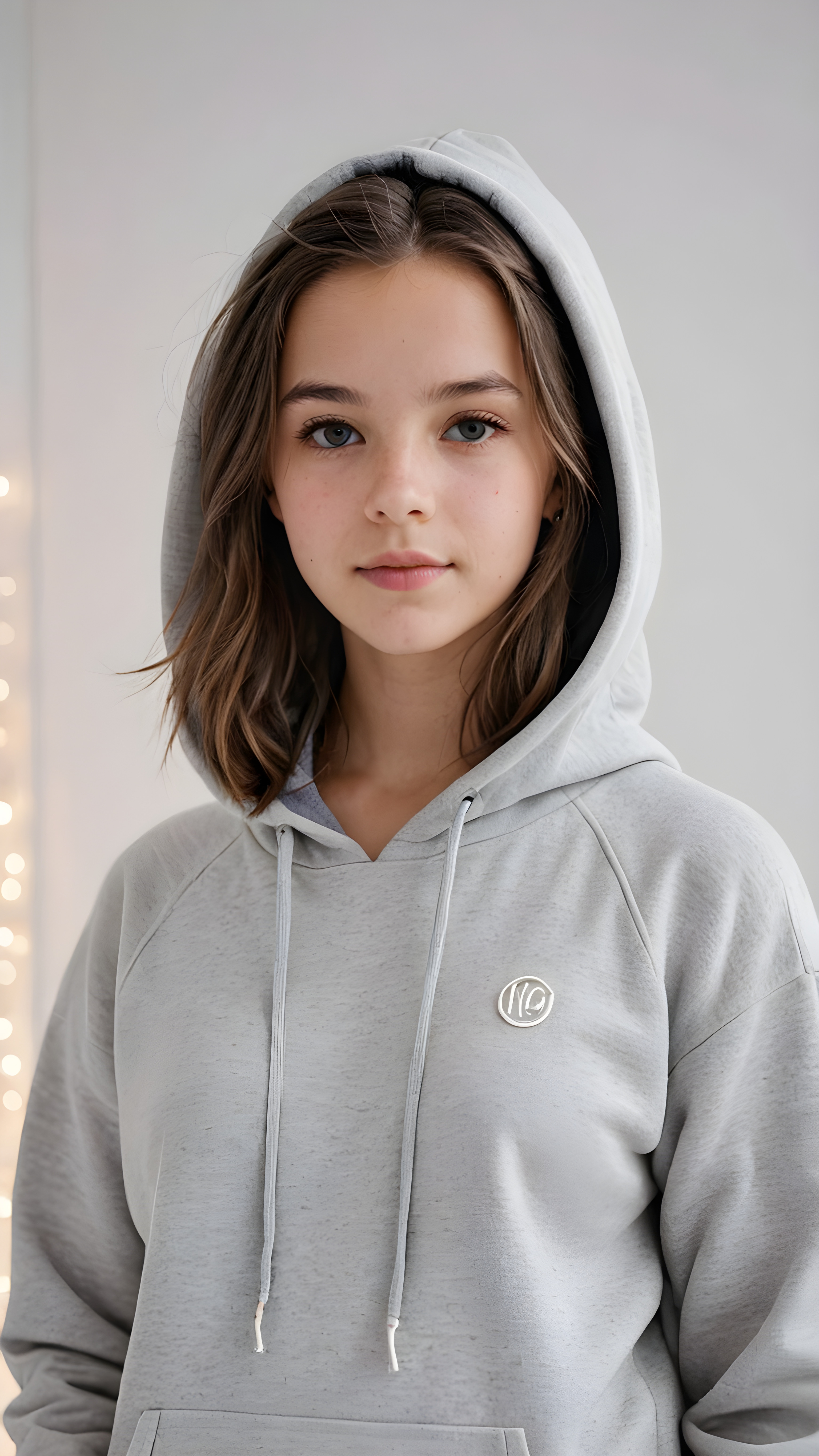 visualize a (((young teen girl))) dressed in a (vividly gray hoodie), standing confidently against a (magnificent white backdrop) that suggests tranquility and serenity