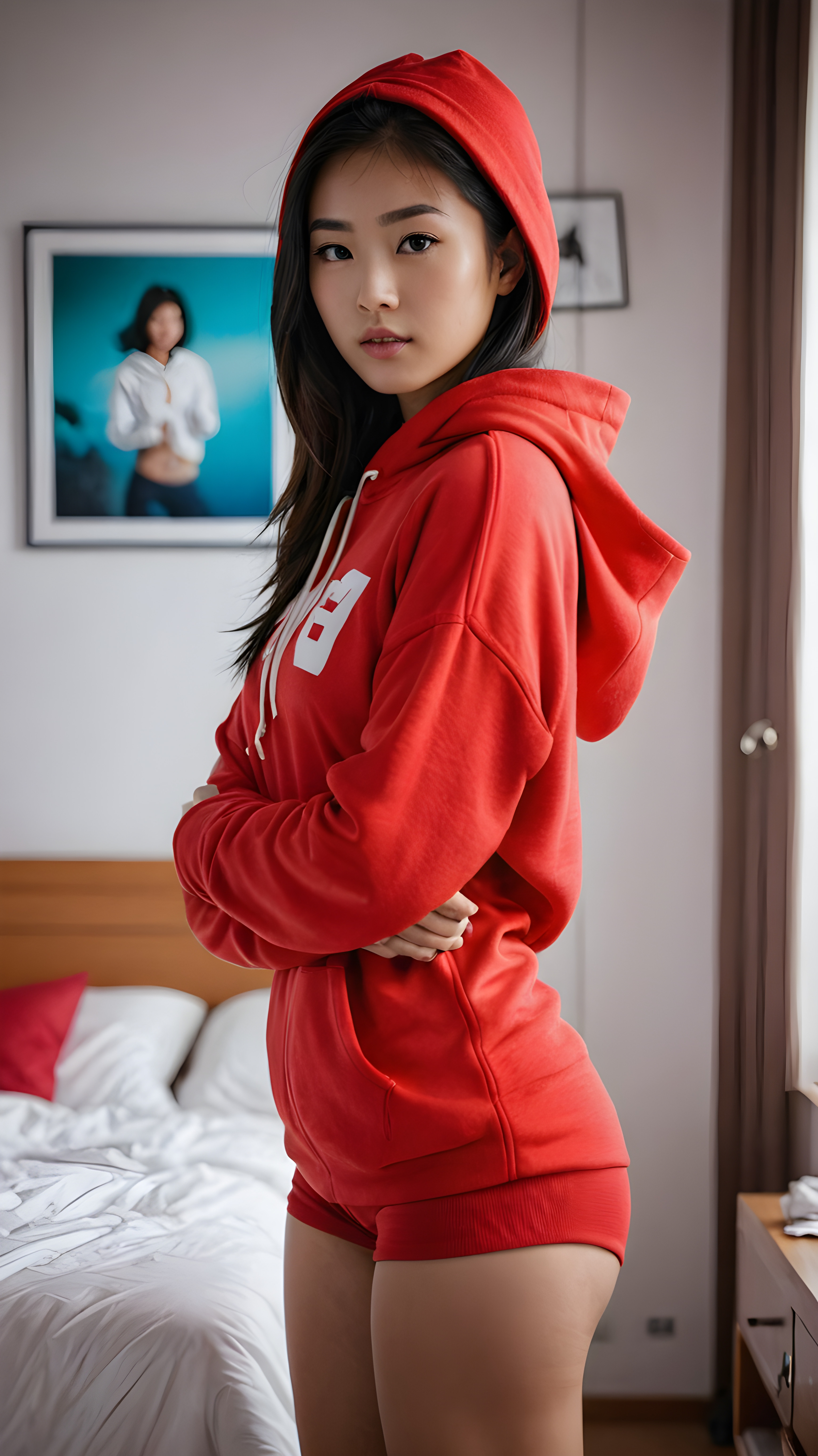 a (((Asian girl))) standing confidently in her (bedroom), dressed in a (vivid red hoodie) that highlights her navel, with its sides pulled down to reveal a glimpse of her short shorts