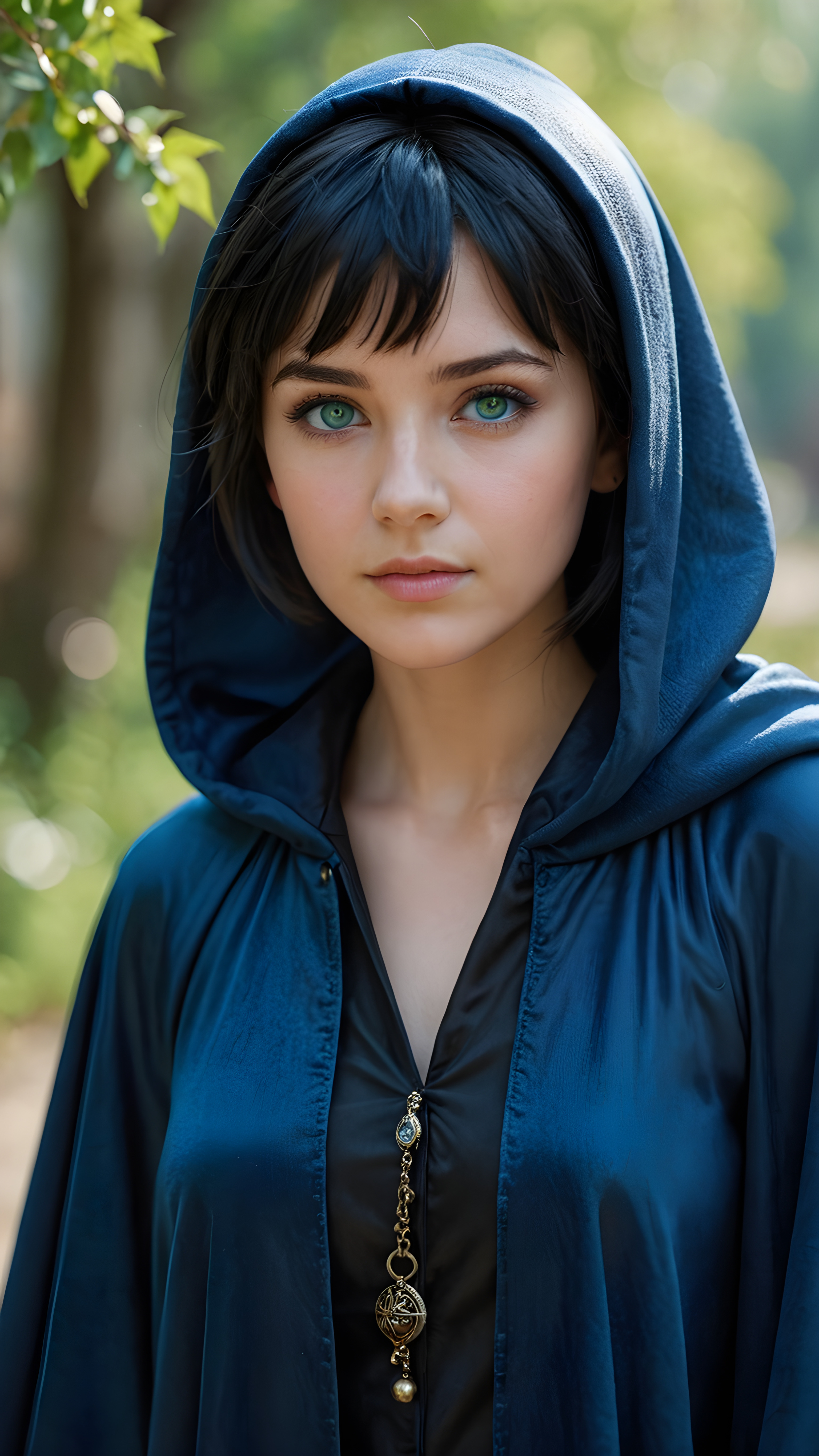 a detailed and realistic picture of: a young sorceress in a blue, tight cloak. She has black, short hair. The picture is very detailed with realistic shadows and soft light. She has a girlish, round face with light green eyes.