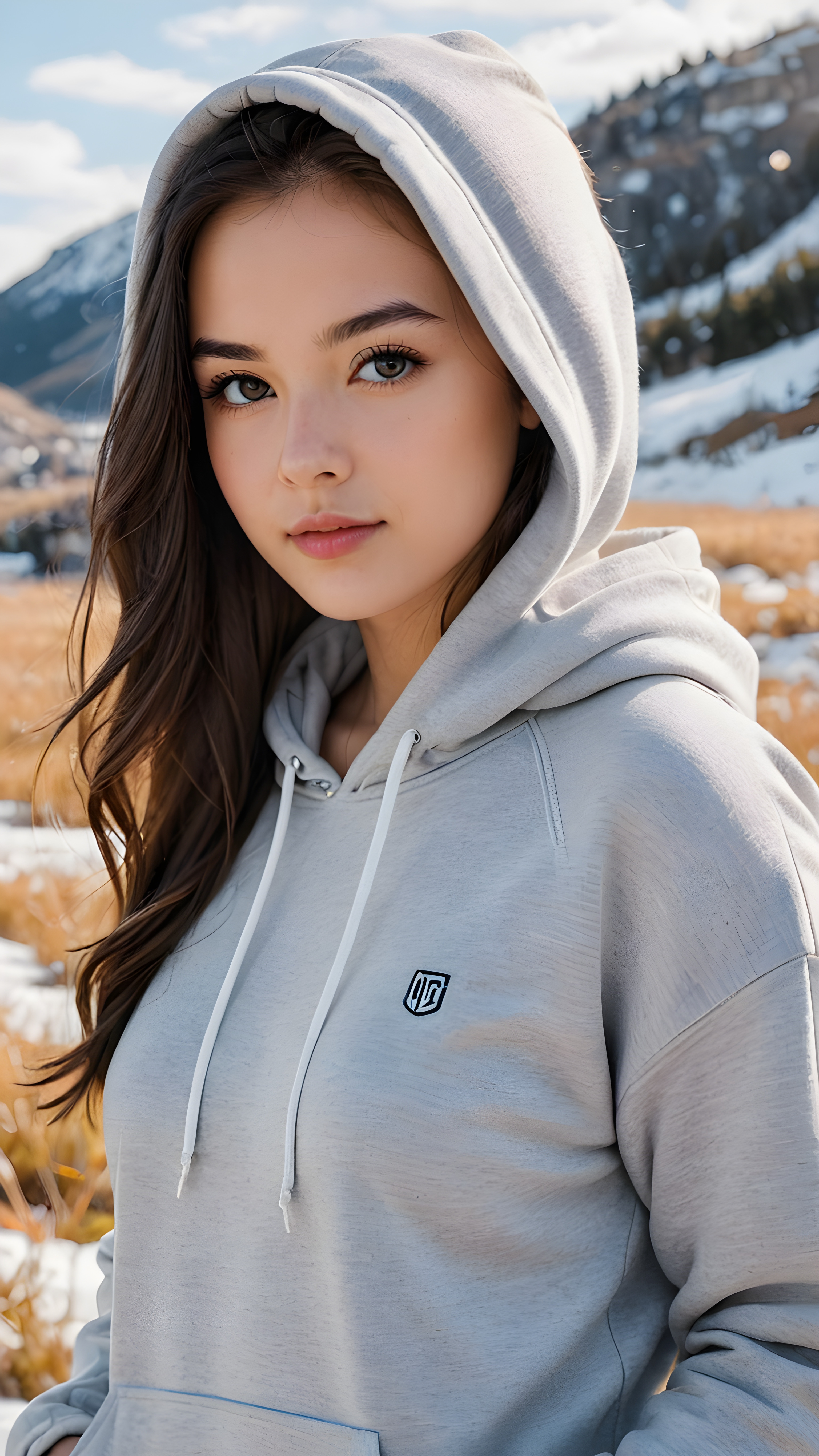 create a masterpice of image: a young gorgeous and stunning girl, dressed in a (vivid grey hoodie) (white landscape in the background)