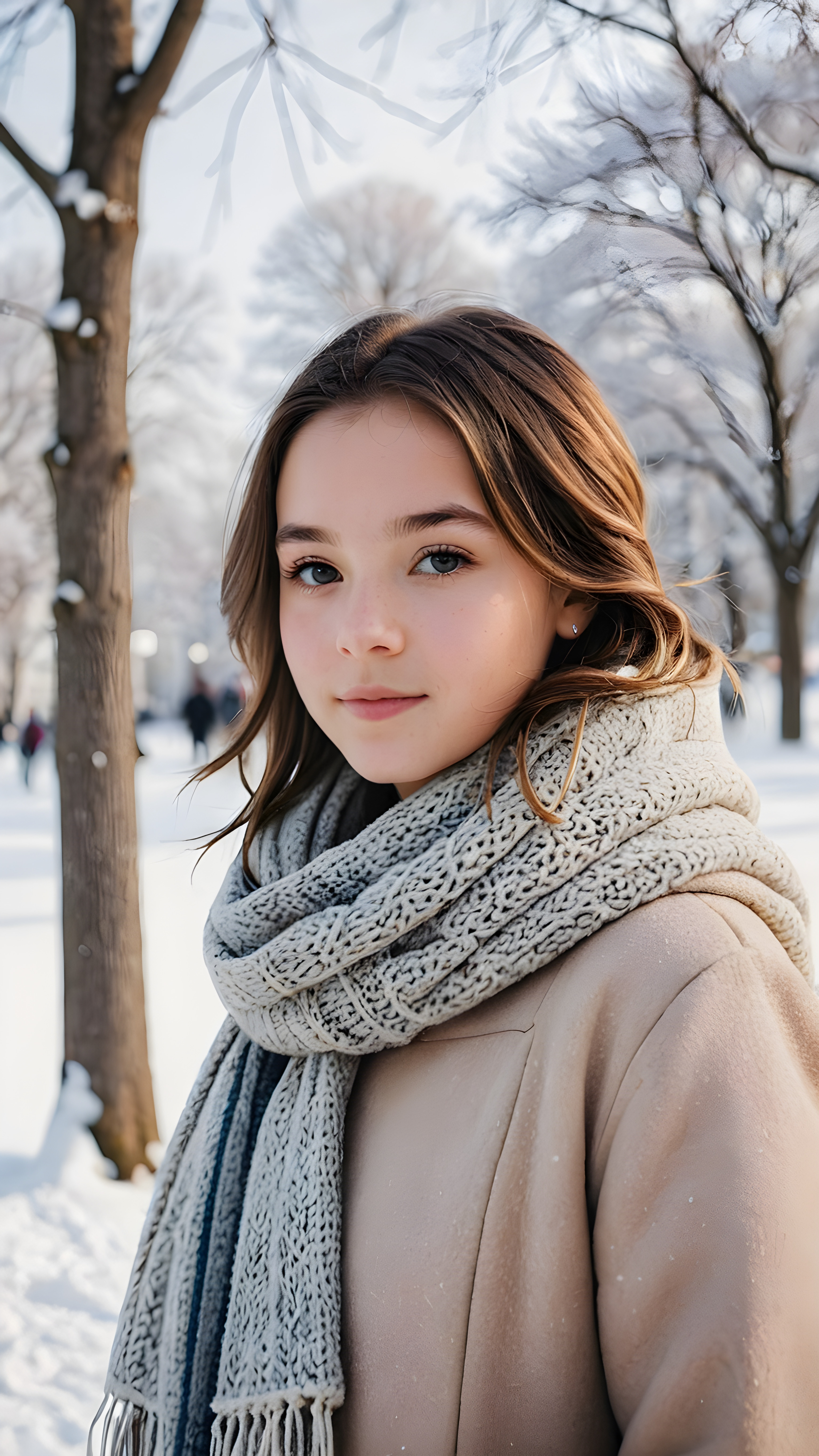 visualize a (((young teen girl))) dressed in a (wears a thick winter coat and a scarf), standing confidently against a (magnificent white backdrop) that suggests tranquility and serenity