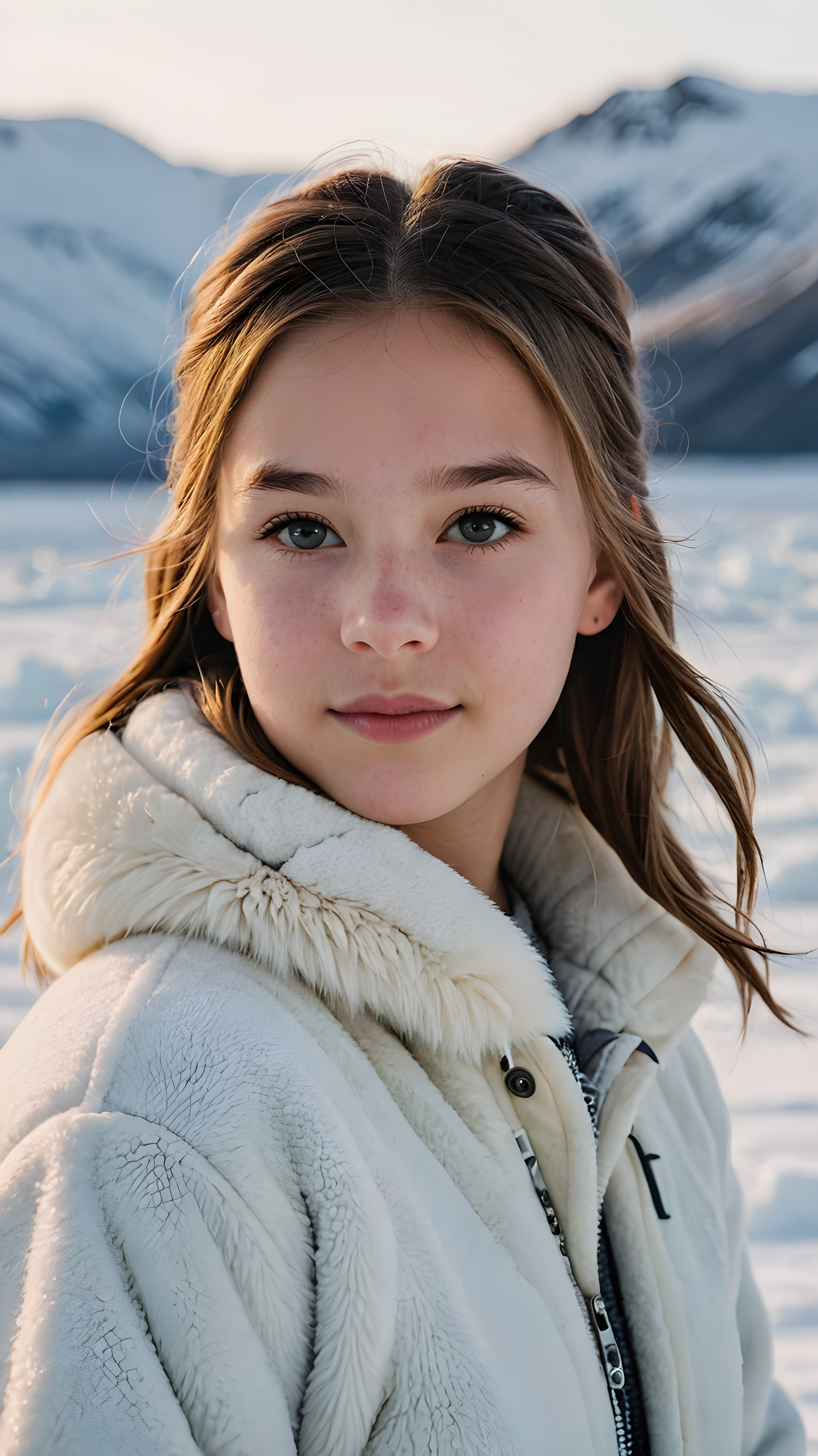 visualize a (((young teen girl))) (in the arctic) (cute) (gorgeous)
